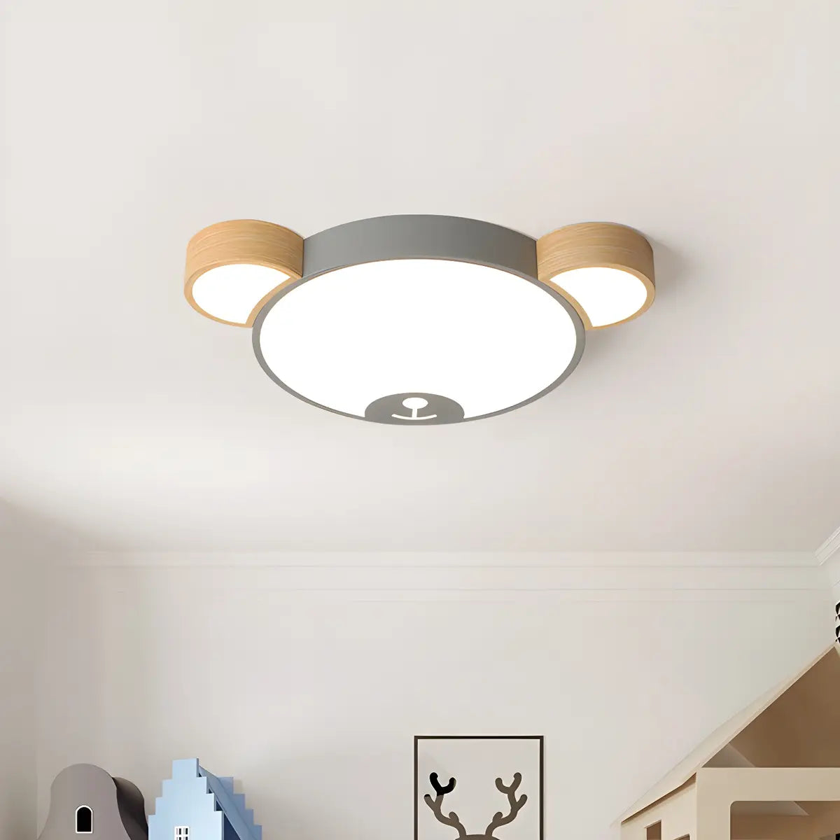 This children's ceiling lamp features a cute bear head shape. The green wood tone is cleverly combined with modern design, instantly lighting up the space and making children's rooms full of vitality and childlike fun.