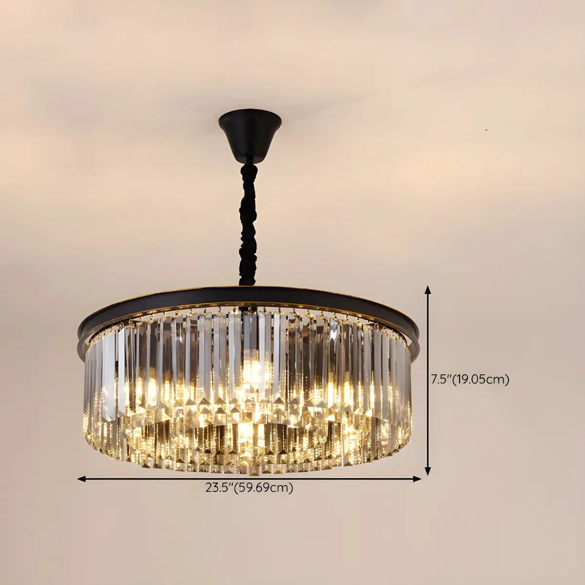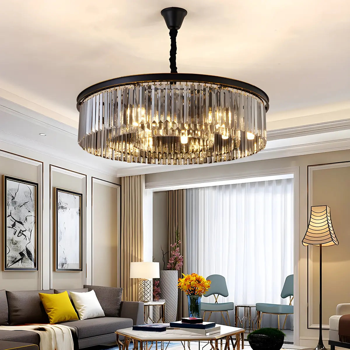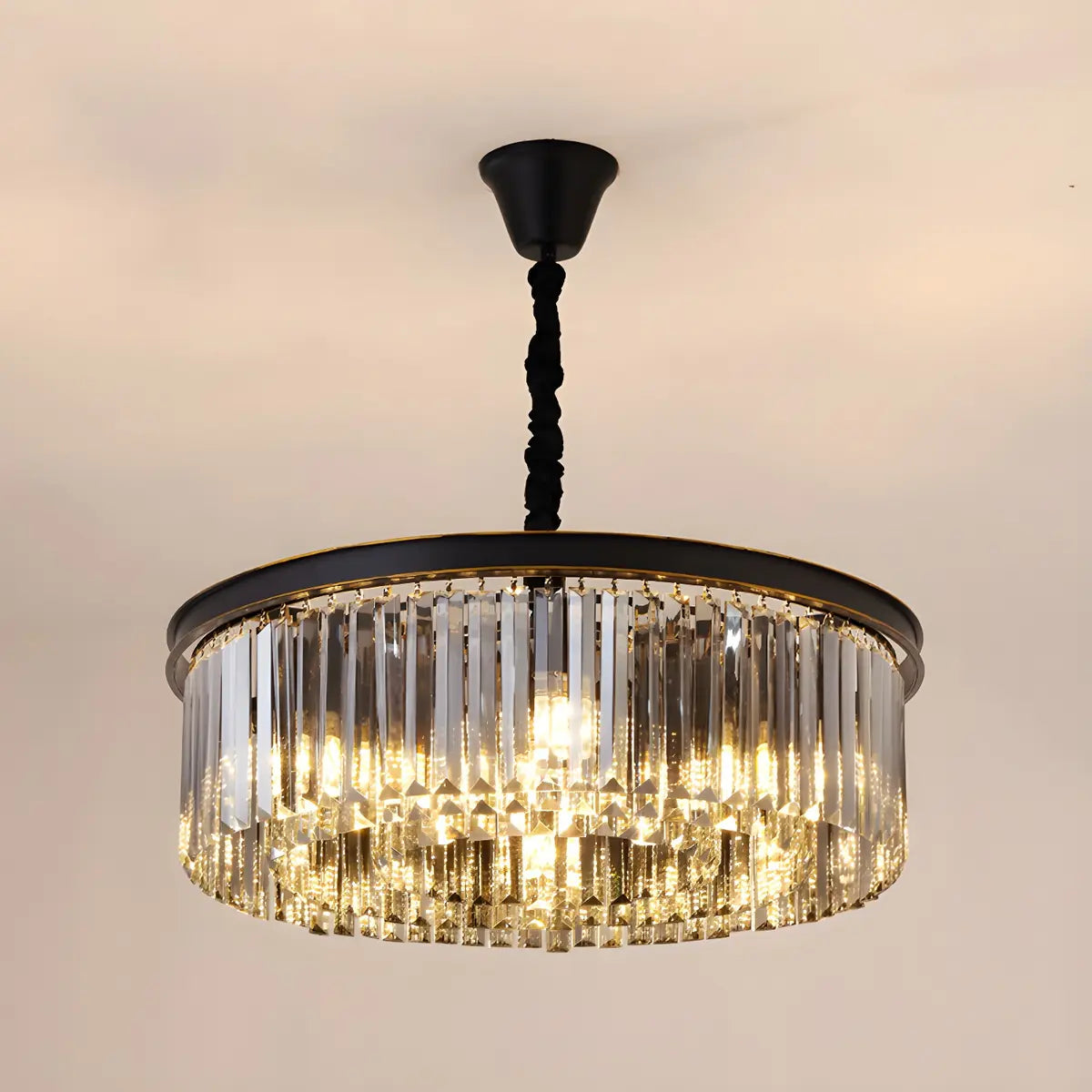 This Black Prismatic Crystal Drum Chandelier is a great choice for modern home decor, adding an air of elegance and luxury to any space.