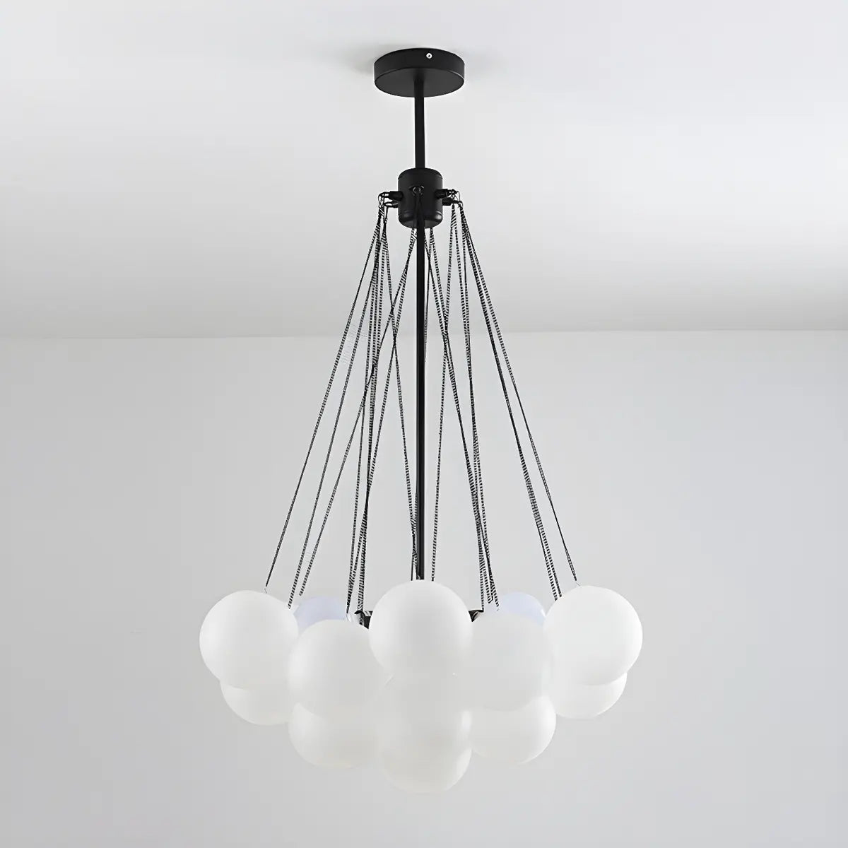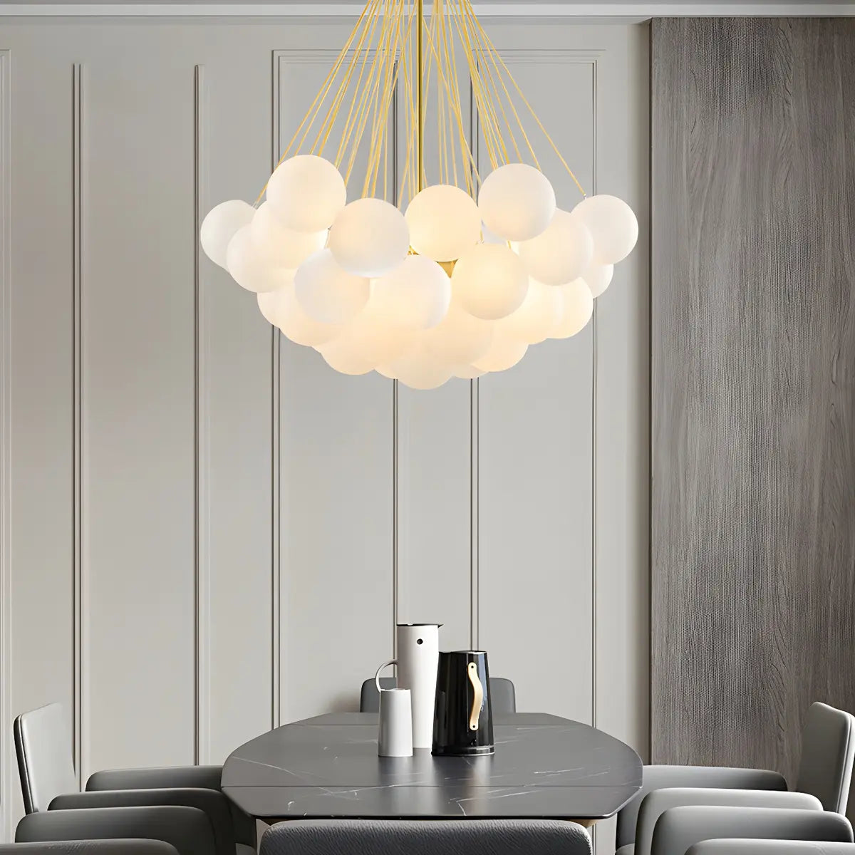 This modern bubble chandelier, with its unique globe-like design and gold frosted glass elements, creates a dreamy and stylish lighting effect, perfect for a dining room centerpiece.