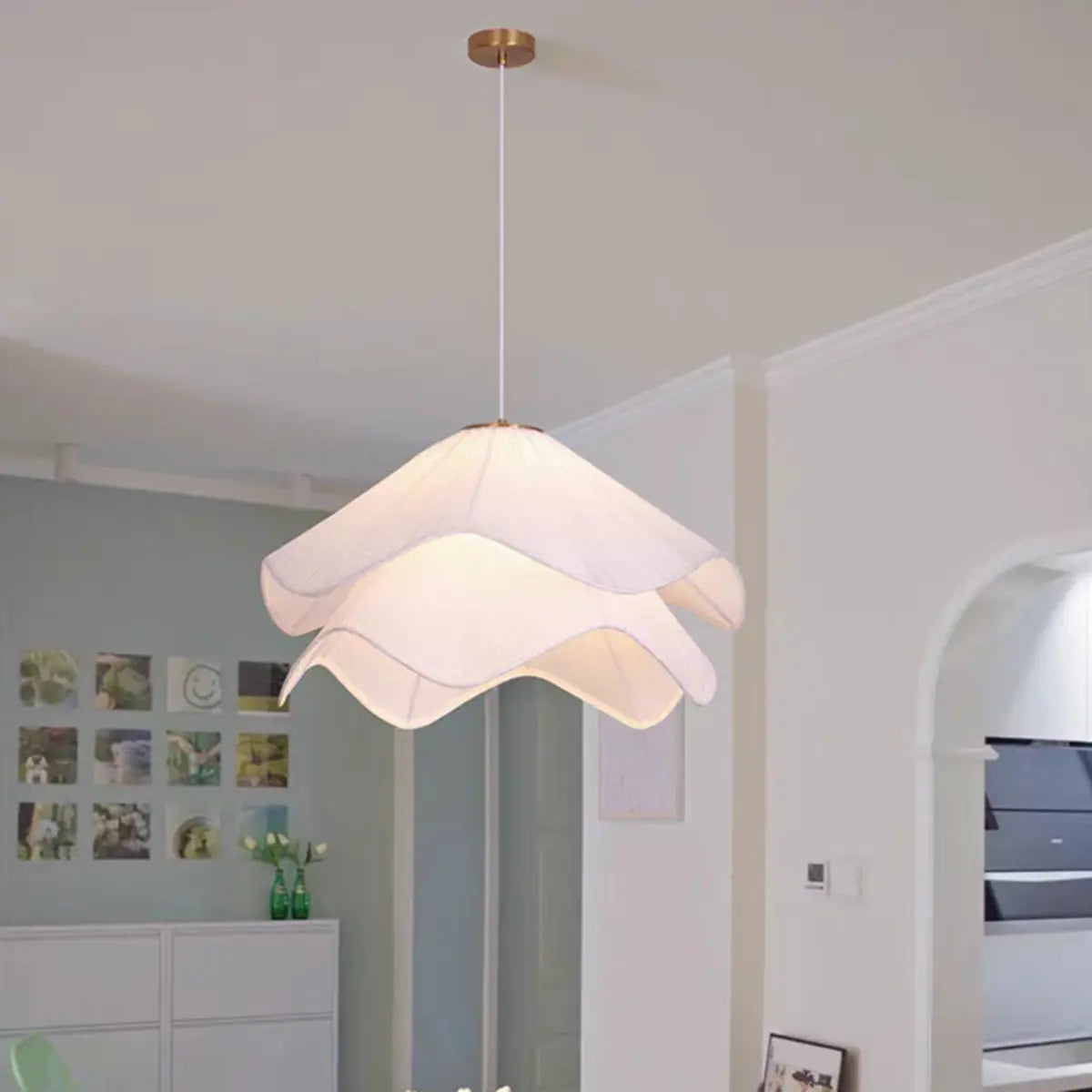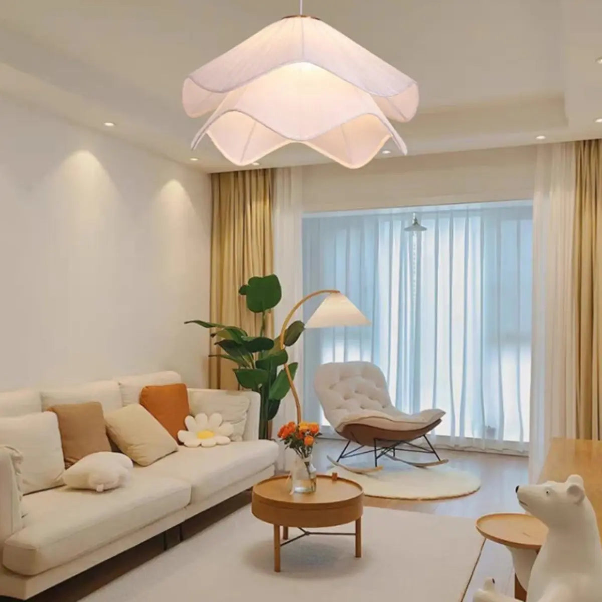 This white fabric pendant light displays unparalleled beauty with its elegant wavy design. The light and layered lampshade hangs in the air like a work of art, adding a warm atmosphere to the home through soft light. It is the perfect embellishment for modern style decoration.
