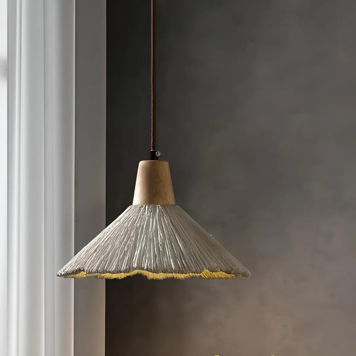 This pendant lamp features a grey plaster and wood conical lampshade for a natural, rustic aesthetic. Its simple, modern design adds an elegant finishing touch to any space, and is particularly suitable for use above a kitchen island to create a warm dining atmosphere.