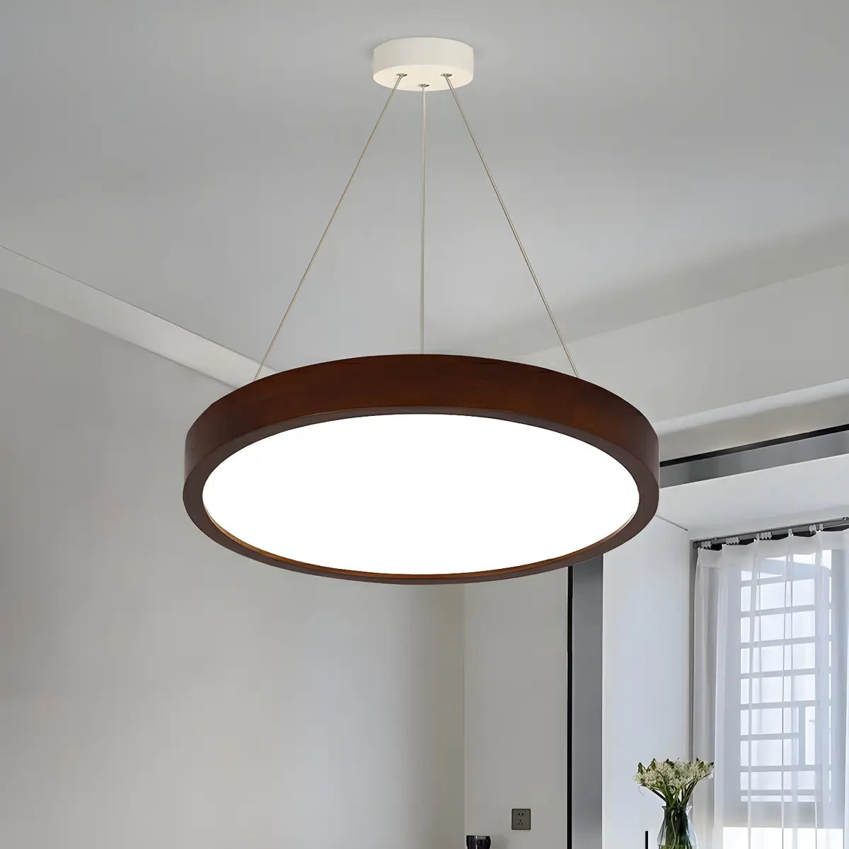 This modern ring chandelier combines wood and acrylic design, adding warmth and modernity to the home space, making it an ideal home decoration choice.