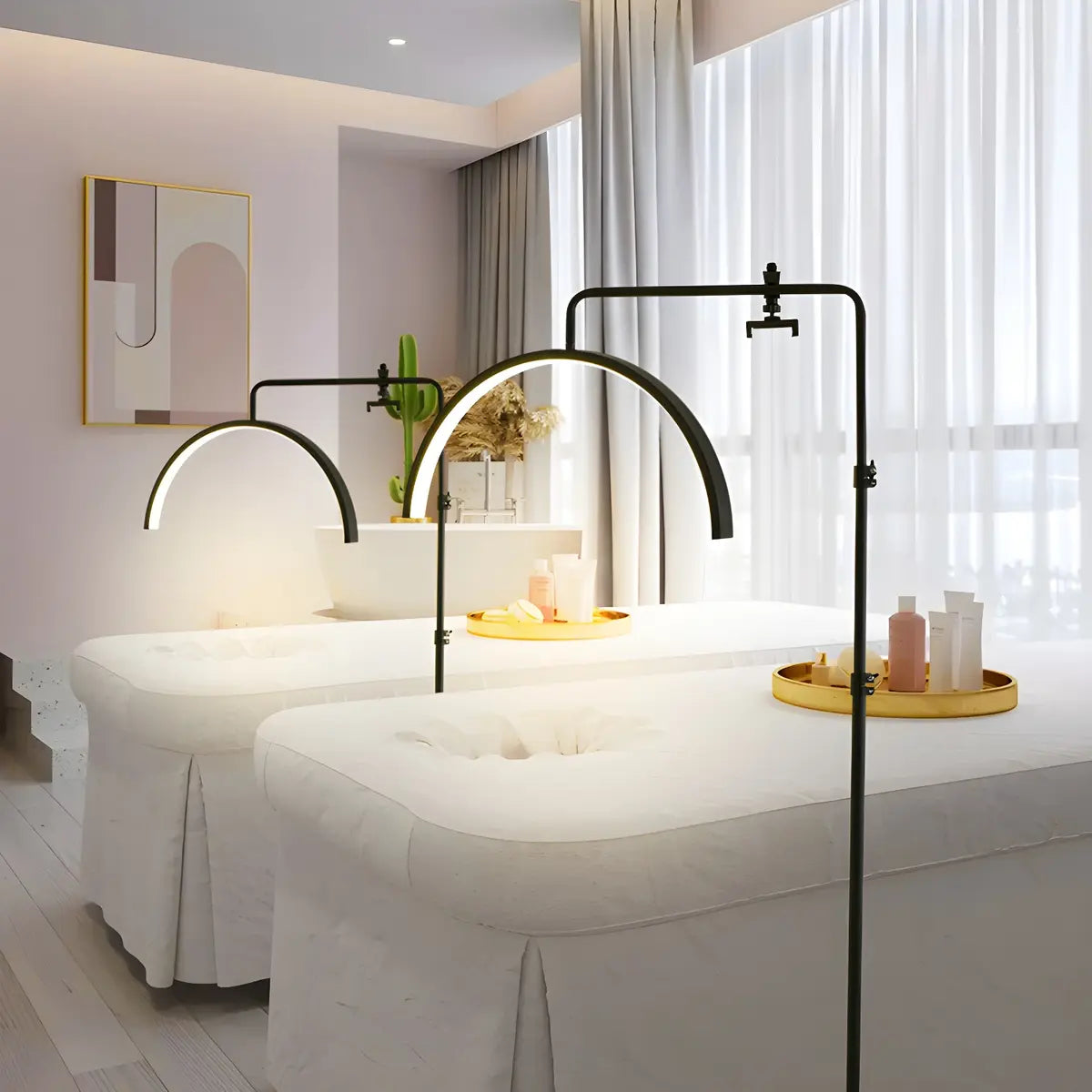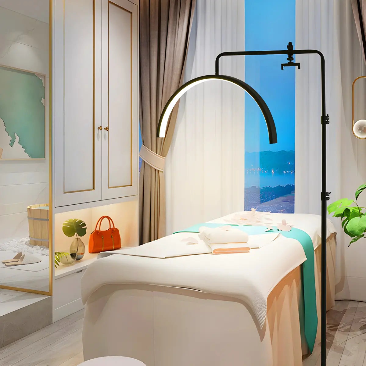 This floor lamp features a modern curved design combined with elegant black metal material, adding a stylish touch to your home space. Its simple and elegant appearance is suitable for various decoration styles, especially for modern and industrial style environments.