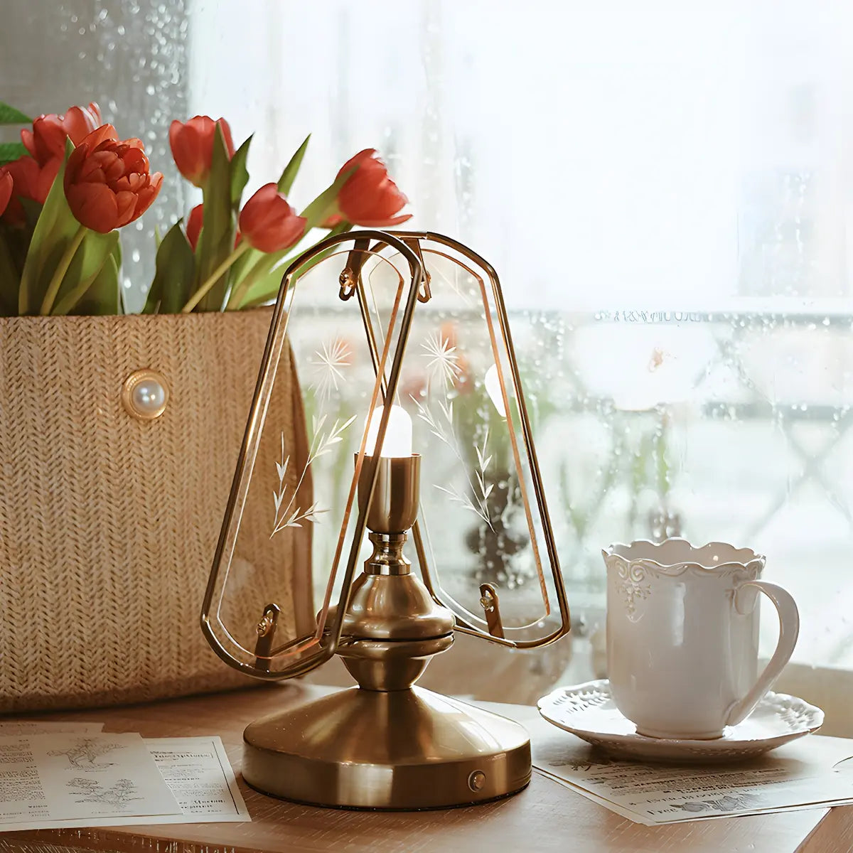 ZOWALA - Antique Brass Vintage Glass Shade Table Lamp