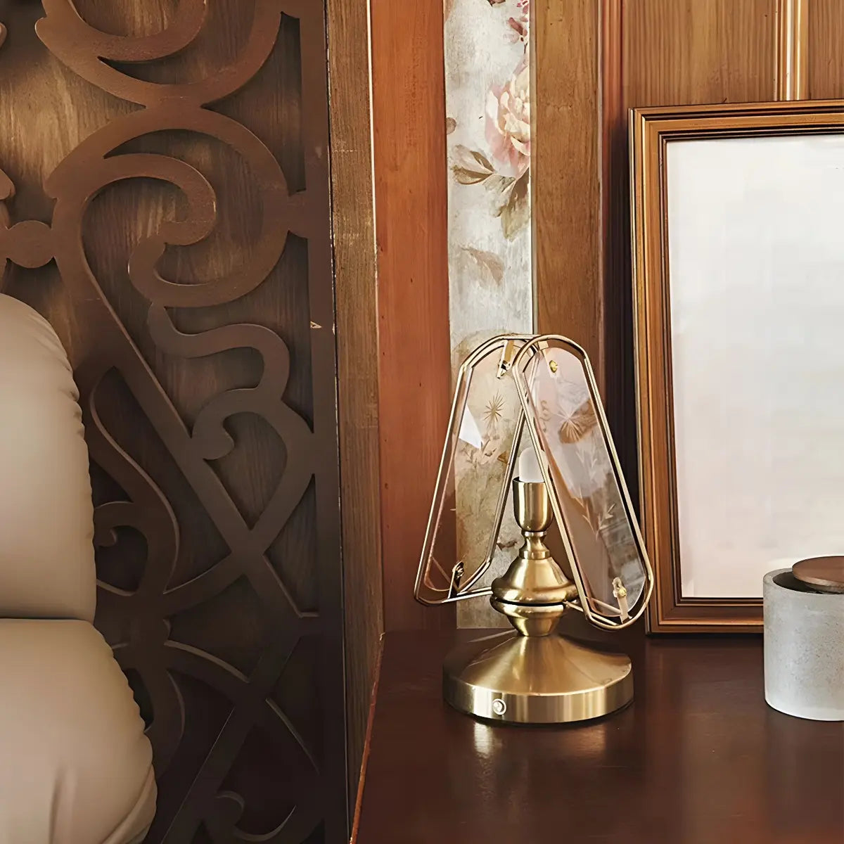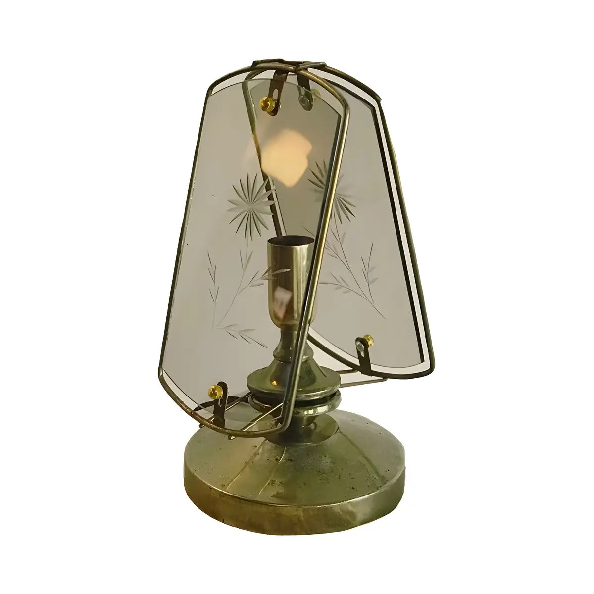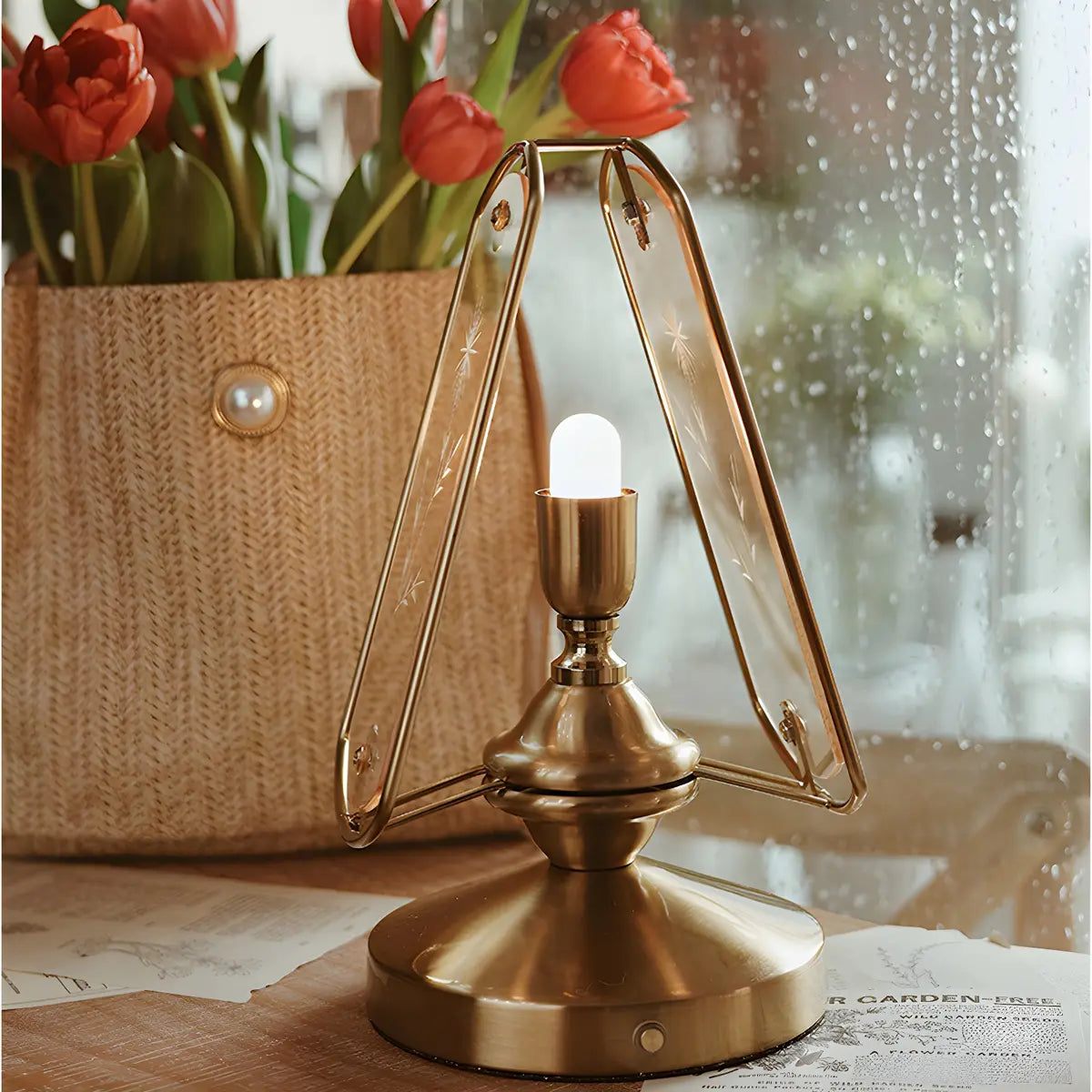 Eye-catching with its artistic triangular brass and glass design, this lamp is perfect for modern home decor.