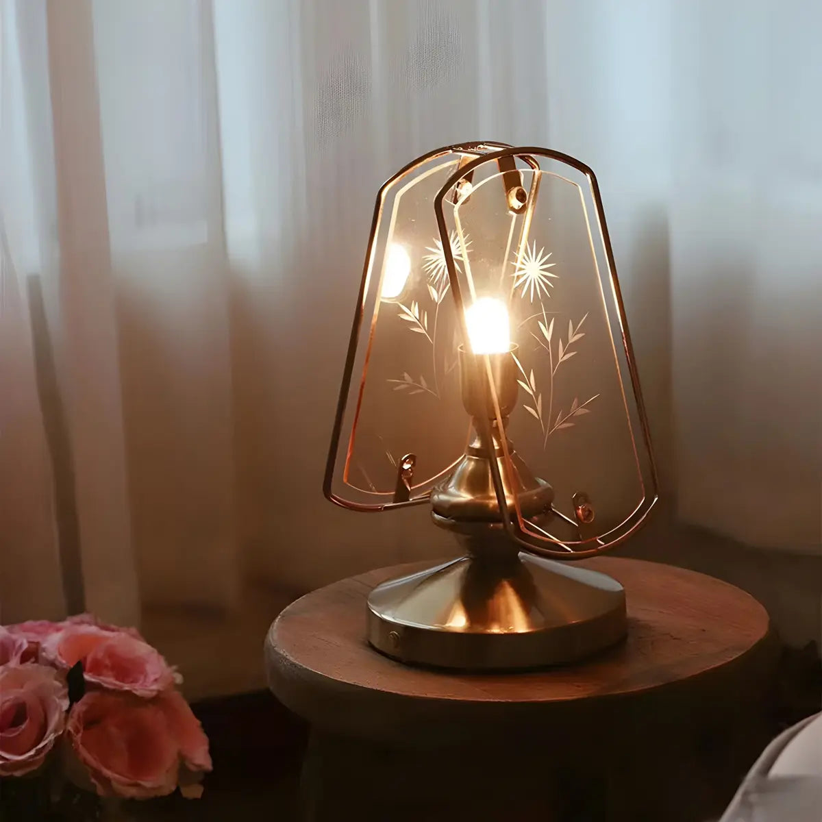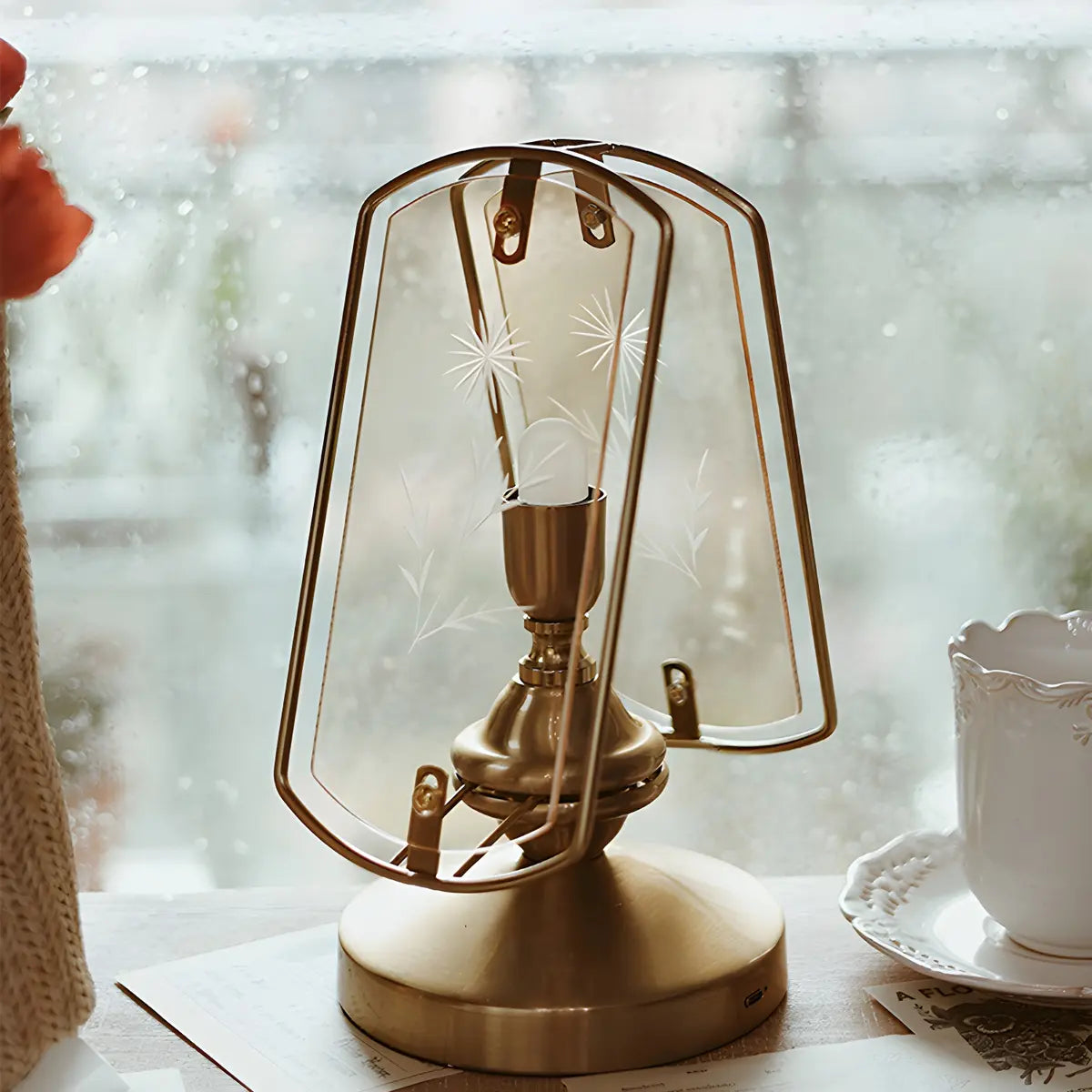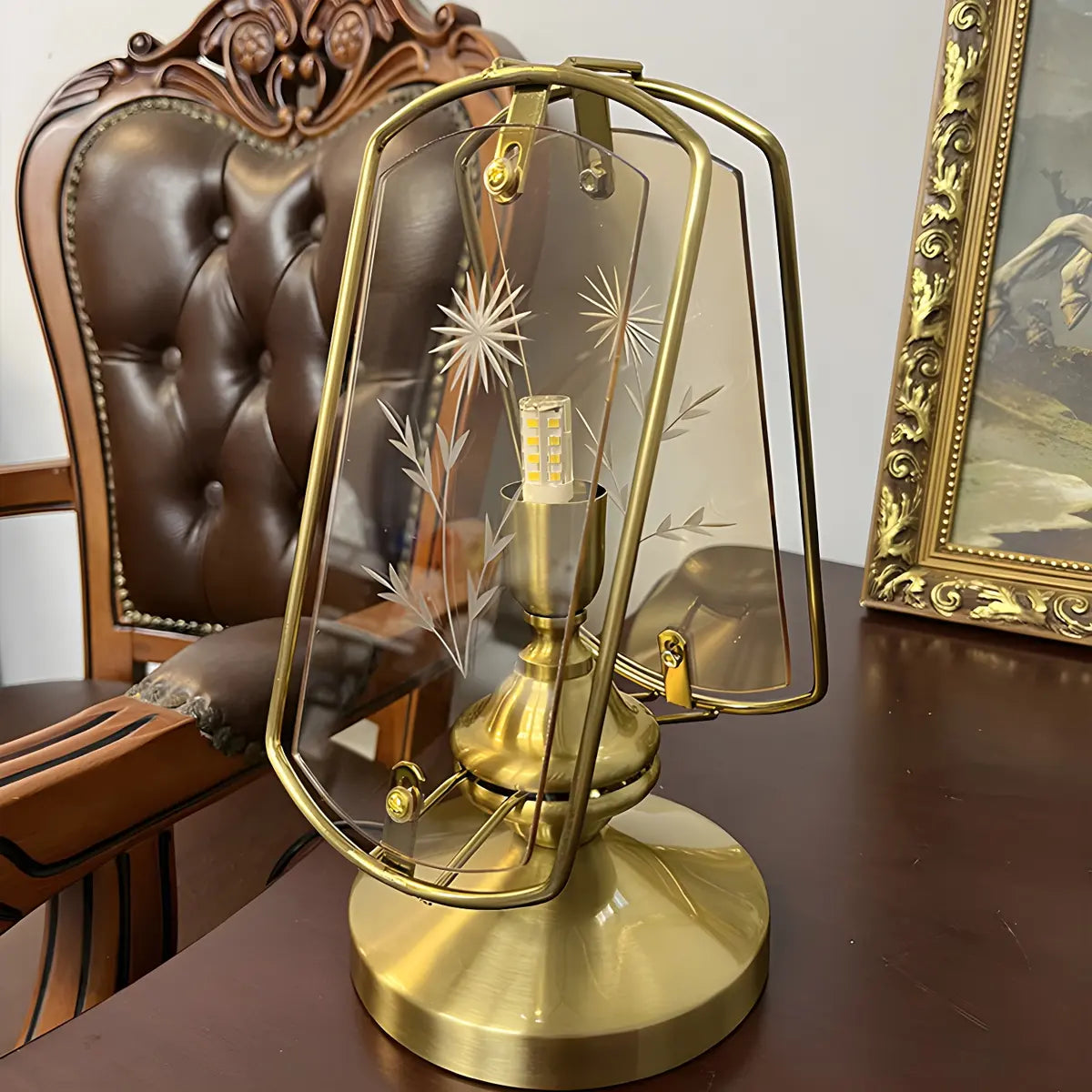 Eye-catching with its artistic triangular brass and glass design, this lamp is perfect for modern home decor.