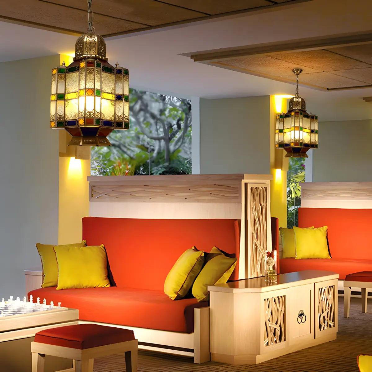 This Art Deco style chandelier adds a touch of classic elegance to any space with its unique brass lantern design. Whether it is a restaurant or a lounge area, it can become a visual focal point in the space.