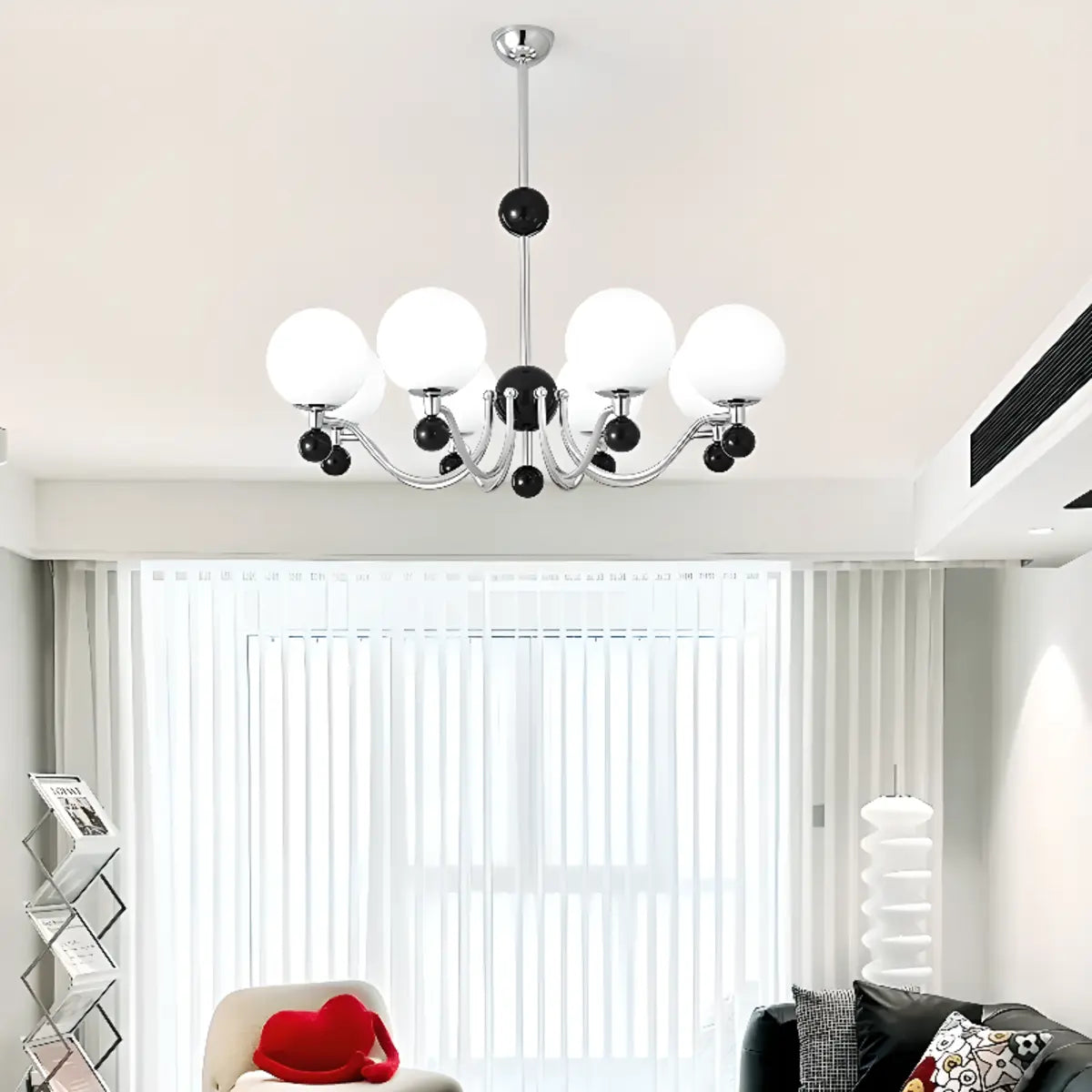 This modern black spherical chandelier will be the highlight of your living room with its unique design and exquisite appearance. The metal material creates a sturdy and durable structure, combining fashion with practicality.