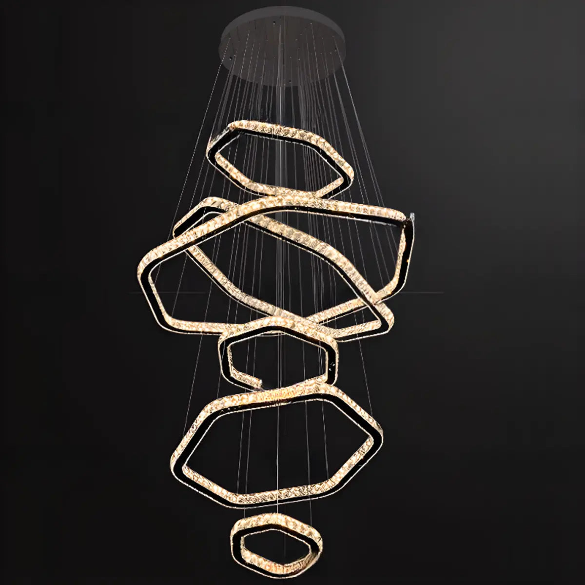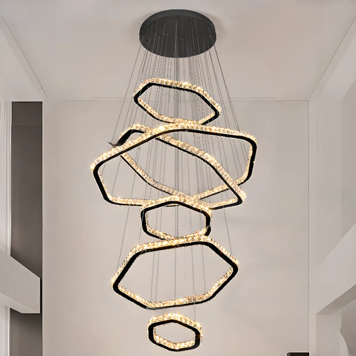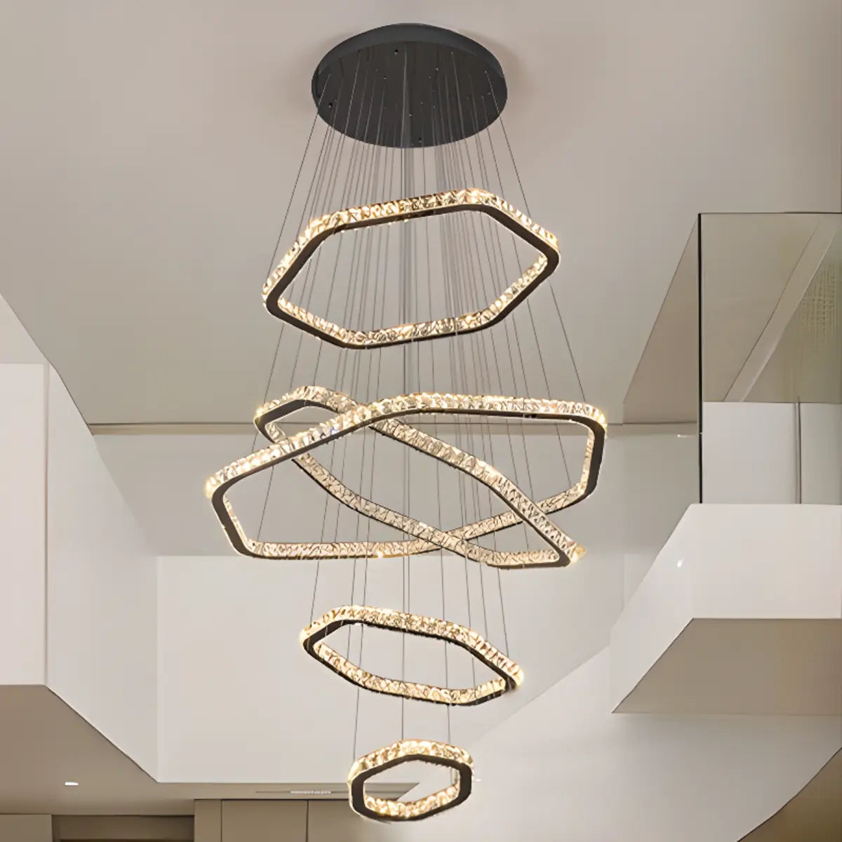 This geometric crystal LED chandelier combines modernity and luxury through its unique multi-layered design, giving the space a refreshing visual effect, suitable for living rooms, dining rooms or front rooms.