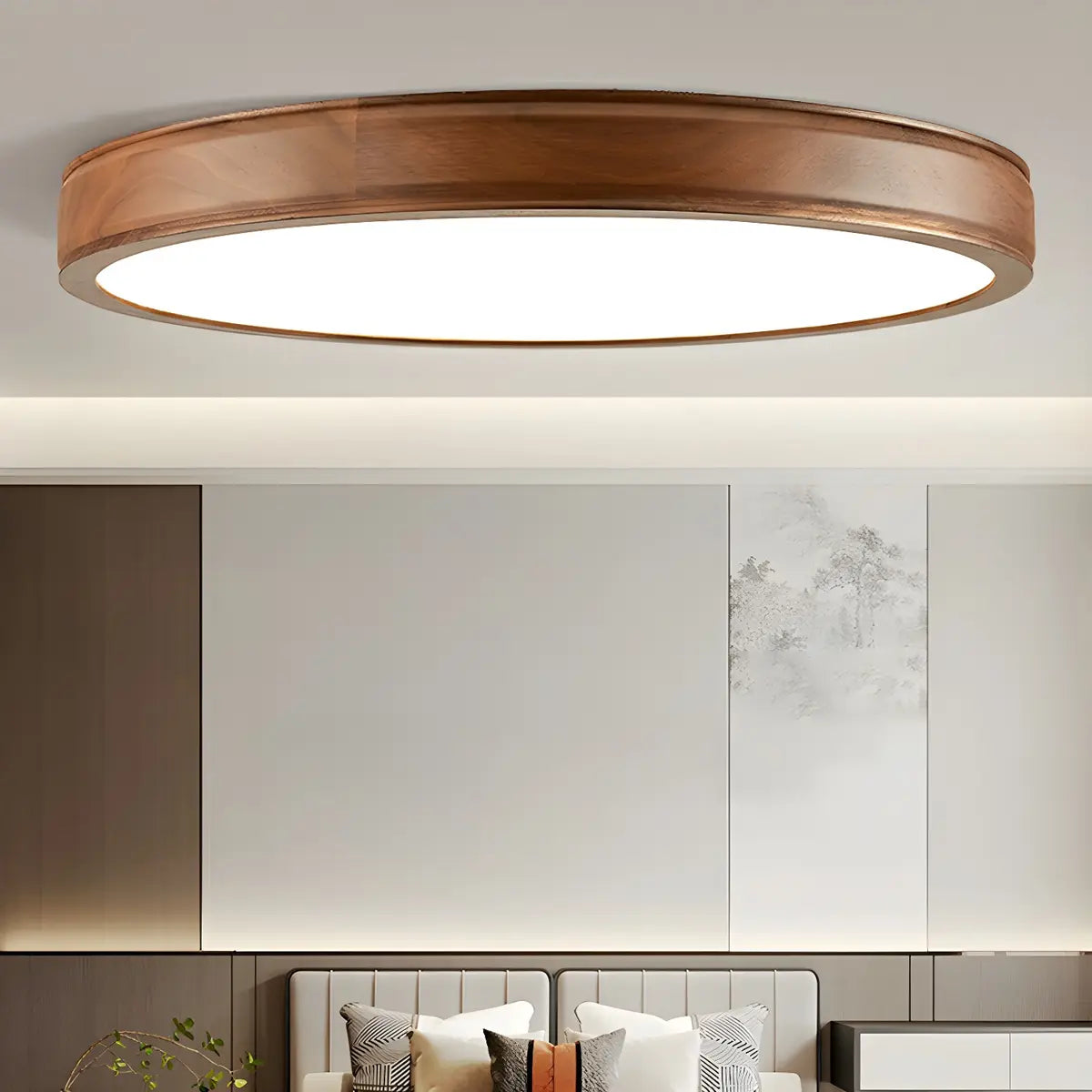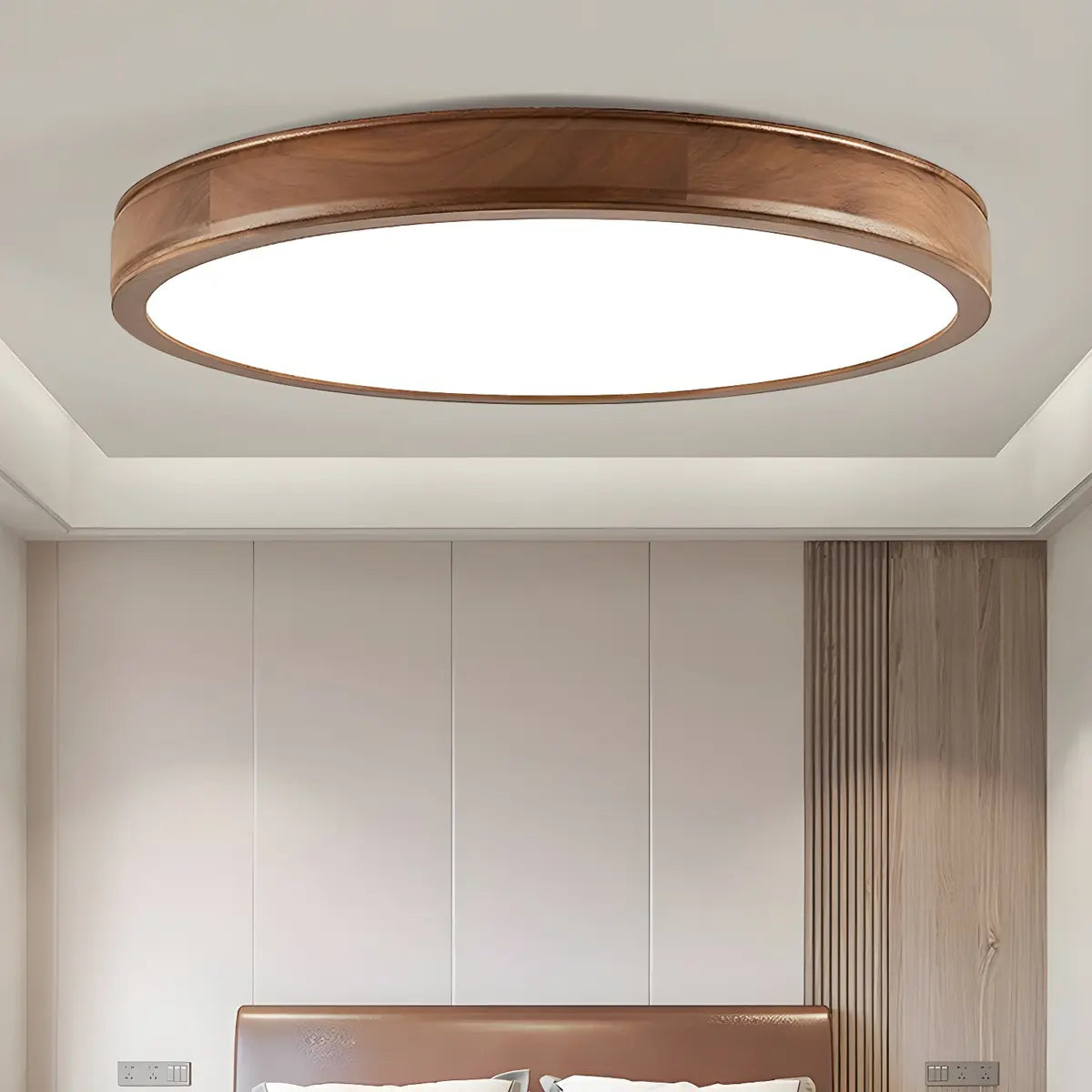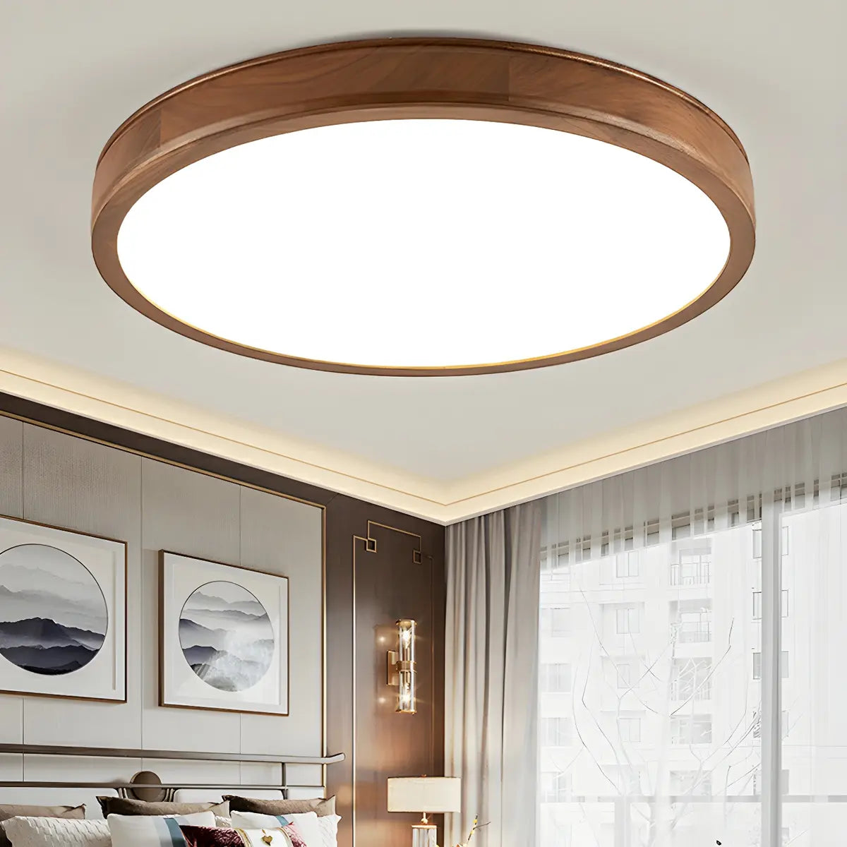 This modern round ceiling lamp is like a pearl hanging from the ceiling, emitting a warm and soft light, blending seamlessly into the space. The lamp is made of natural brown wood material, which forms a sharp contrast with the white acrylic lampshade, highlighting the perfect combination of nature and modern art.