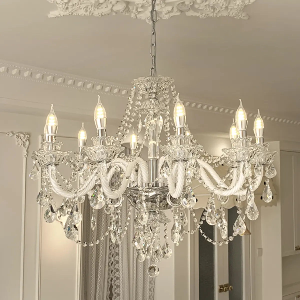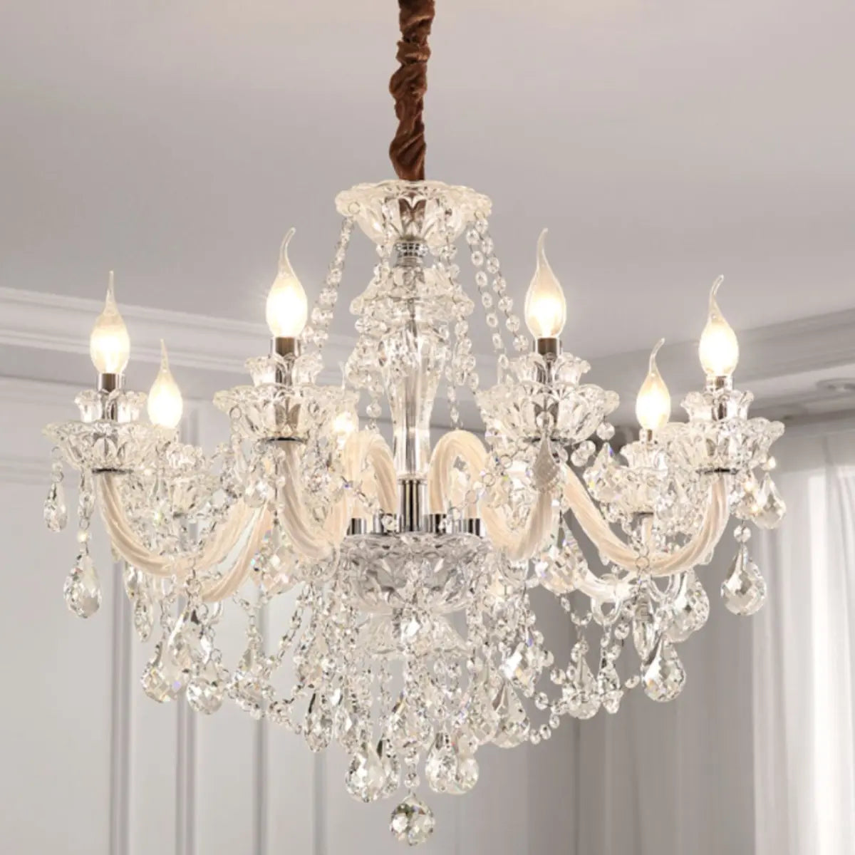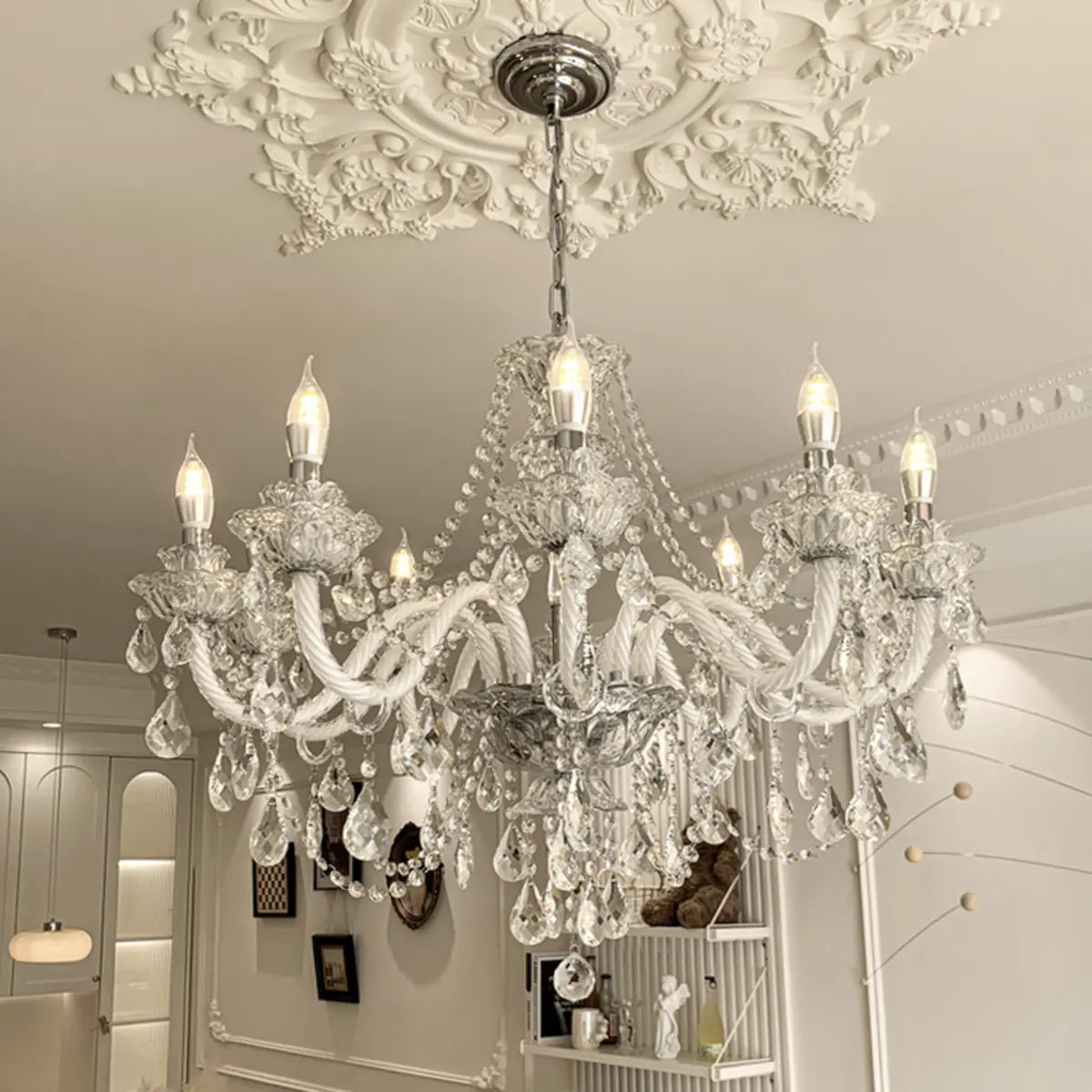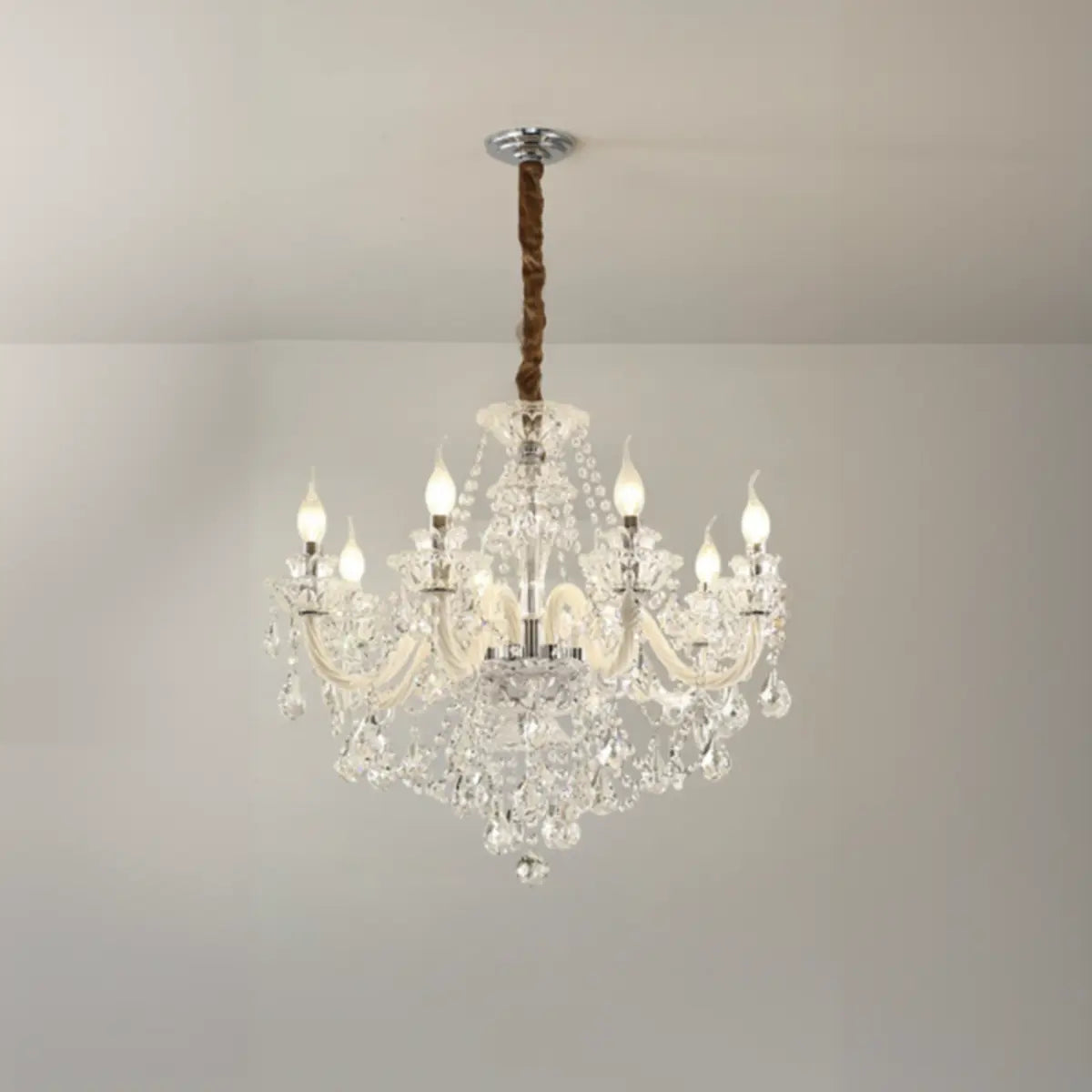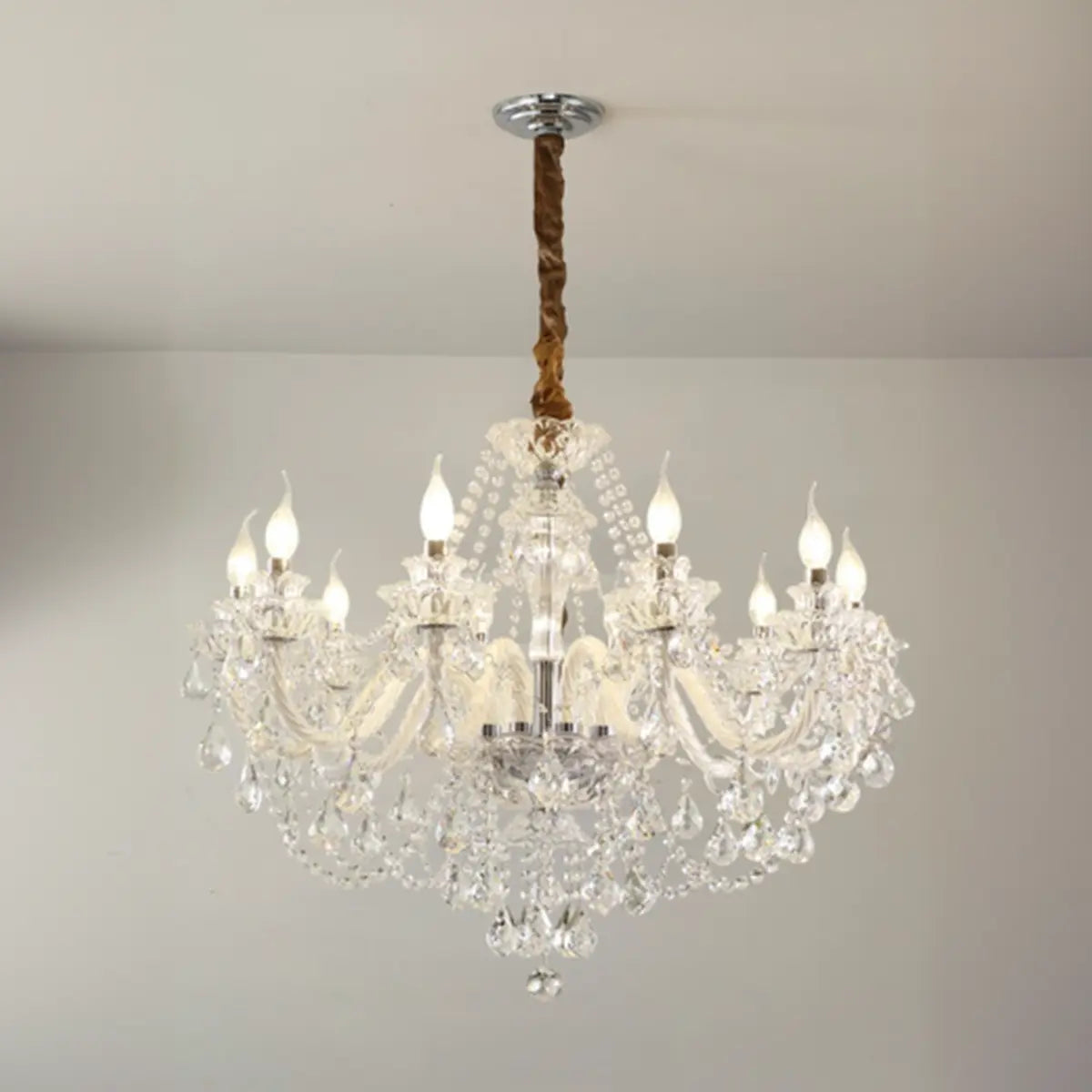 This classic crystal chandelier features a geometric structure and classic candlestick design, perfectly combining modern and vintage styles, becoming the highlight of any luxurious space. The dazzling crystals softly scatter light around the room, creating an elegant and warm atmosphere.