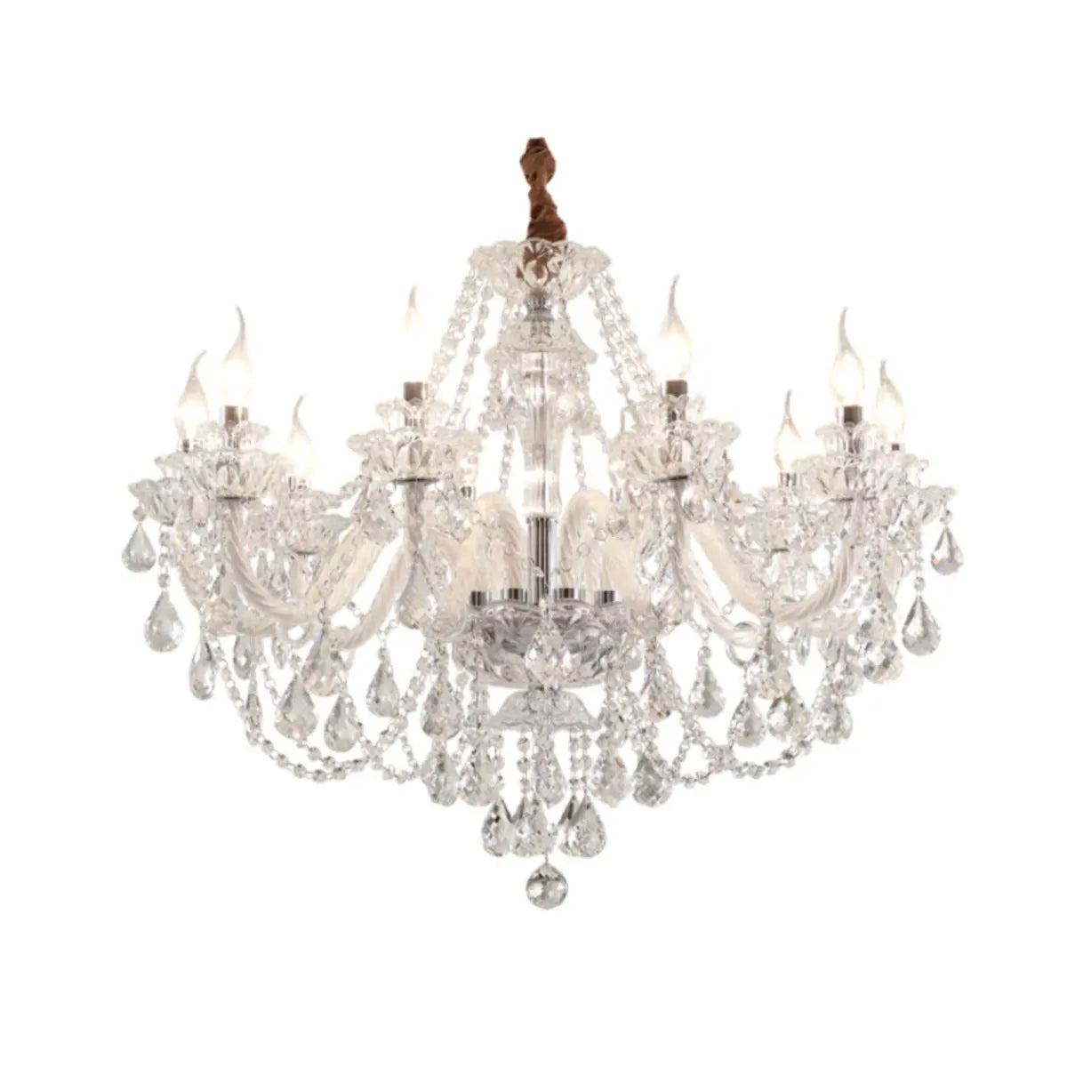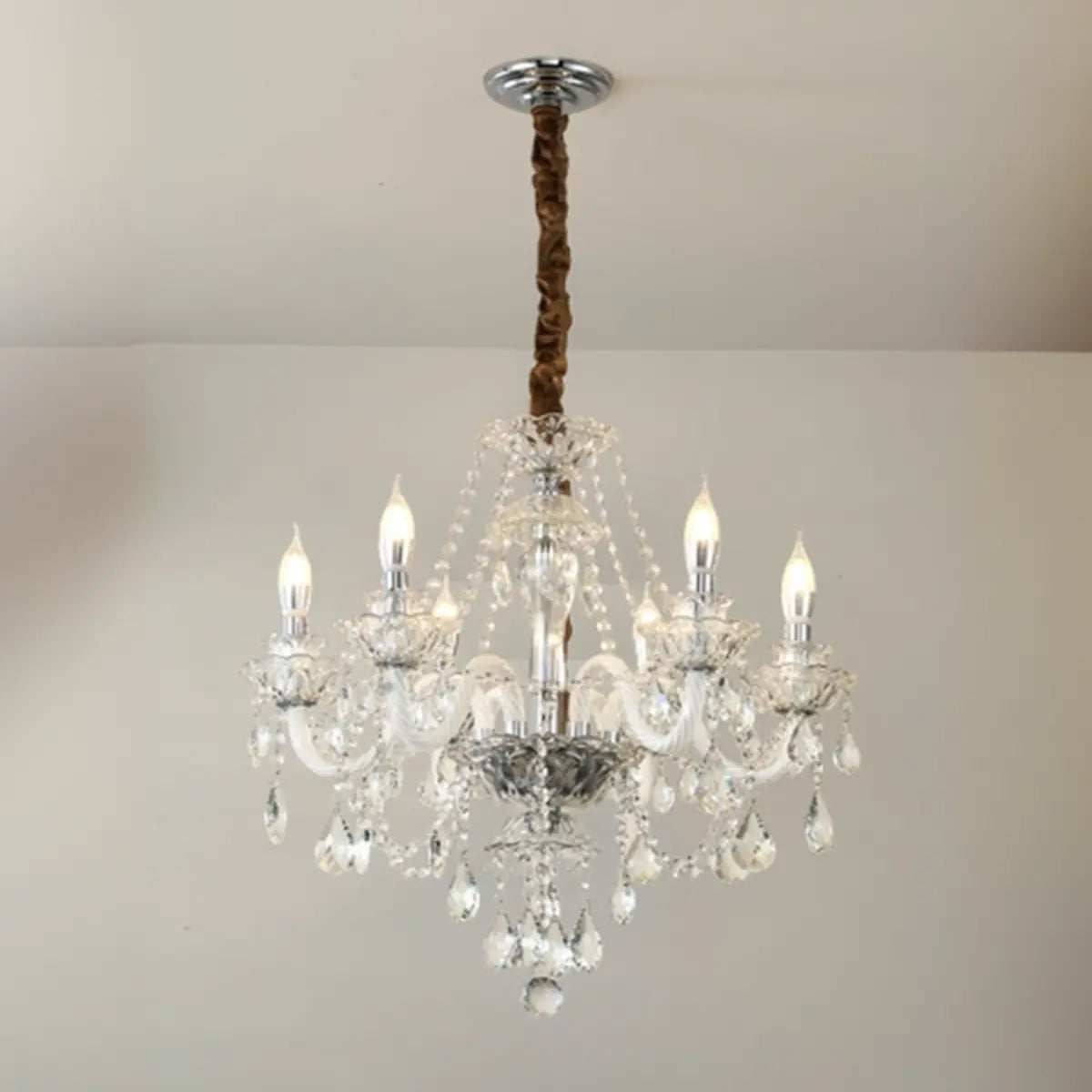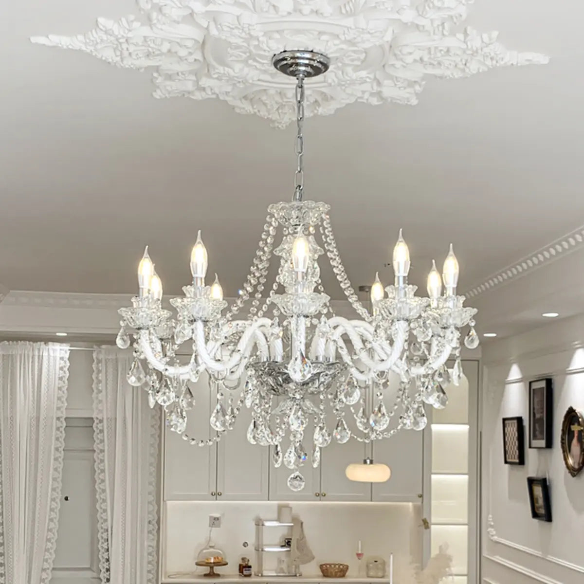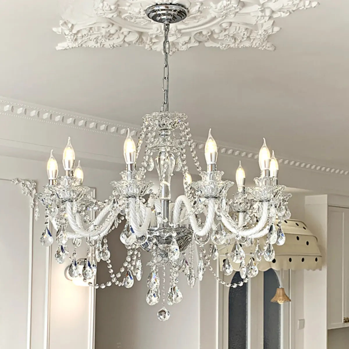 This classic crystal chandelier features a geometric structure and classic candlestick design, perfectly combining modern and vintage styles, becoming the highlight of any luxurious space. The dazzling crystals softly scatter light around the room, creating an elegant and warm atmosphere.