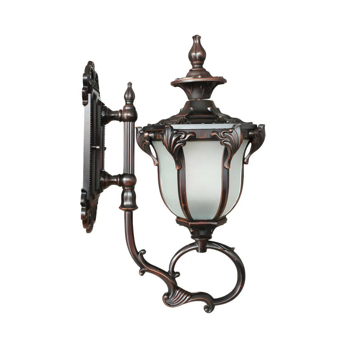 This vintage-style wall lamp features gold-tone metal and a glass shade for an elegant decorative effect, perfect for outdoor settings.