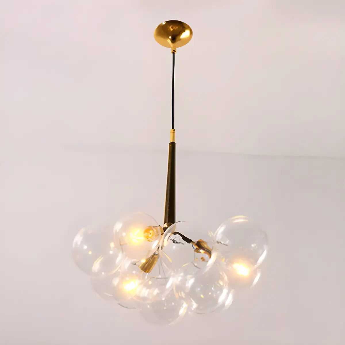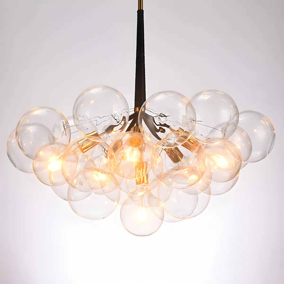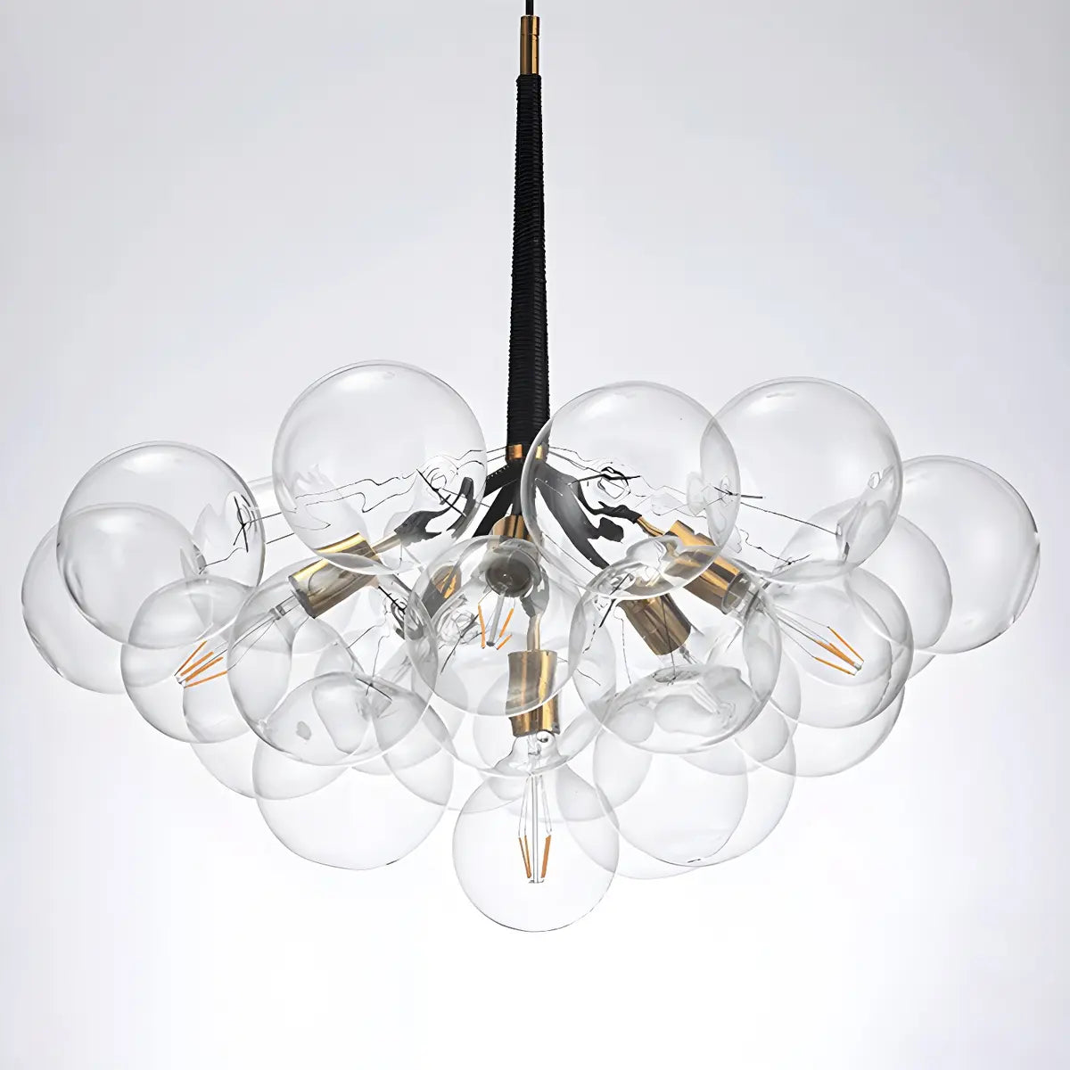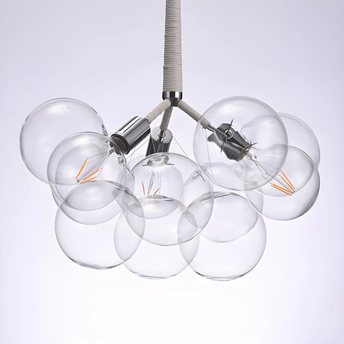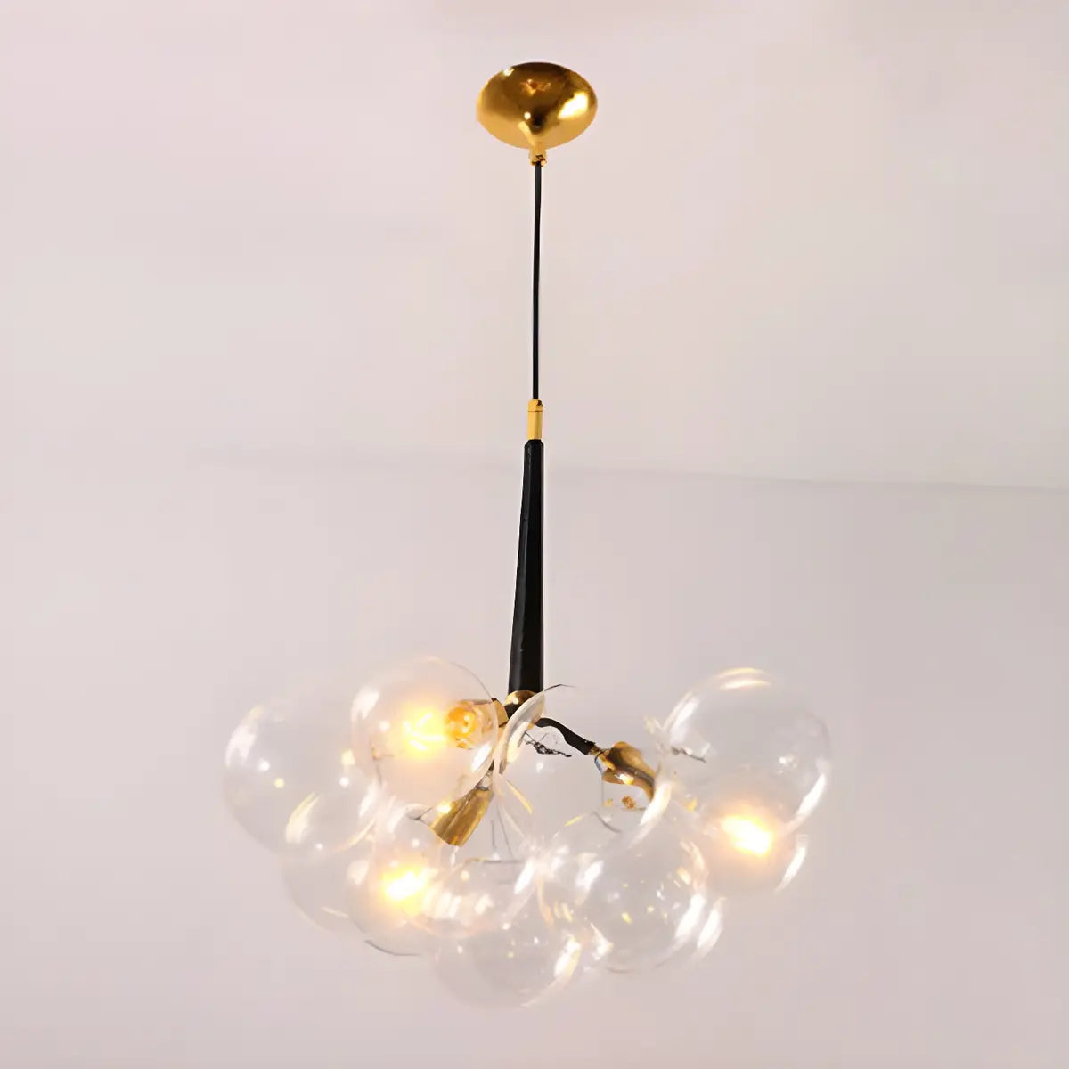 This chandelier adopts a unique bubble-shaped spherical design, consisting of multiple transparent glass spheres. It has a unique shape and strong visual impact.