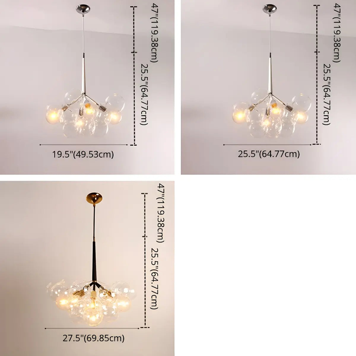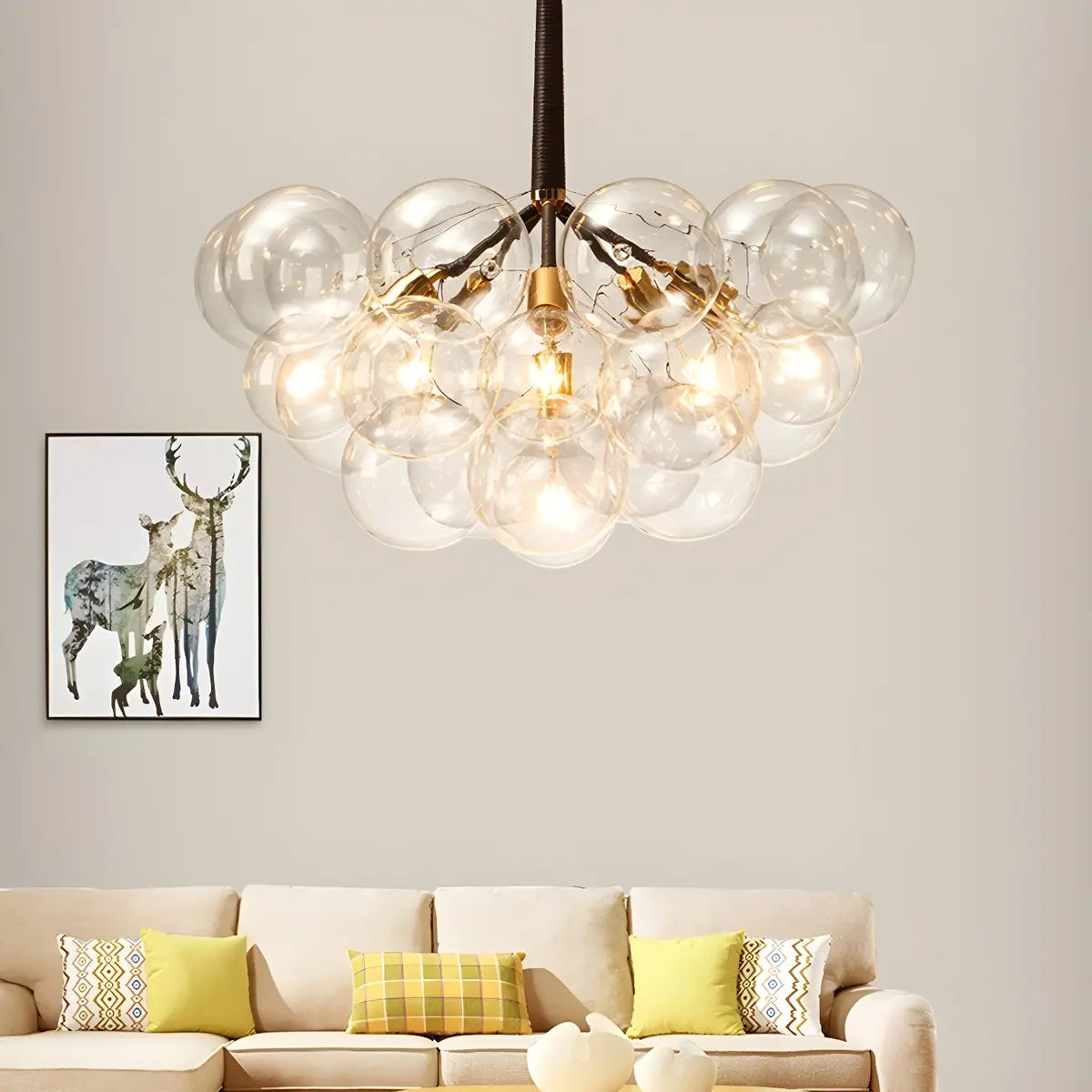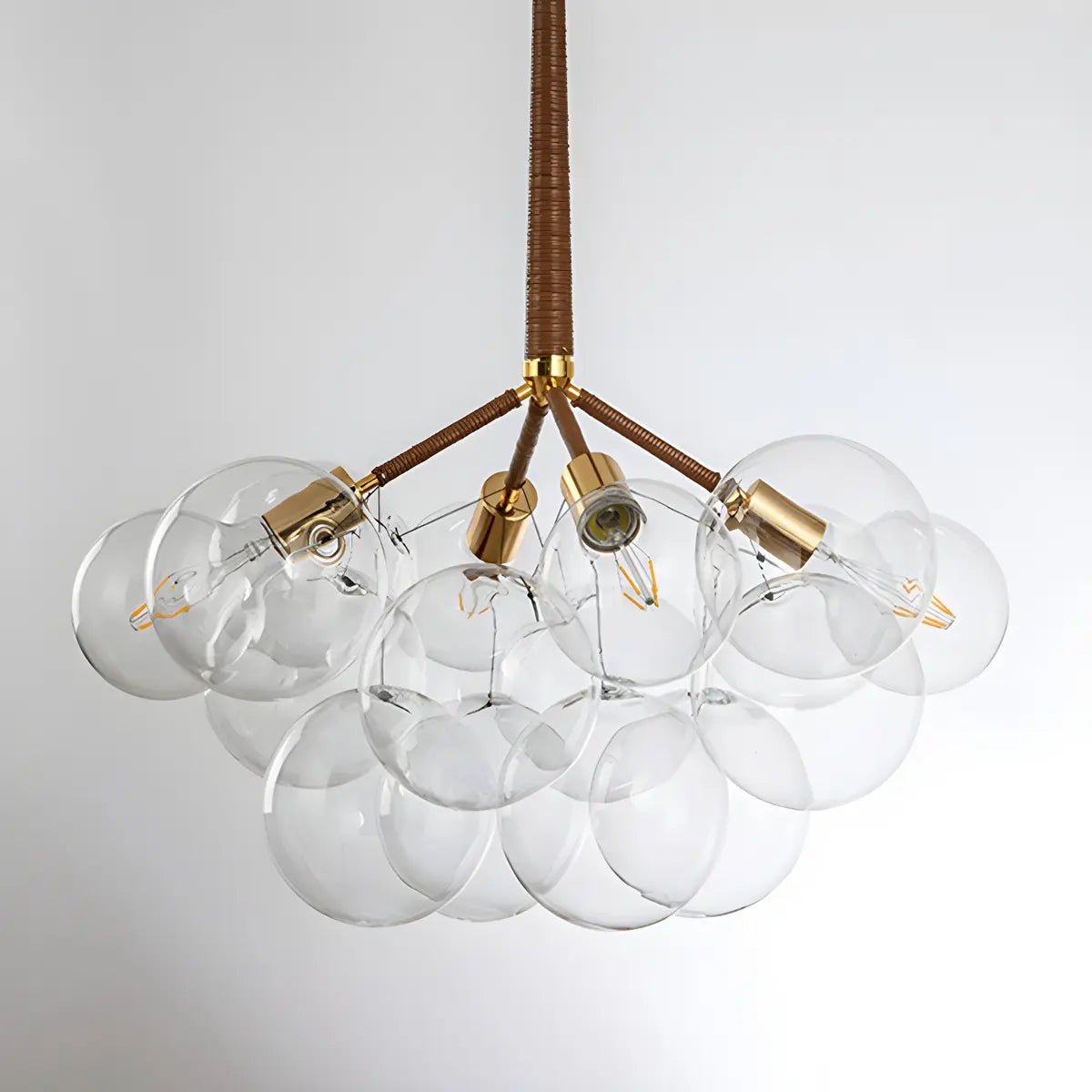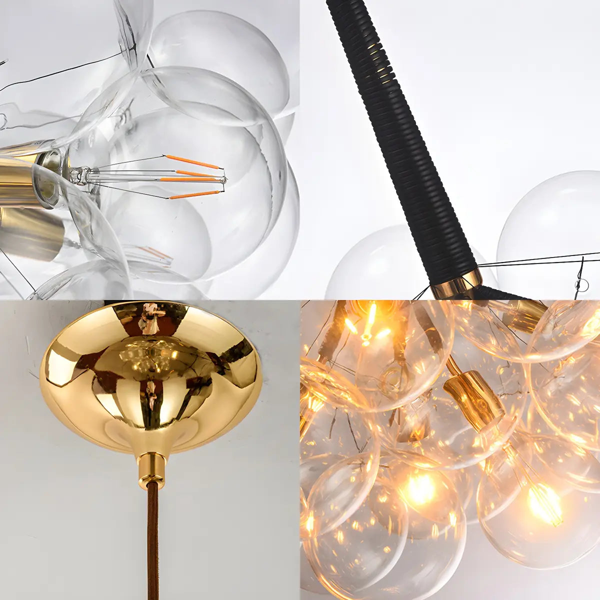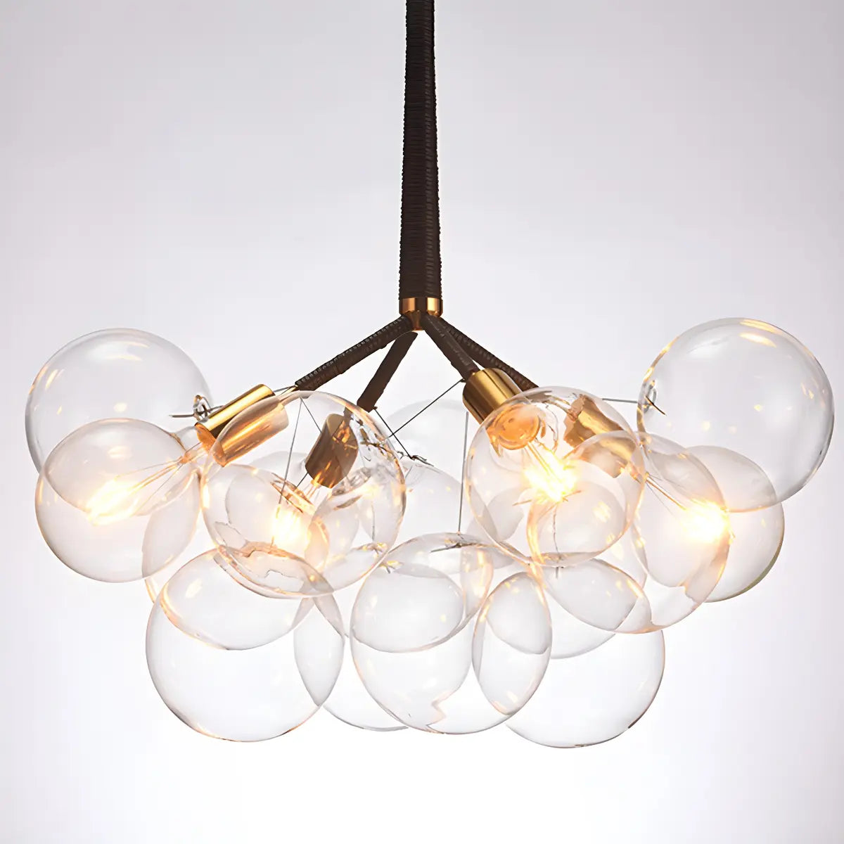 This chandelier adopts a unique bubble-shaped spherical design, consisting of multiple transparent glass spheres. It has a unique shape and strong visual impact.