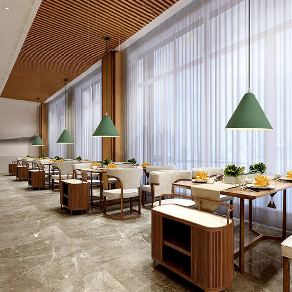 This modern minimalist style aluminum cone chandelier, with its unique geometric shape and stylish color design, creates a modern atmosphere for the interior space.