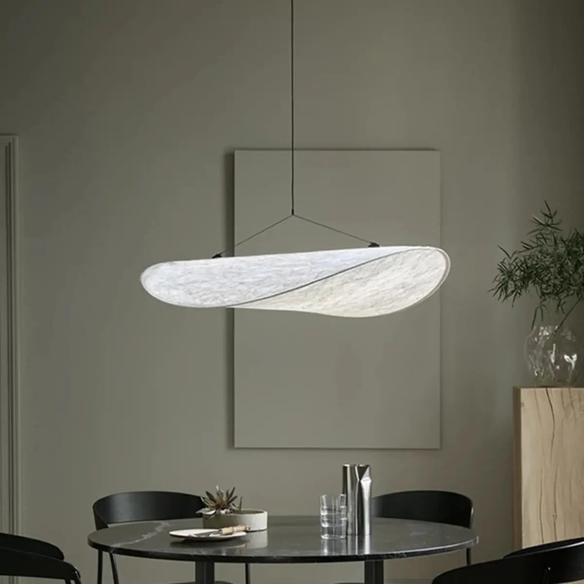 This pendant light features an elegant curved silk lampshade, which looks like a light white cloud hanging in the air, adding a soft and modern touch to your kitchen space. The pure white of the lampshade combined with the silk material not only enhances the softness of the light, but also brings unparalleled visual enjoyment to the home environment.