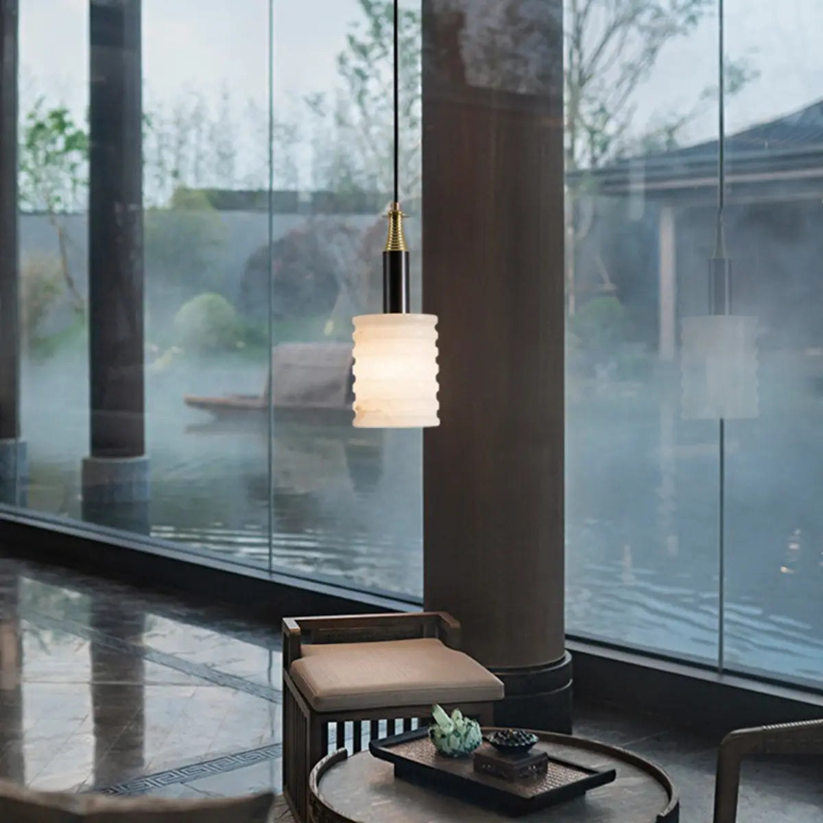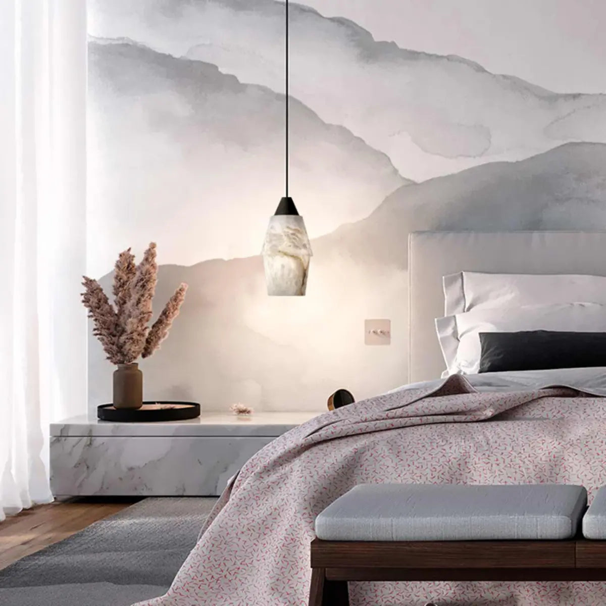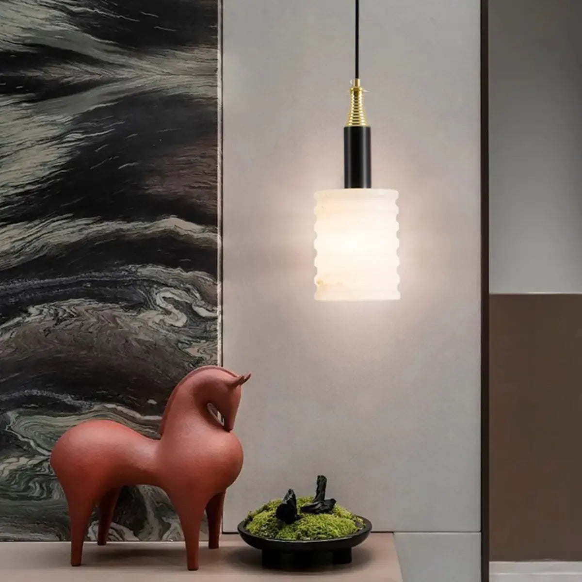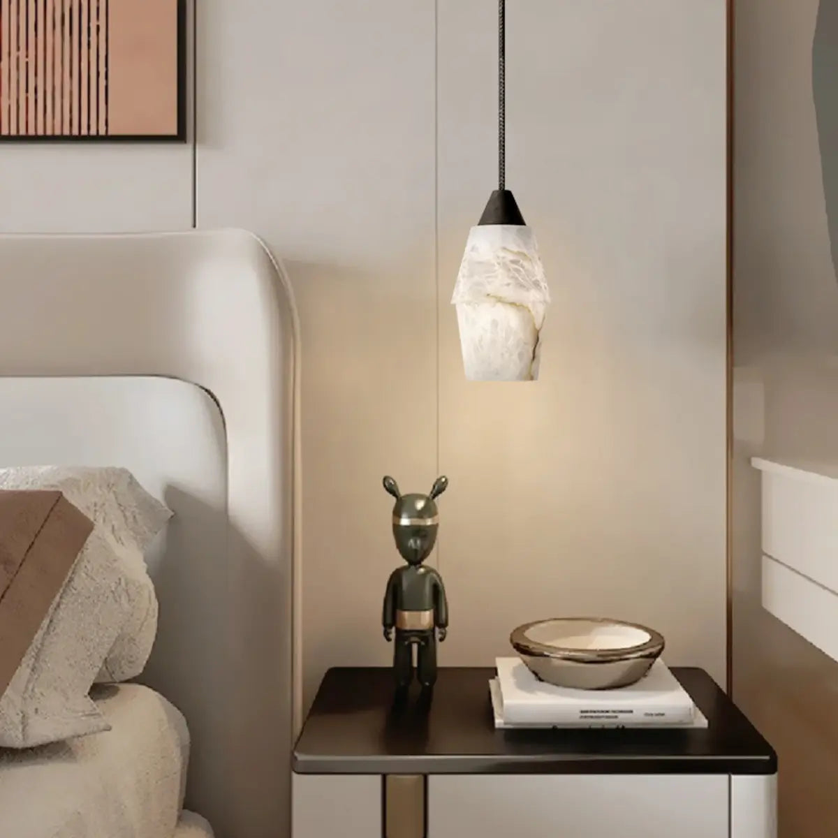 This pendant light is made of an elegant white stone lampshade, presenting a jade-like texture, perfectly combining modern and simple design with elegant artistic atmosphere. From its light and smooth dome shape to the unique texture under the interweaving of light and shadow, every detail exudes an intoxicating beauty. It is not only a lighting tool, but also an indispensable decorative artwork in the space.