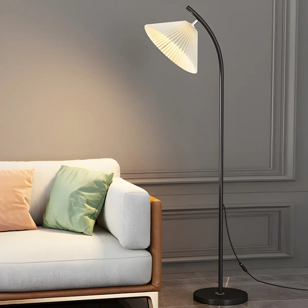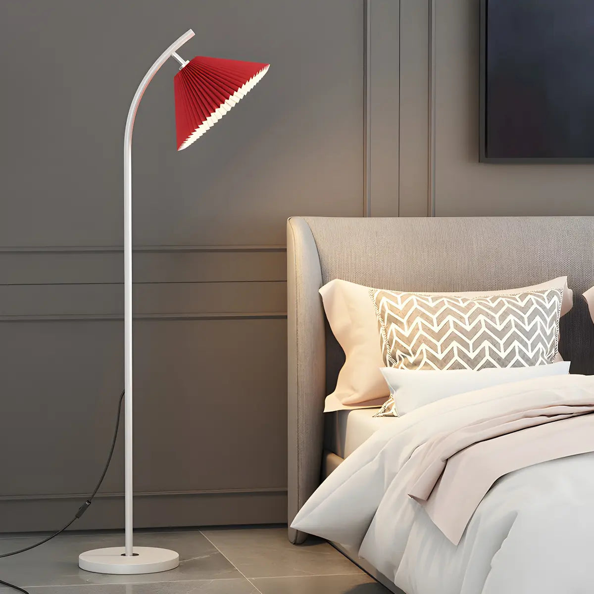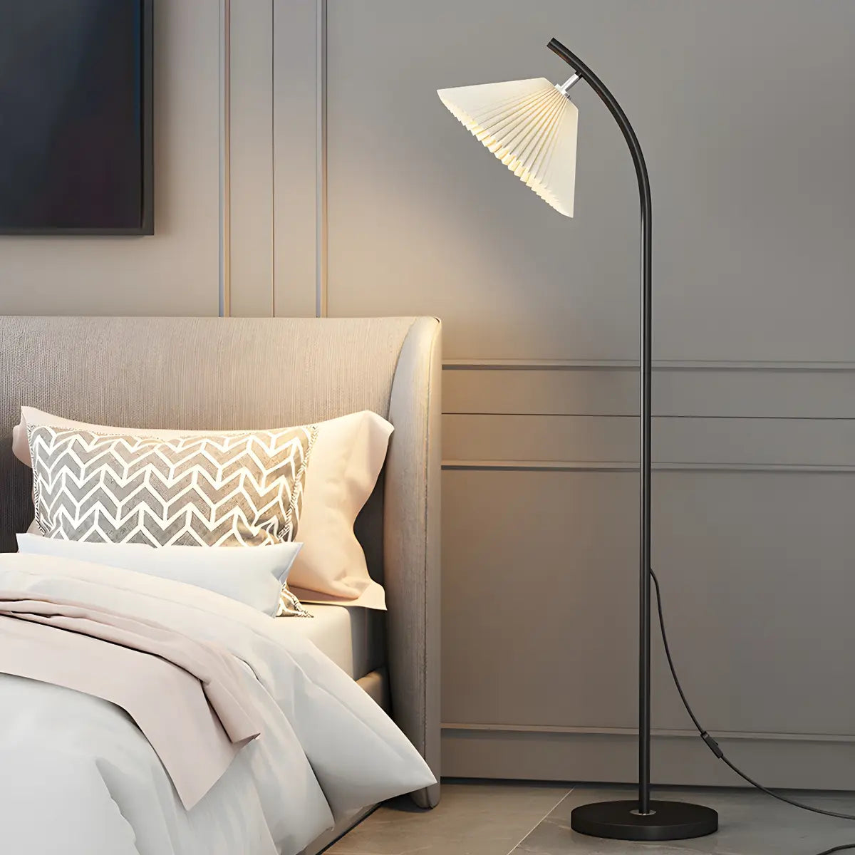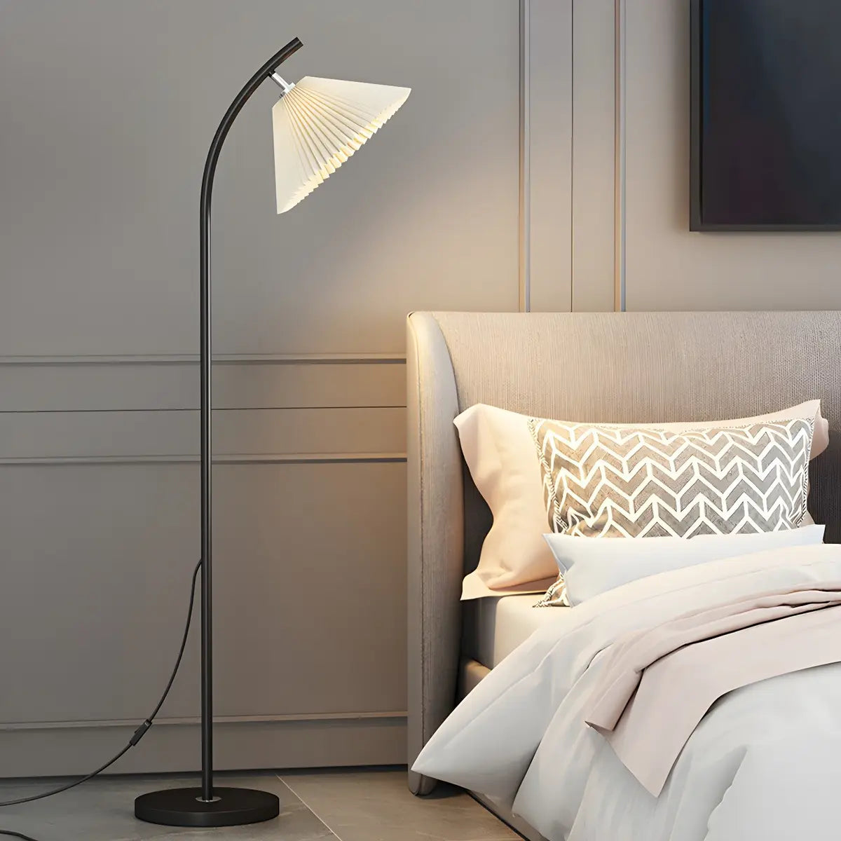 This modern floor lamp offers decorative and quality lighting, perfect for creating ambience in a bedroom or living room.