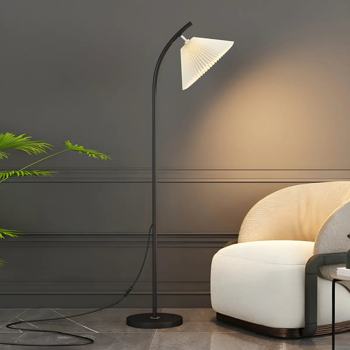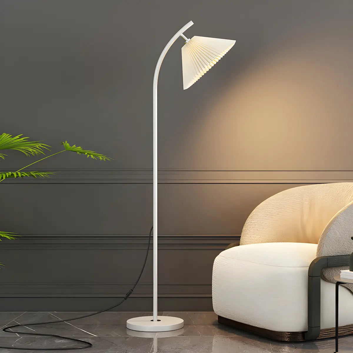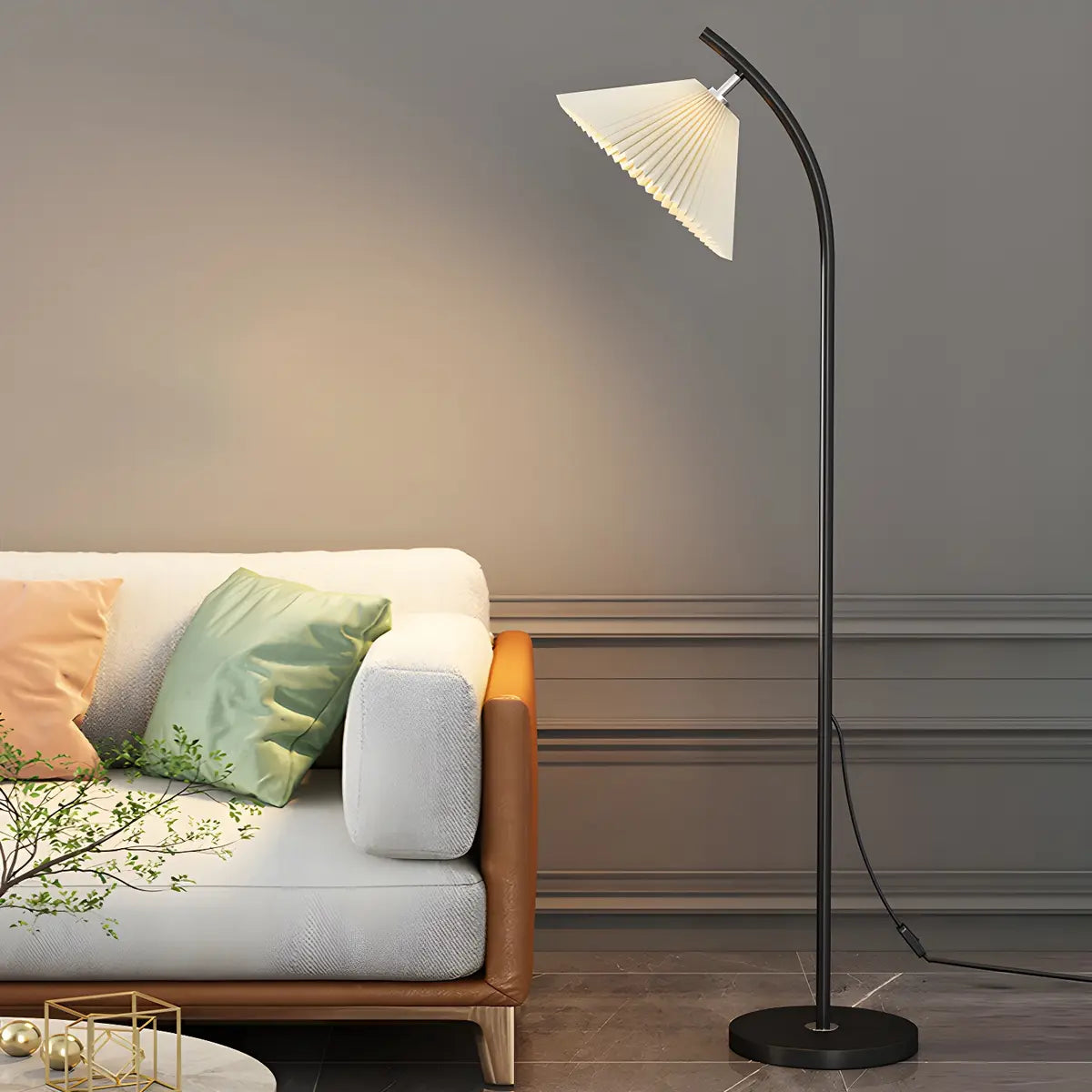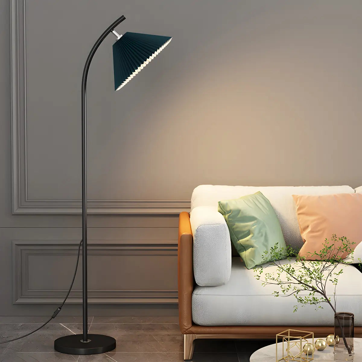 This modern floor lamp offers decorative and quality lighting, perfect for creating ambience in a bedroom or living room.