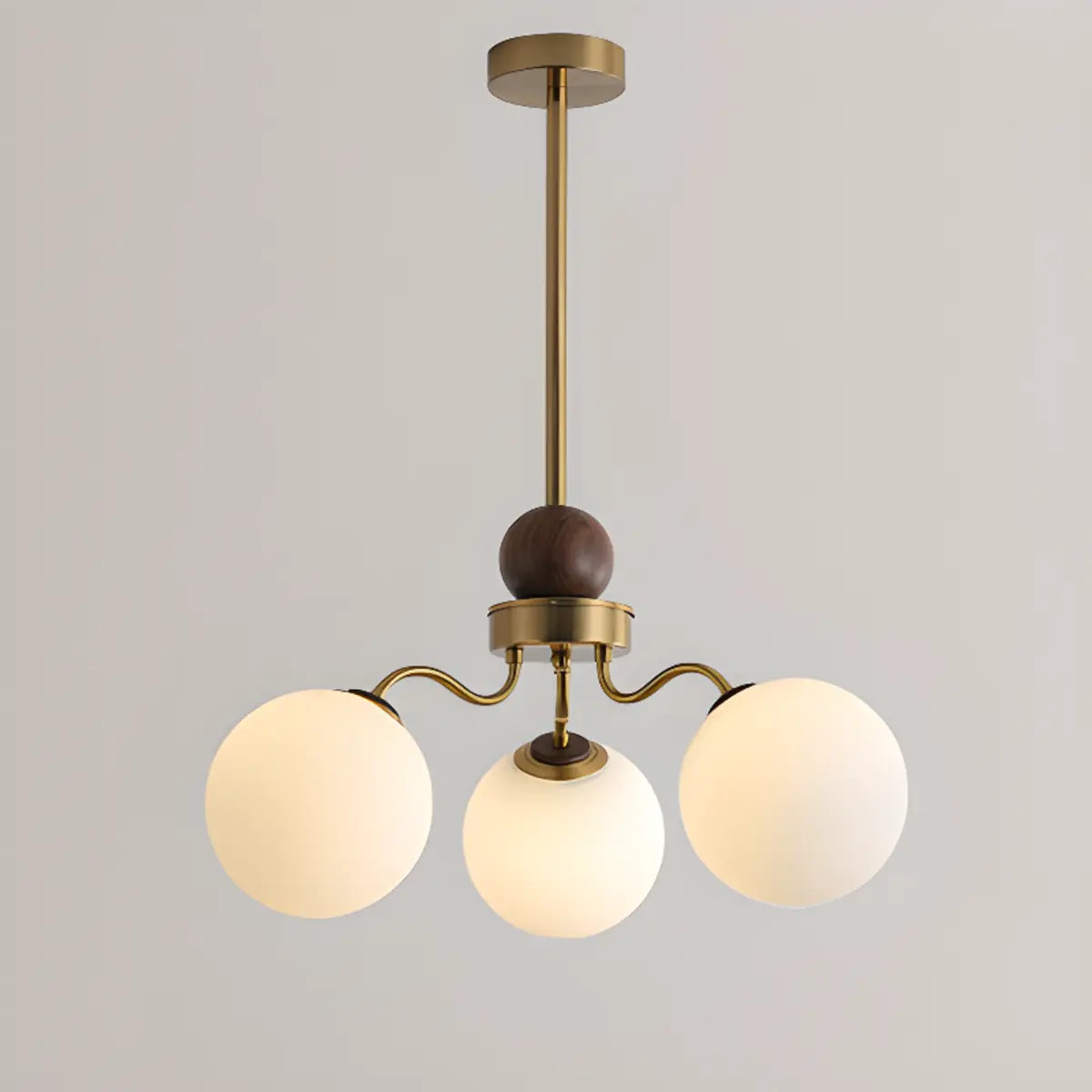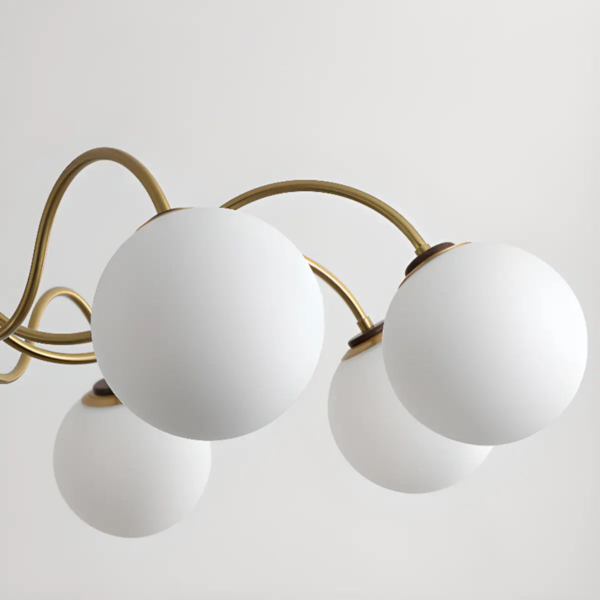 This coppery curved arm white glass ball chandelier features an elegant copper curved arm design with a white glass globe, adding a unique and stylish touch to your living room. This chandelier is the perfect combination of modern and classic elements, giving your space a charming glow.