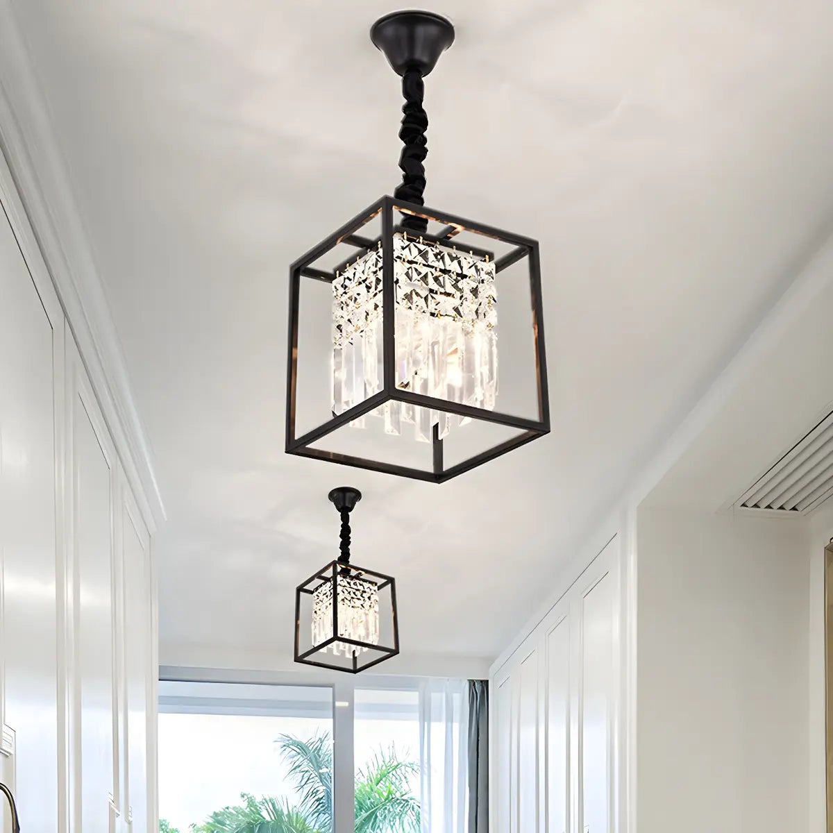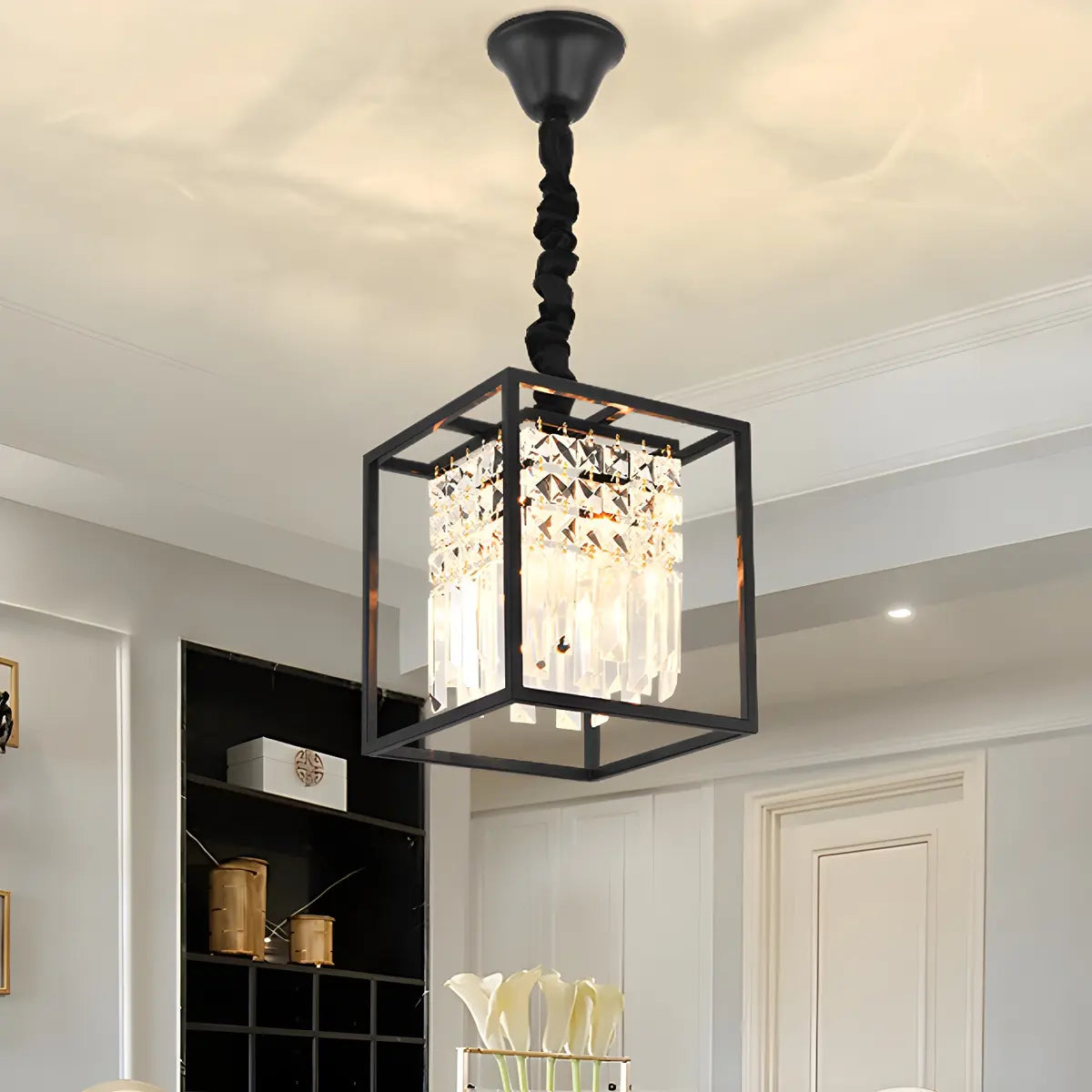 This stylish and simple crystal chandelier combines modern and classic styles, showing a low-key and luxurious temperament. The streamlined cubic design, with a black metal frame and built-in dazzling crystal decoration, highlights a unique geometric beauty.