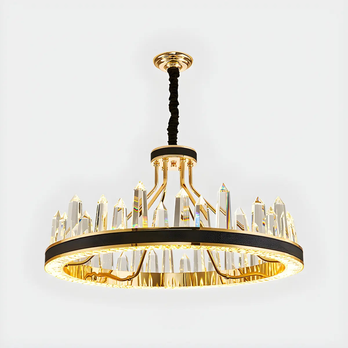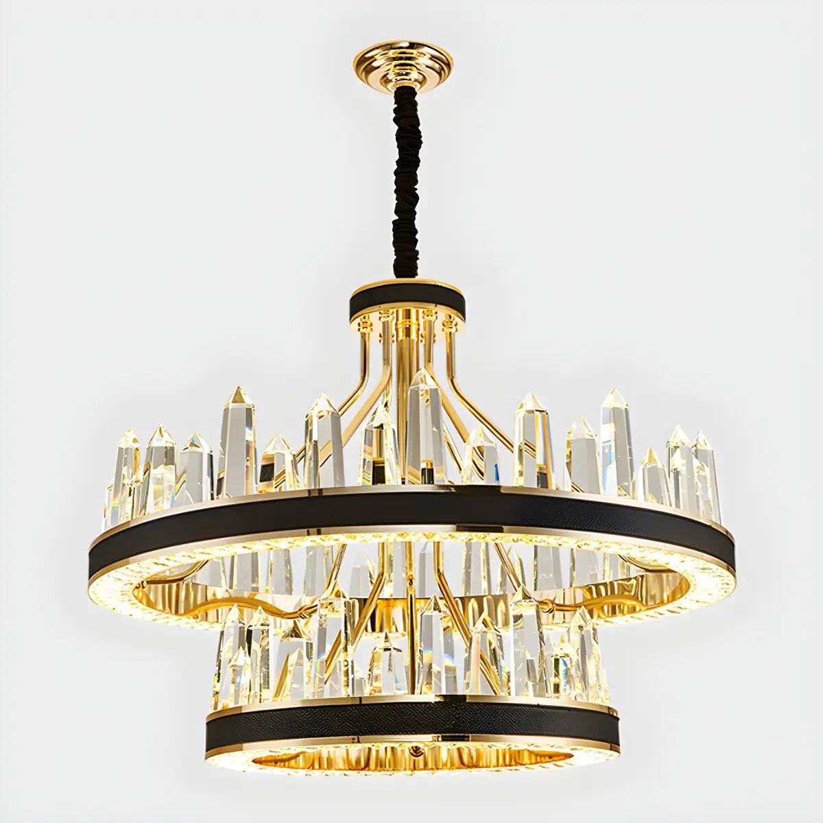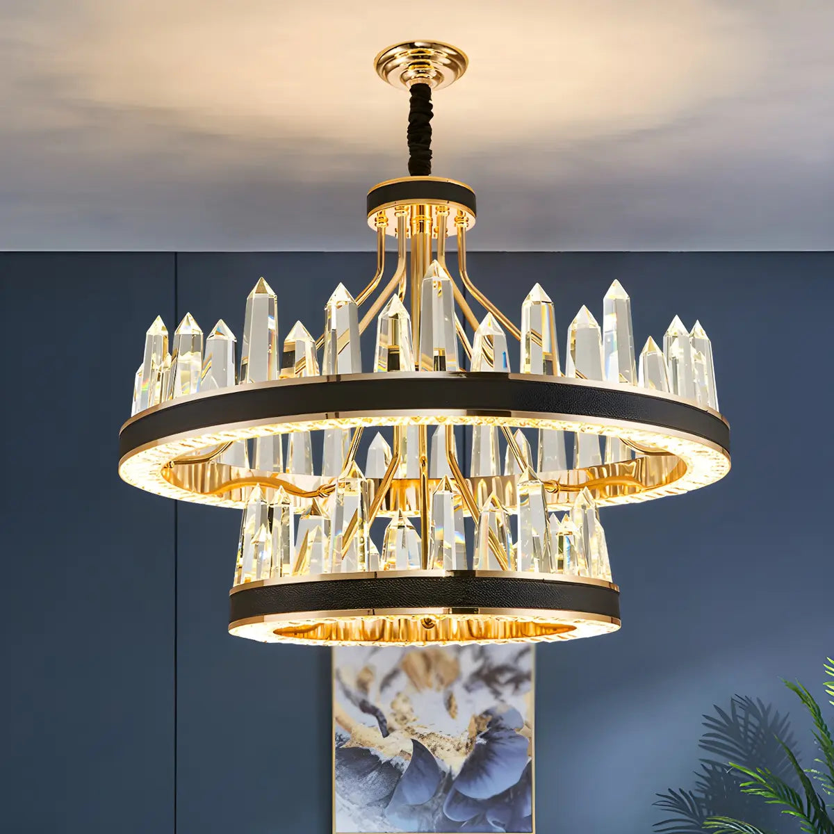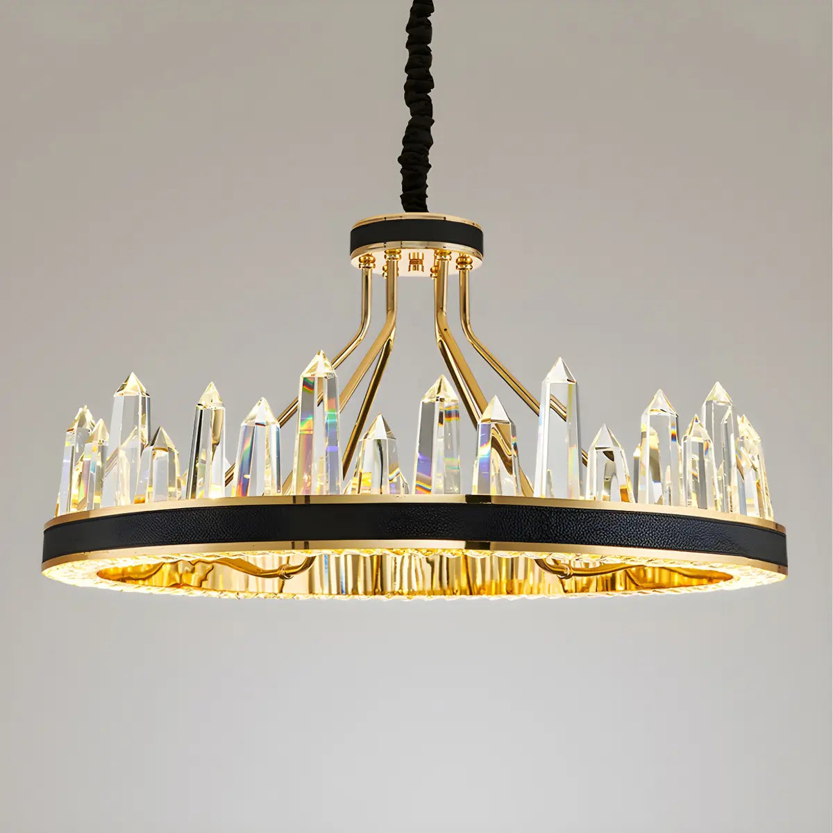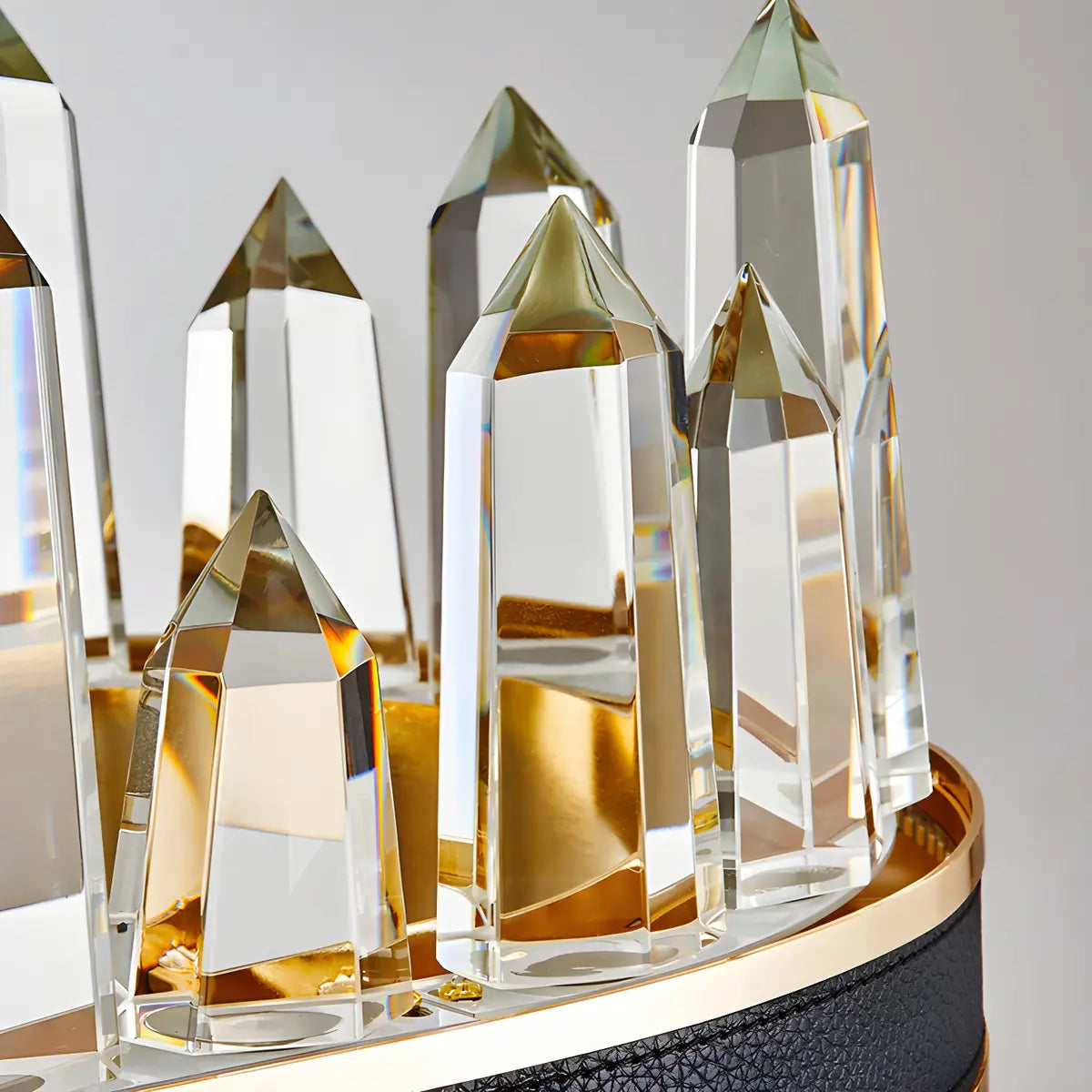 This ZOWALA geometric crystal chandelier perfectly combines modernity and luxury. Based on a unique geometric design, it adopts the classic color scheme of gold and black, and is surrounded by transparent crystals, giving the space an unparalleled sense of elegance.