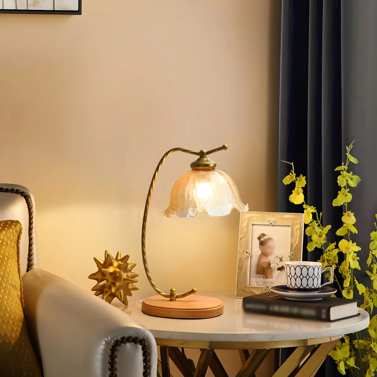 This bedside lamp is beautiful and elegant, combining a modern floral design with a golden lamp body, adding a touch of elegance to your home.