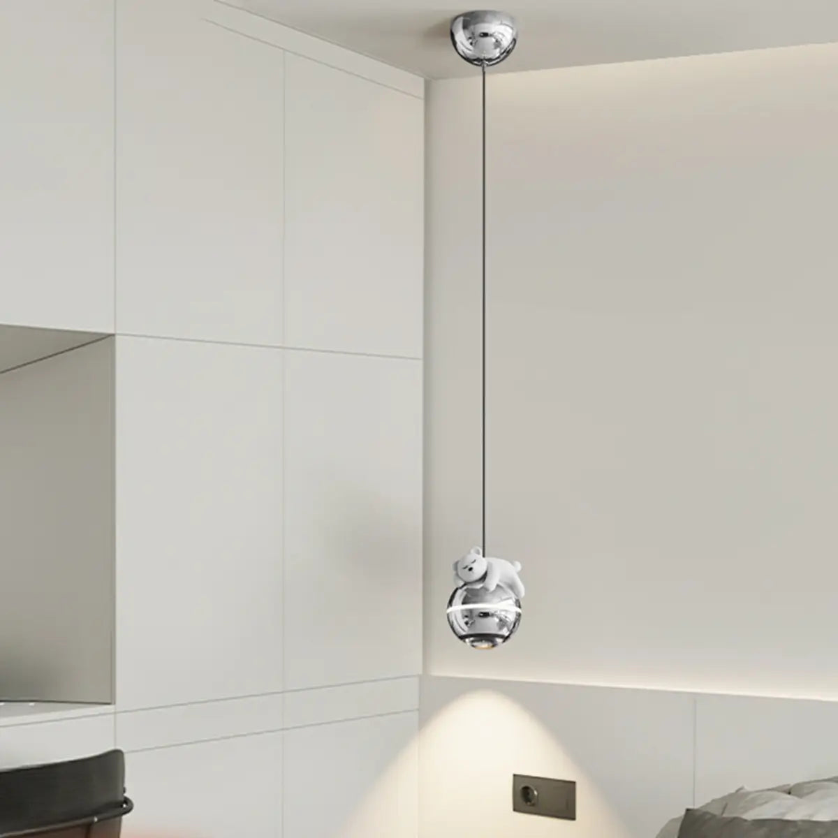 This chandelier adds a sense of fun and fashion to the room with its unique cute bear shape and sleek chrome sphere lampshade. It combines childishness with modern design, suitable for the lively atmosphere of the children's room, becoming a visual focus and decorative highlight.