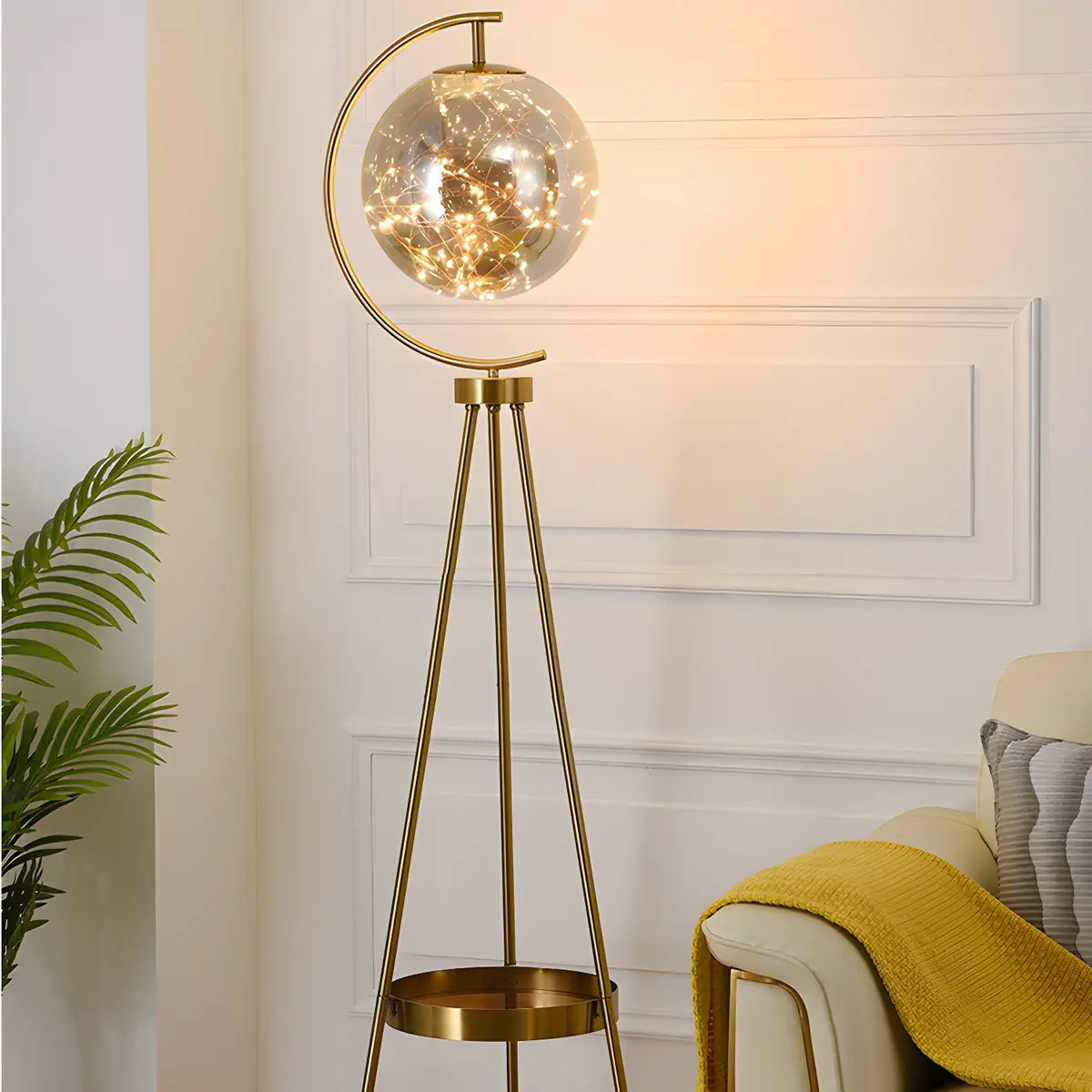 This modern gold floor lamp, with its unique design combining metal and glass, is the perfect decoration for living rooms and bedrooms.