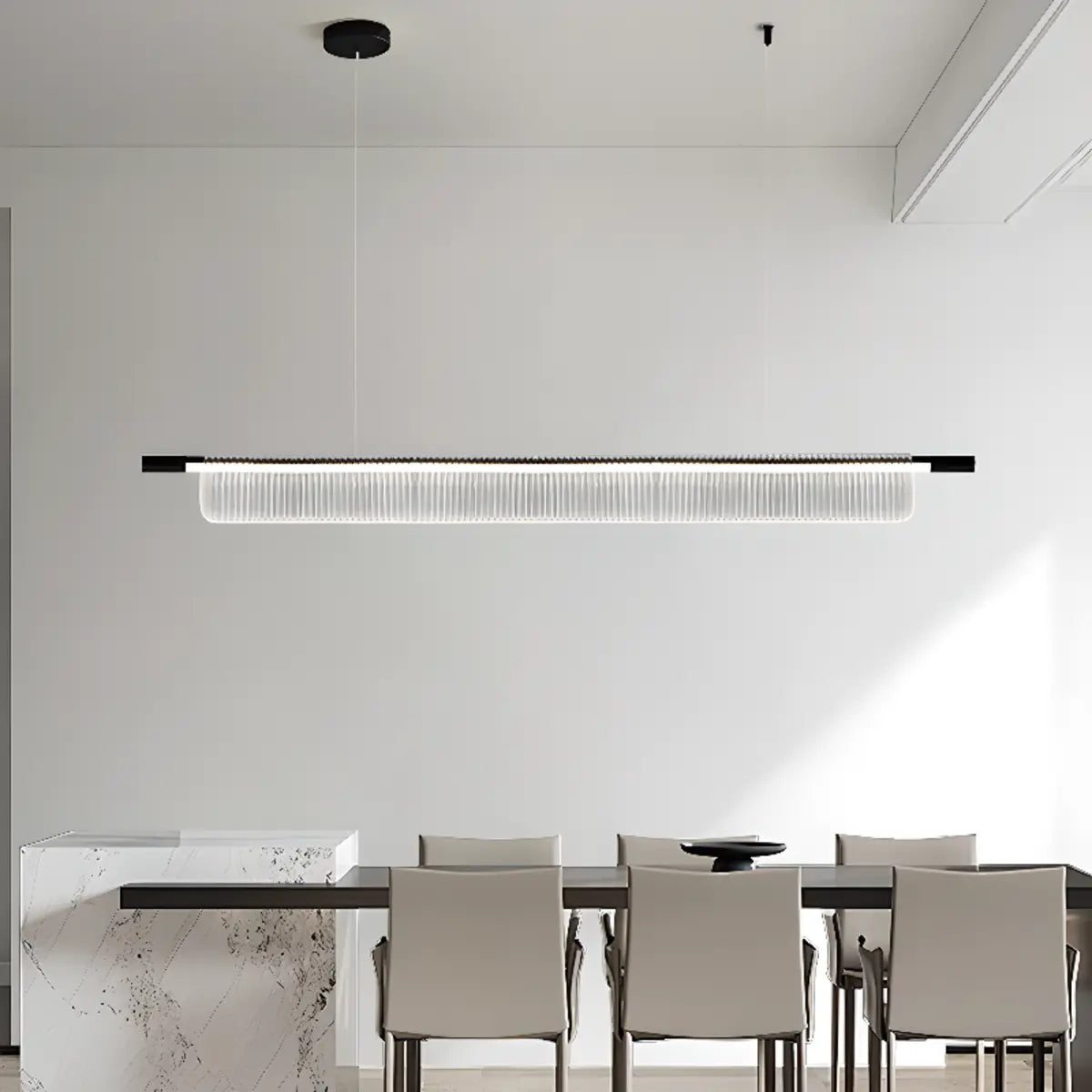 This modern metal kitchen island pendant light is the perfect complement to your home decor with its simple yet sophisticated design. Its sleek rectangular look and acrylic shade bring a fresh, modern feel to any space.