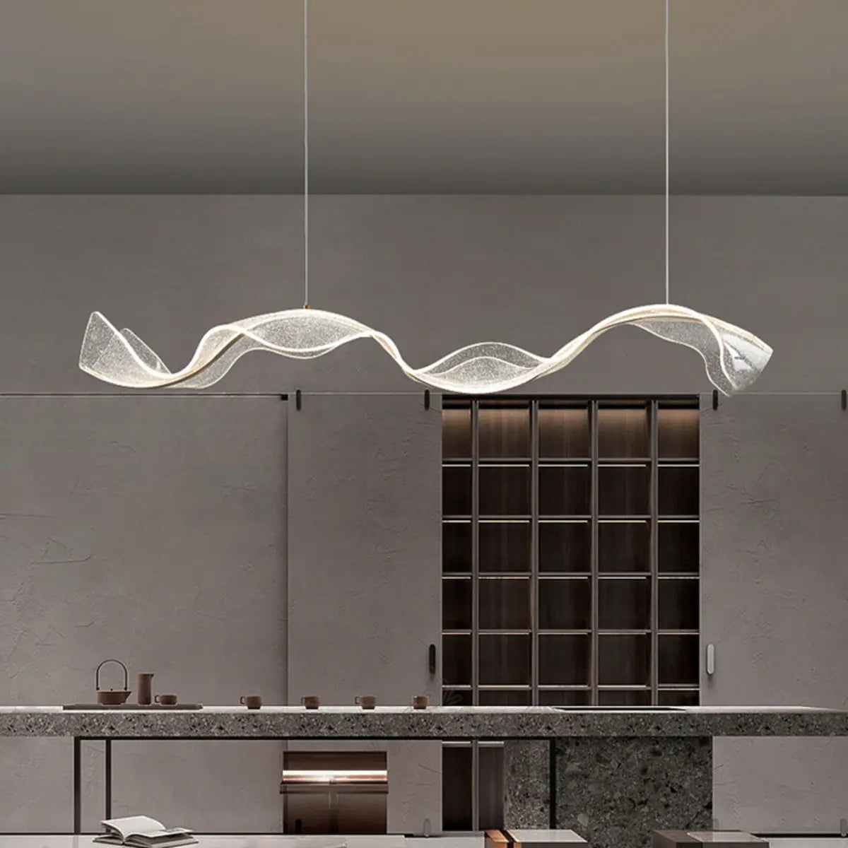 This chandelier appears in the modern kitchen with its unique golden wavy design. The metal material exudes a noble and elegant temperament. Its smooth lines bring a flowing beauty visually and become the artistic focus of the space.