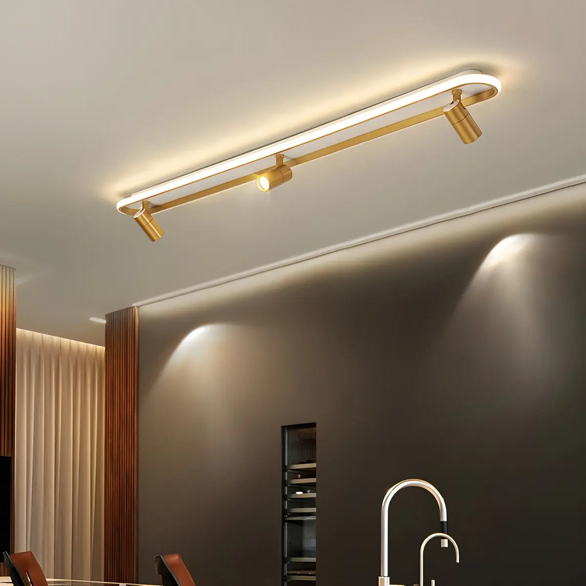 This golden linear semi-recessed chandelier outlines a very modern space atmosphere with its simple and smooth design. Its simple shape combined with soft light perfectly showcases the beauty of contemporary art and enhances the home style.