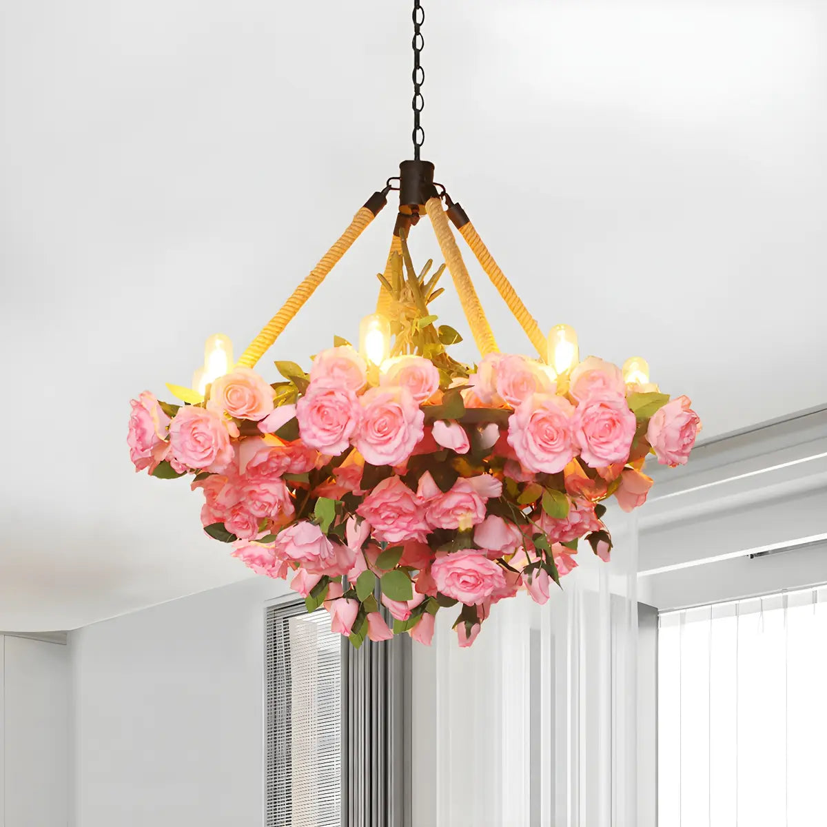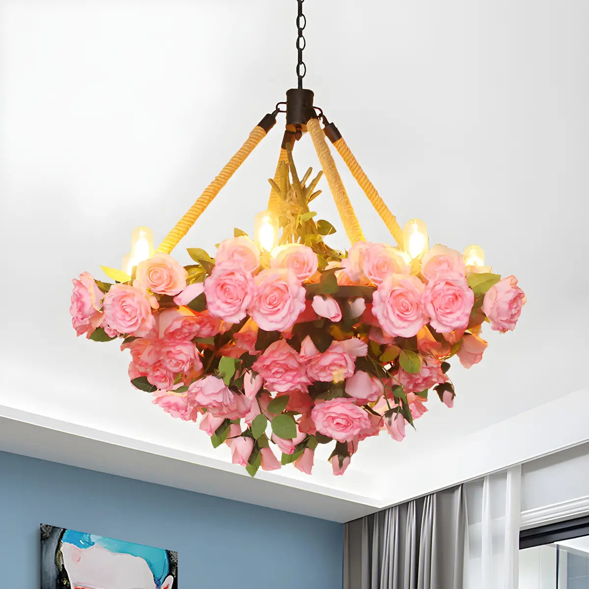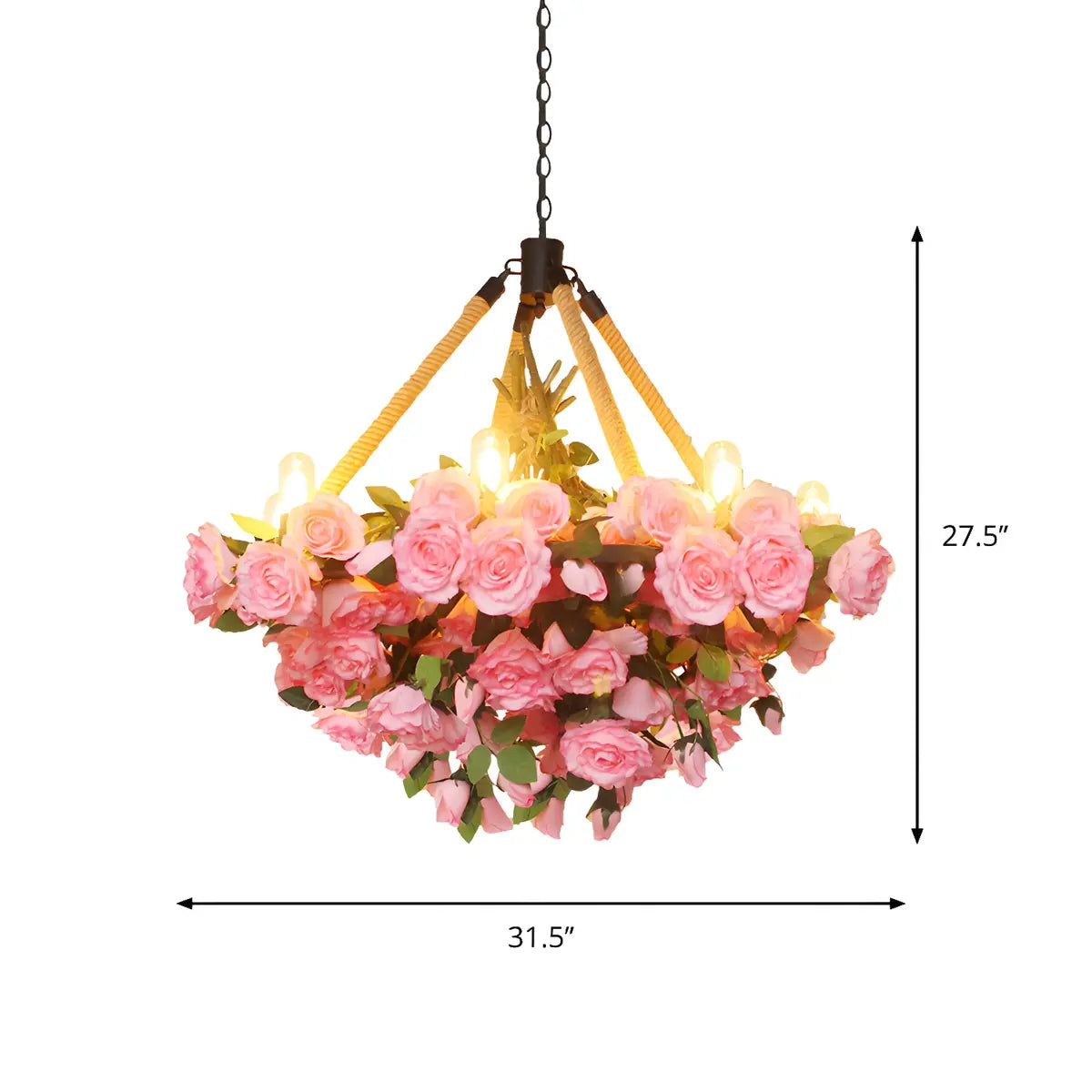 - Made of metal and rope, this chandelier exudes a sturdy and natural beauty. The bright floral decoration adds vitality to the product, which is suitable for large spaces such as living rooms, dining rooms or open kitchens.