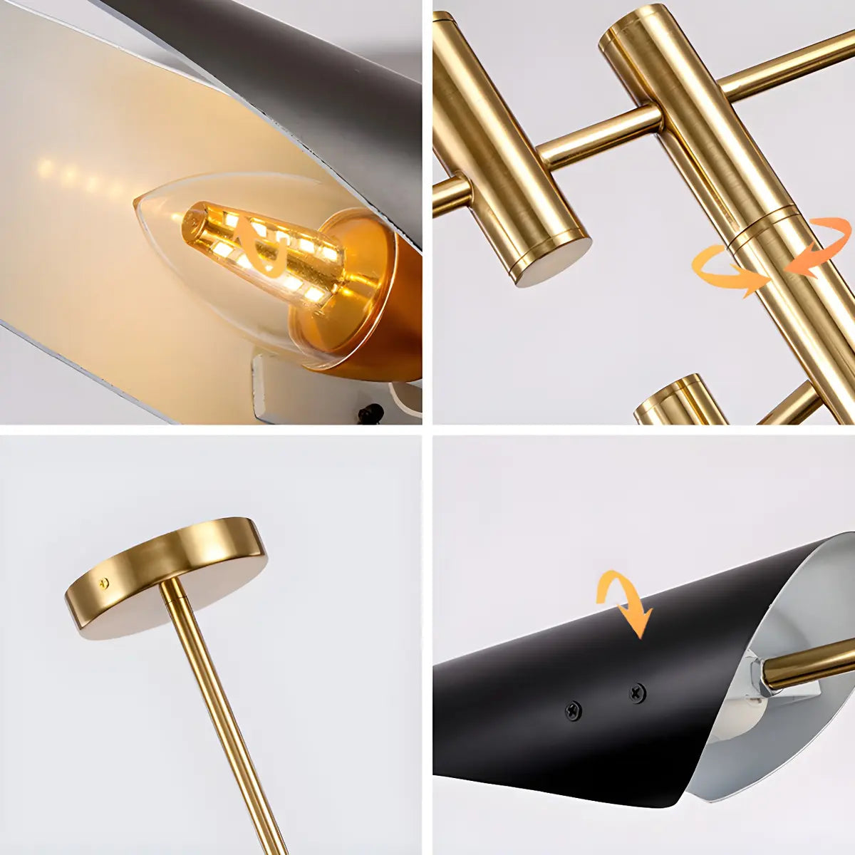 This chandelier has a unique geometric rocket shape design, combining modern industrial style with retro elements, showing personality and fashion. The main body is composed of multiple metal rods, showing dynamic radial lines, with black and brushed metal appearance, exuding a low-key luxury atmosphere.