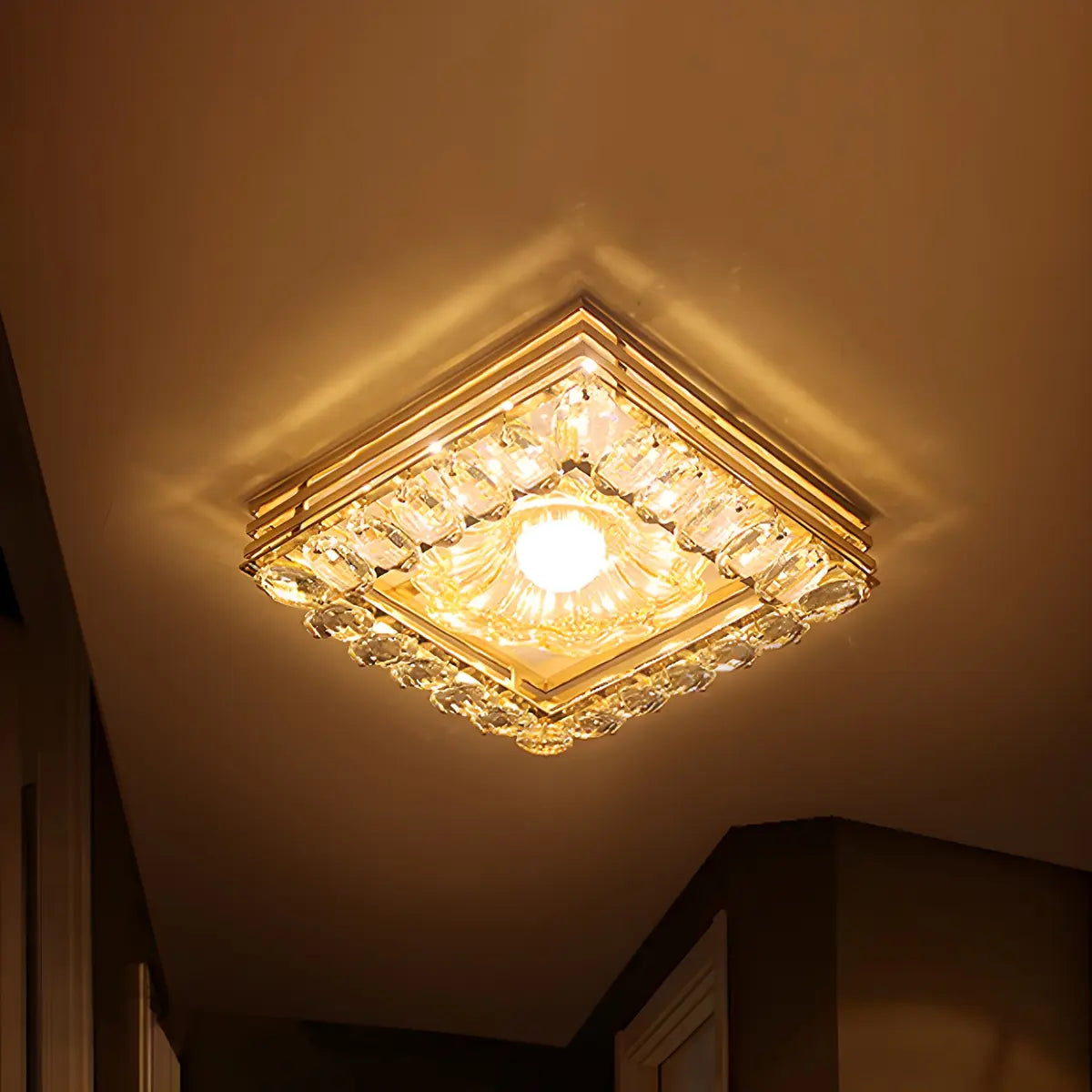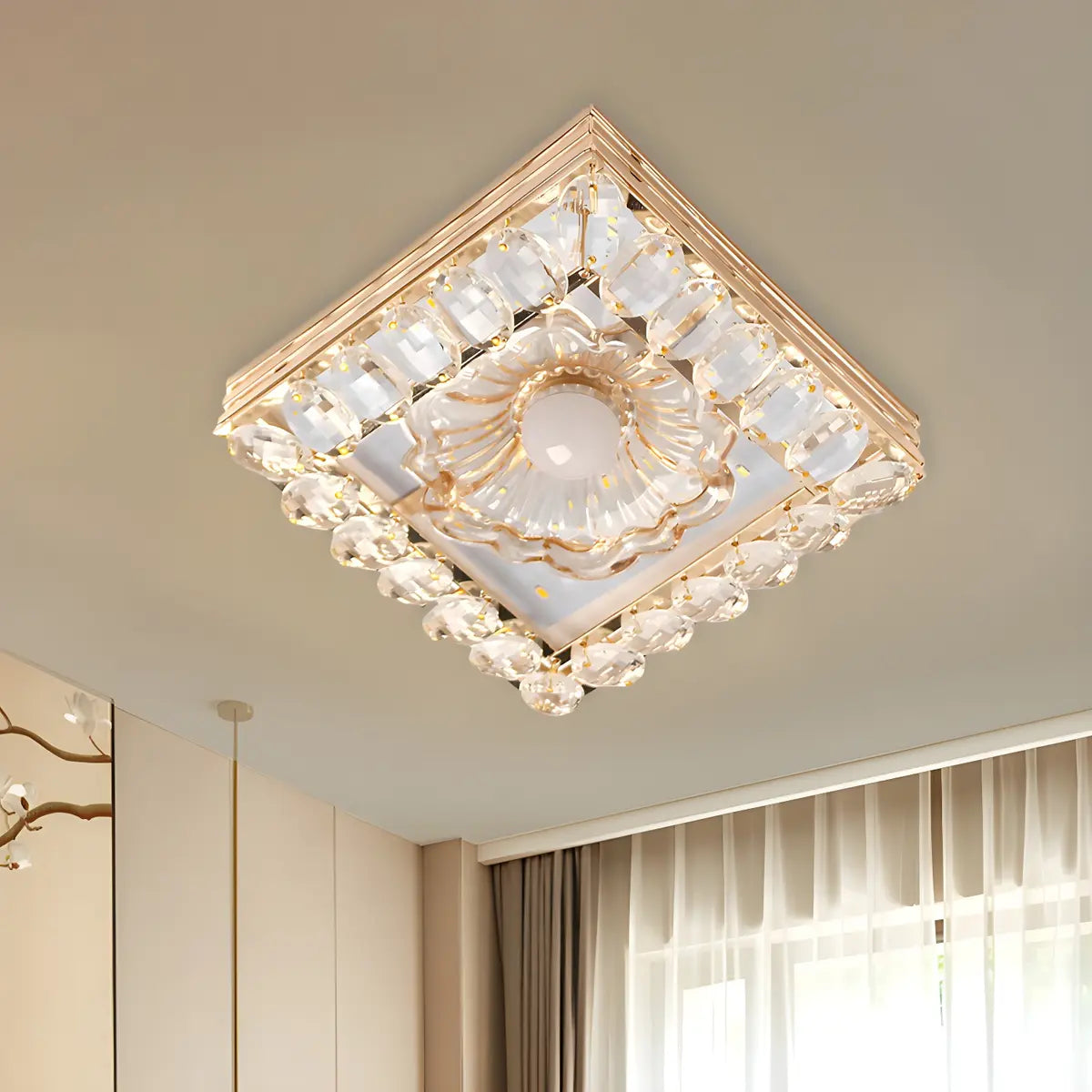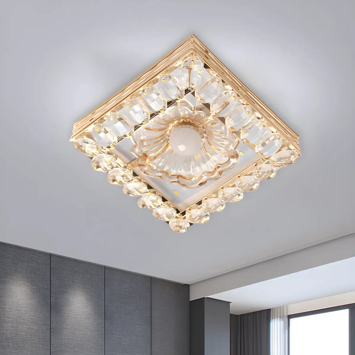 This golden crystal round ceiling lamp is like a blooming flower. The crystal clear crystal emits brilliant light and hangs above the ceiling, just like the bright stars in the night sky. It perfectly combines modernity and luxury, adding unparalleled artistic beauty to your room and becoming an eye-catching decorative center.