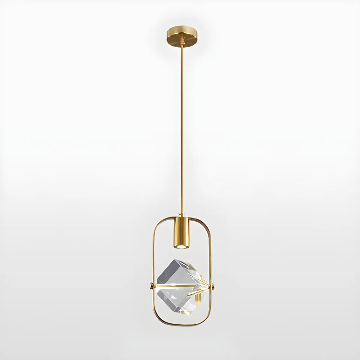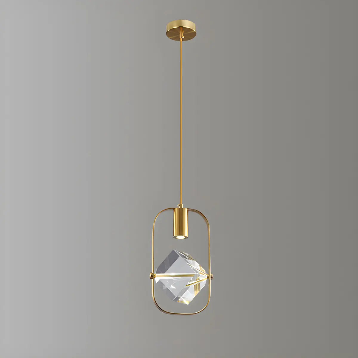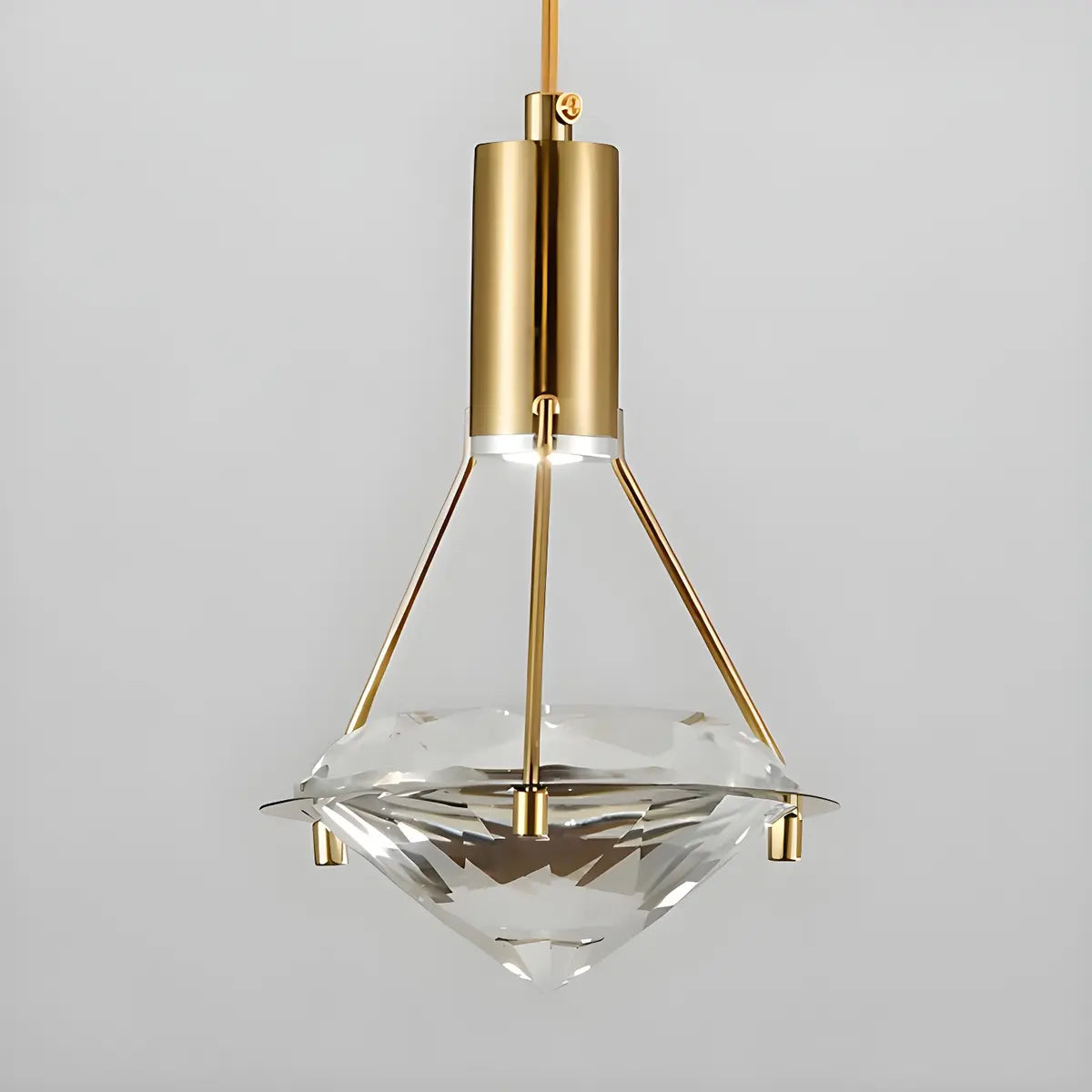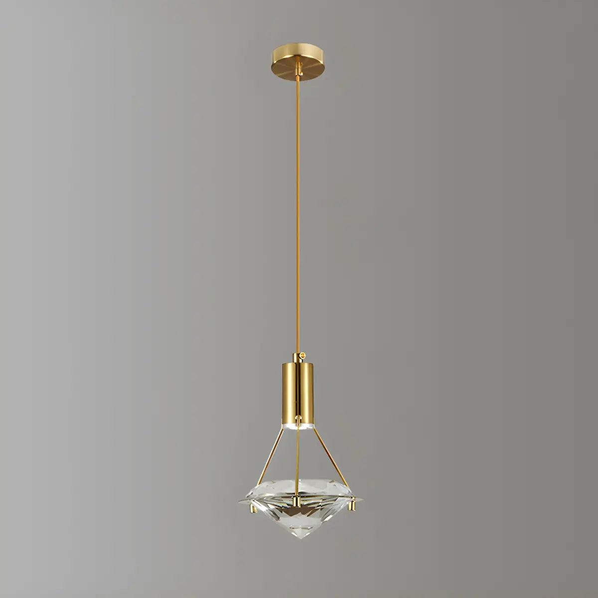 Exuding a contemporary aesthetic, this pendant lamp is crafted in gold metal to elegantly blend into any modern space. The geometric shape of the lampshade shines like a hollow diamond, filling the room with soft natural light, creating a warm and stylish atmosphere.