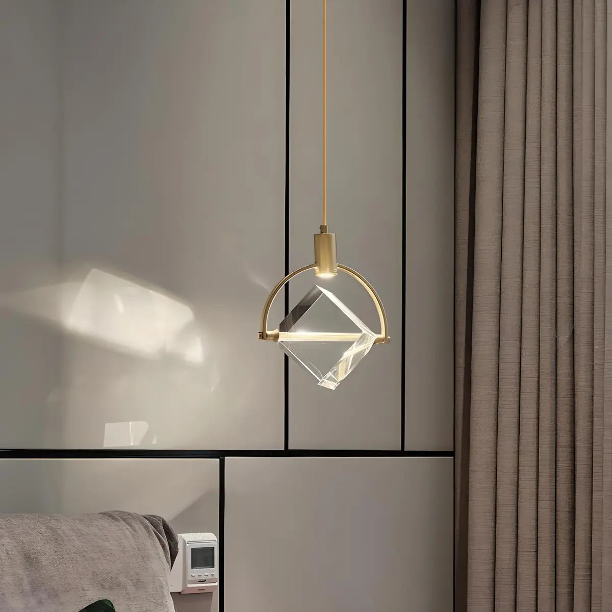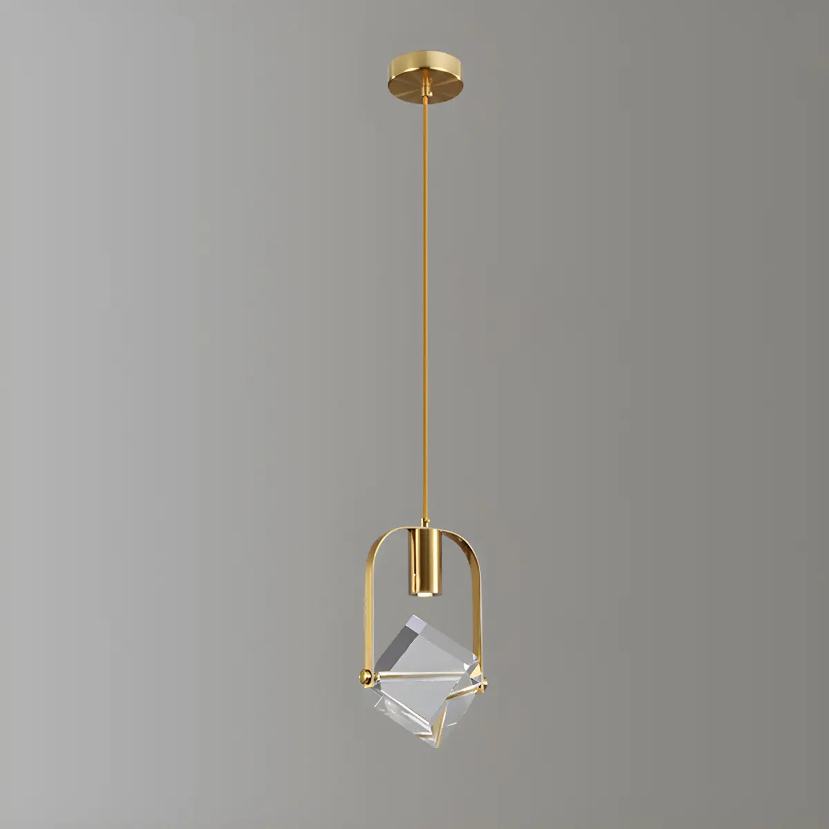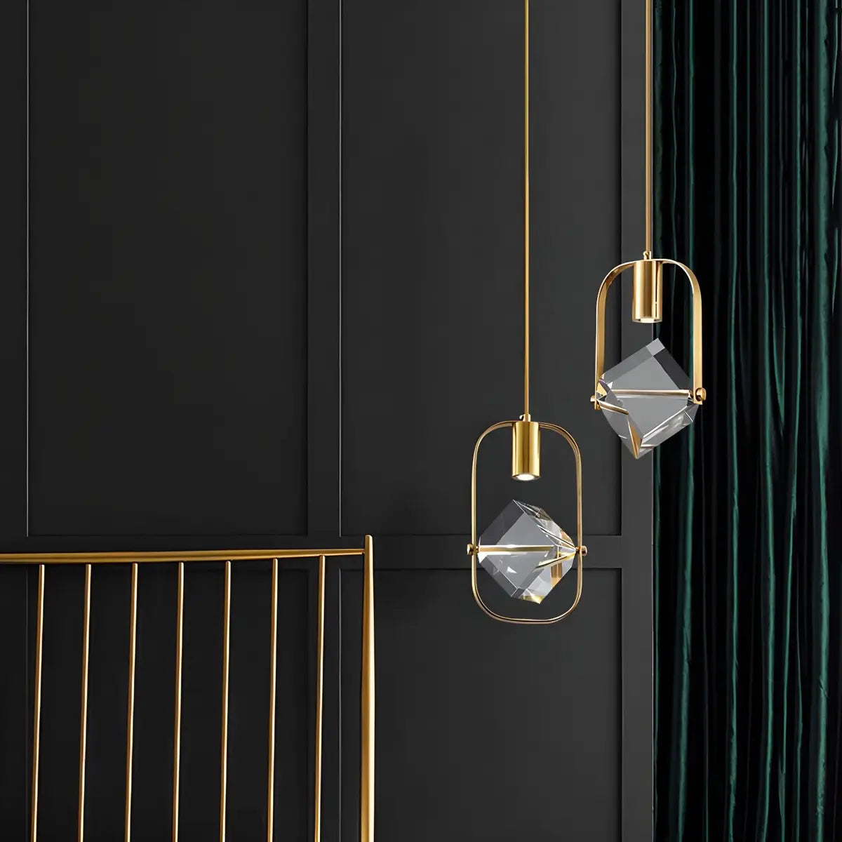 Exuding a contemporary aesthetic, this pendant lamp is crafted in gold metal to elegantly blend into any modern space. The geometric shape of the lampshade shines like a hollow diamond, filling the room with soft natural light, creating a warm and stylish atmosphere.