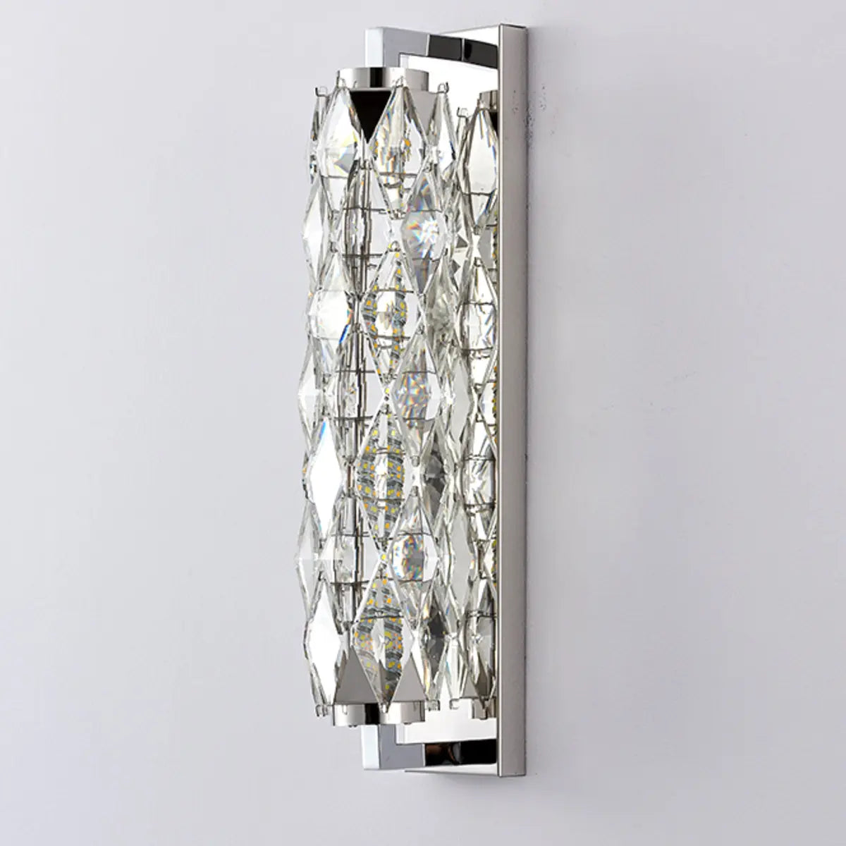This wall light features a modern geometric design with beautiful crystals for an added touch of luxury and style.