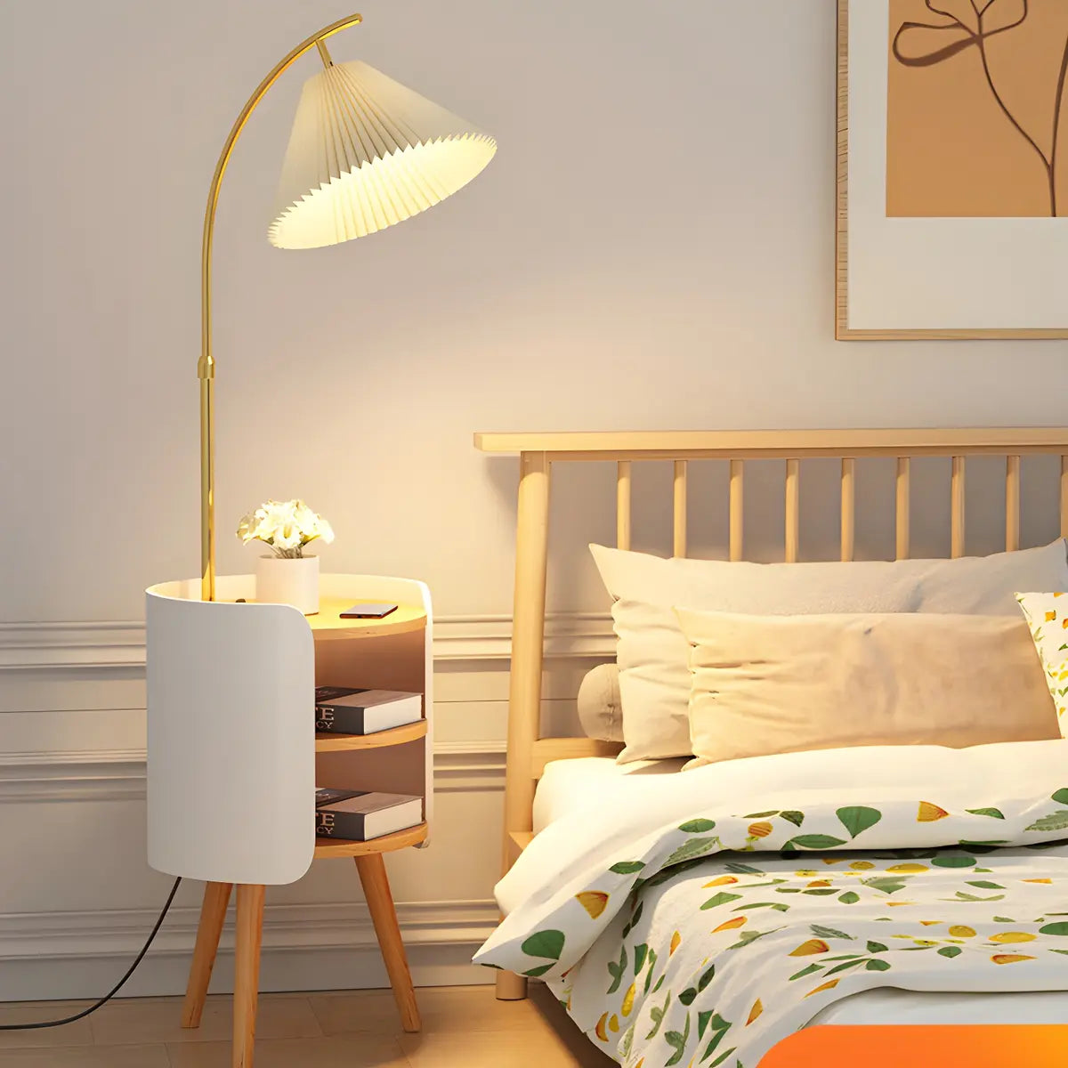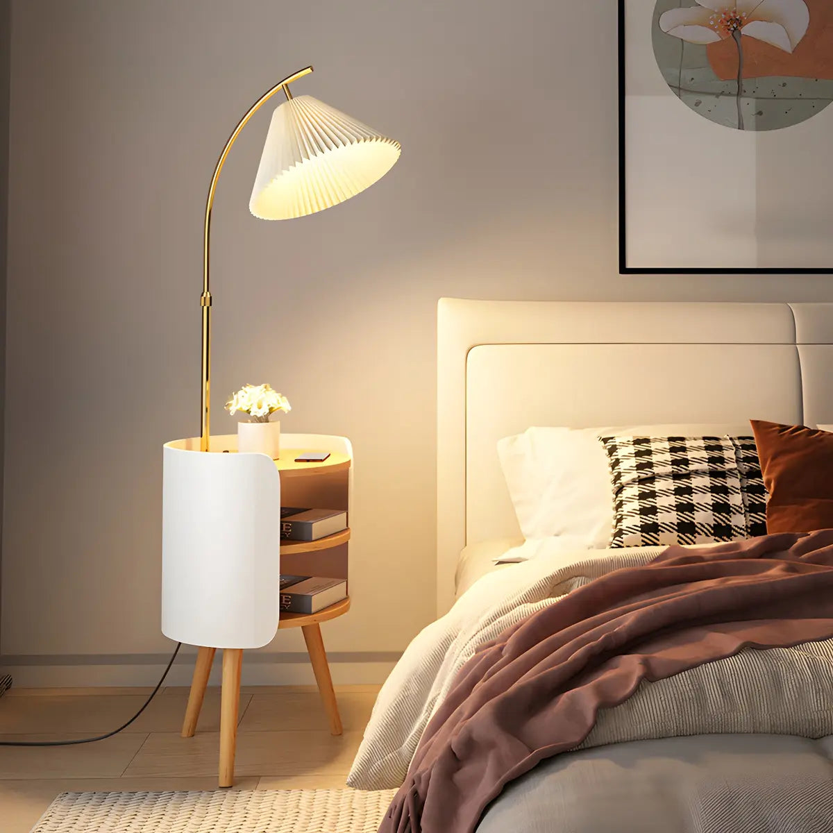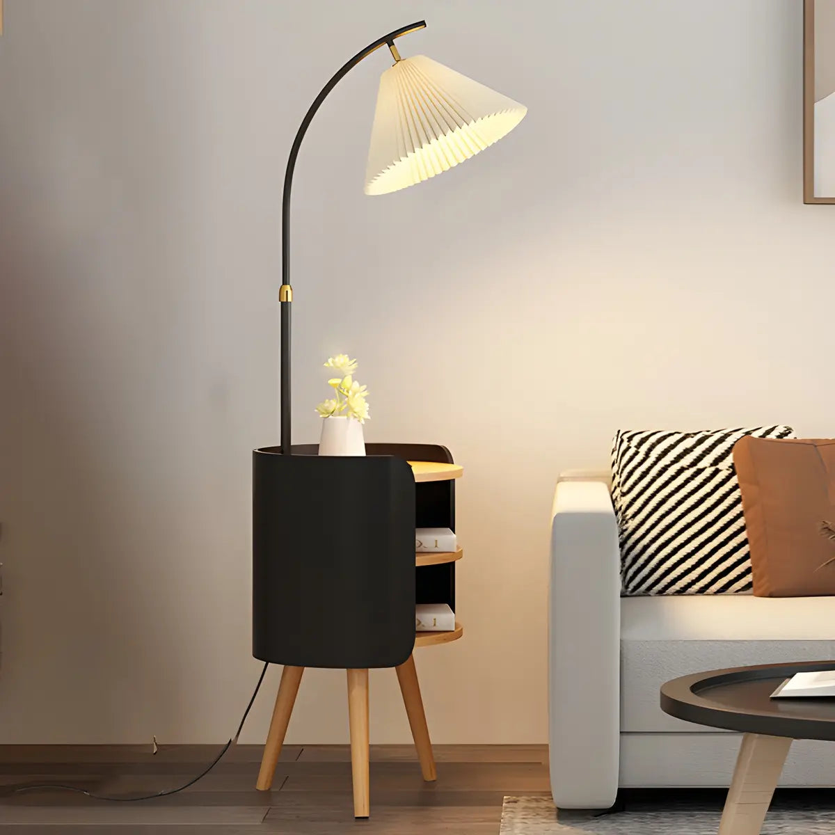 This modern floor lamp combines practicality with stylish design and is perfect for decorative lighting in the bedroom or living room.