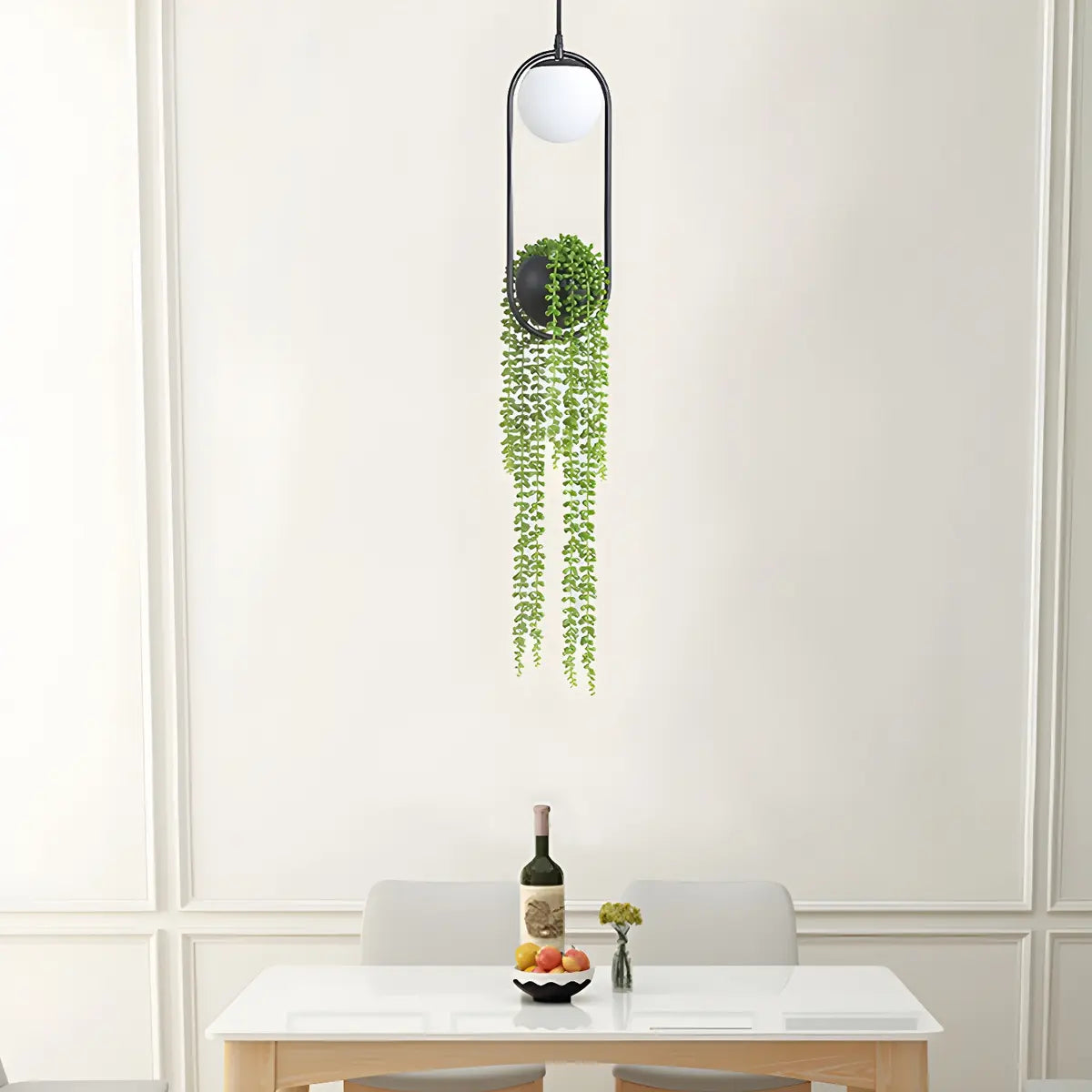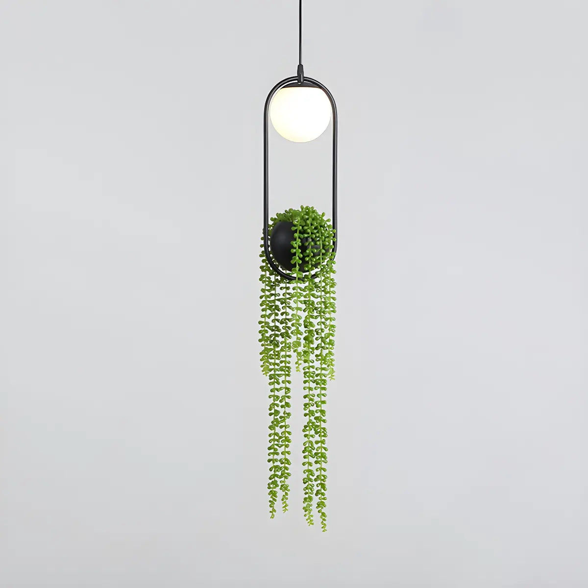 This unique pendant light perfectly combines greenery with illumination, creating a home atmosphere that balances nature and modernity. The black metal frame and minimalist spherical bulb design make it suitable for living rooms and bedrooms, as well as a decorative piece for balconies or gardens, enhancing the spatial depth. The plant elements infuse vitality into the home, bringing a comfortable natural ambiance.