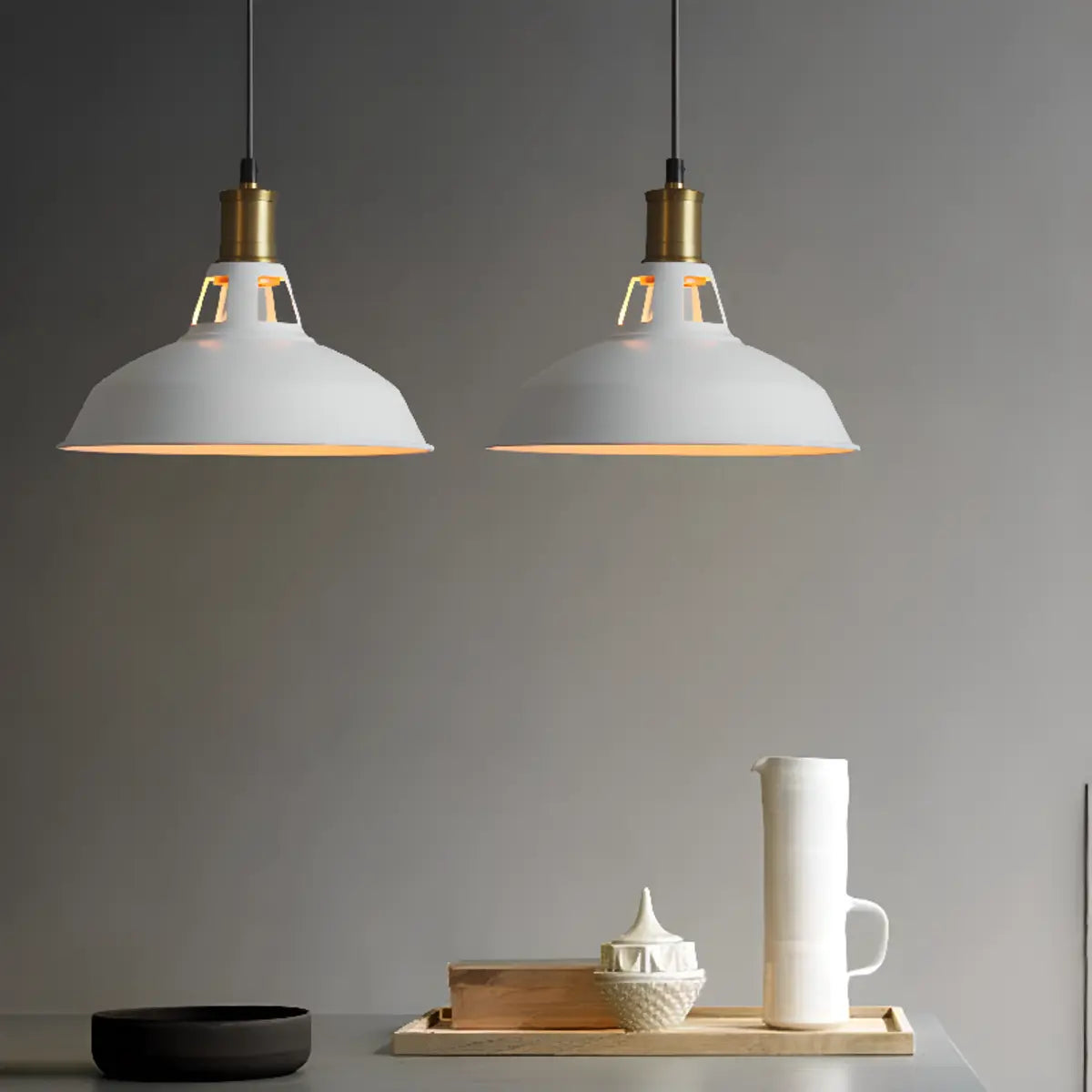 This minimalist pendant light features a pure white metal dome design that blends industrial style with modern aesthetics. It is a focal point above any kitchen or dining area, enhancing the overall visual level of the space with its unique shape and texture.