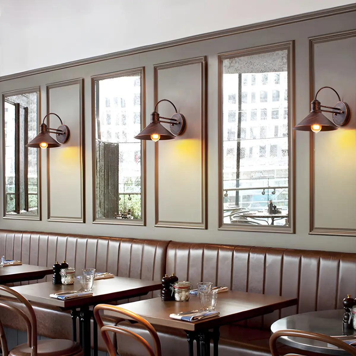 This wall lamp features an industrial-style conical design and black iron shade, perfect for modern minimalist or industrial-style outdoor spaces. Its exterior design focuses on geometric shapes and exquisite craftsmanship details, adding visual appeal.