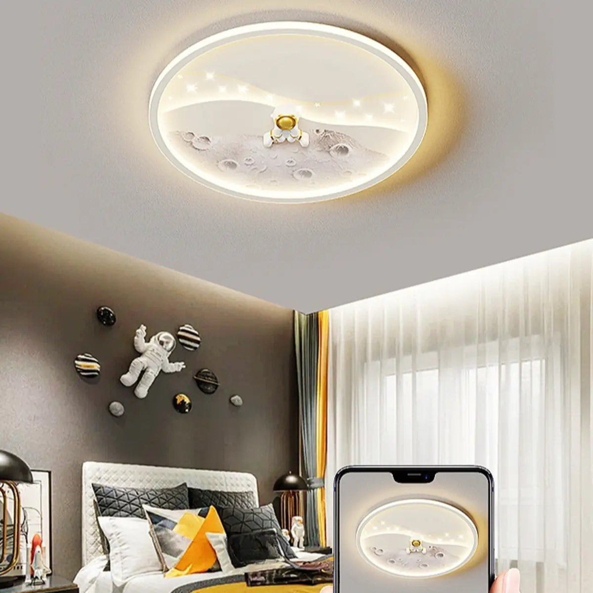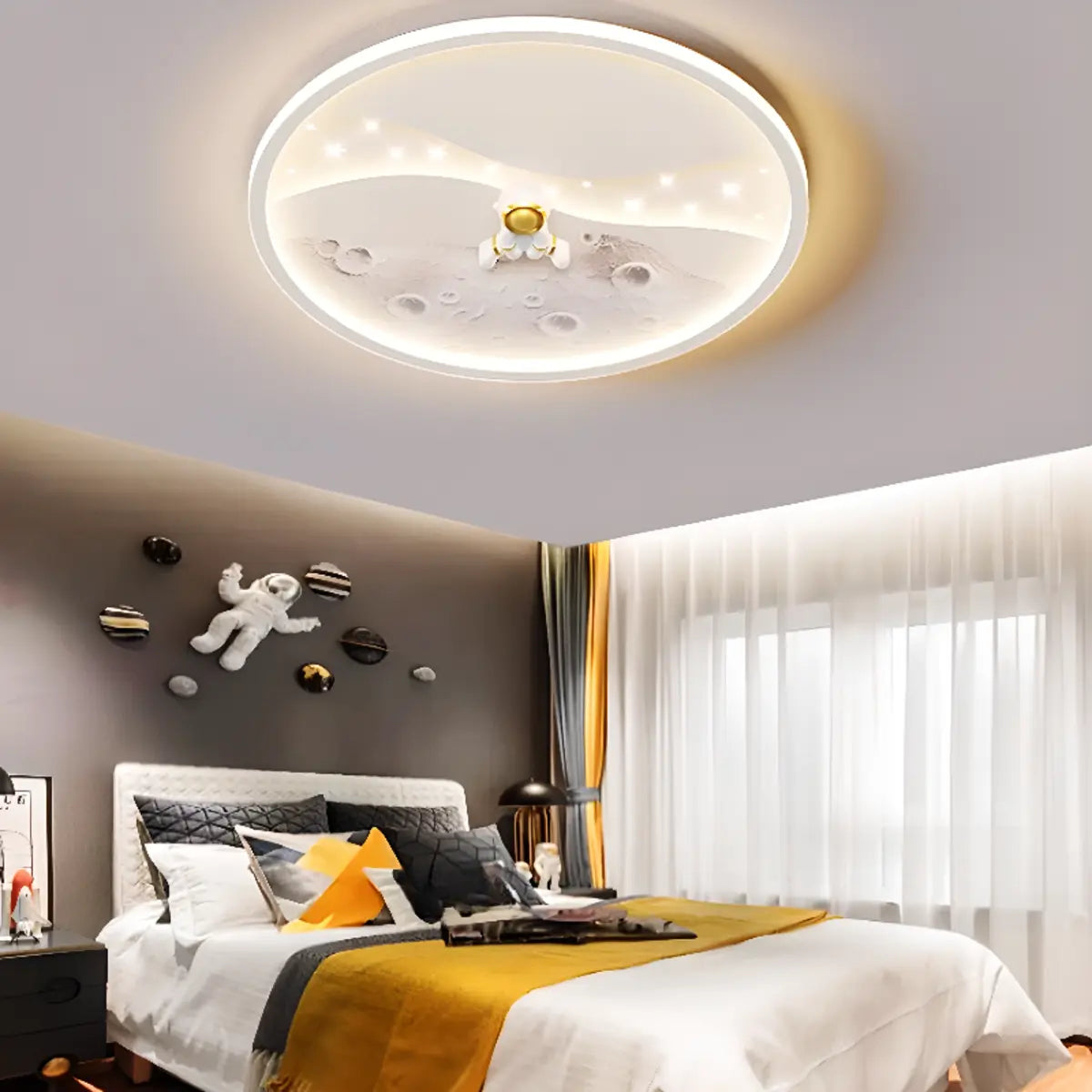 The design of this semi-recessed ceiling lamp is inspired by the universe. The astronaut pattern in the center of the lamp seems to float in the starry sky, bringing a dreamlike visual enjoyment. The white lampshade surrounds it as soft as moonlight, light yet stylish, perfectly blending modern and futuristic styles, adding infinite reverie to the room.