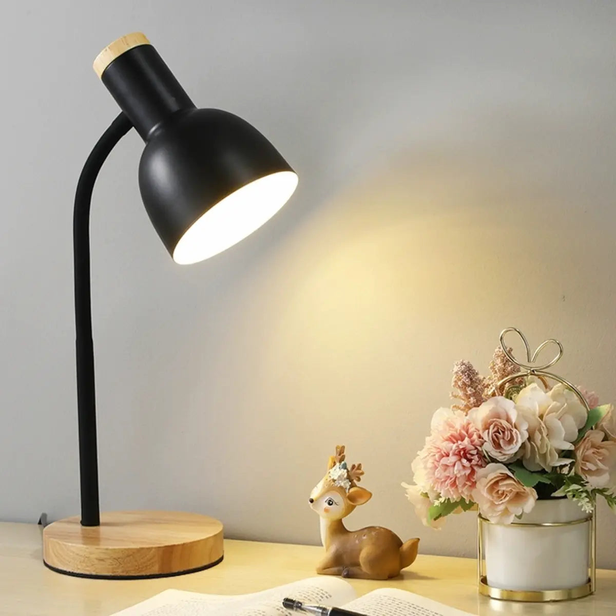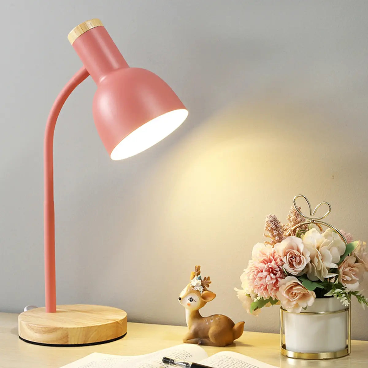 This table lamp perfectly combines modern design and exquisite craftsmanship, adding an elegant charm to your interior space. The exquisite pink metal lampshade and solid wood base show a fashionable and simple style, suitable for placing at the bedside of the bedroom or on the side table of the living room.