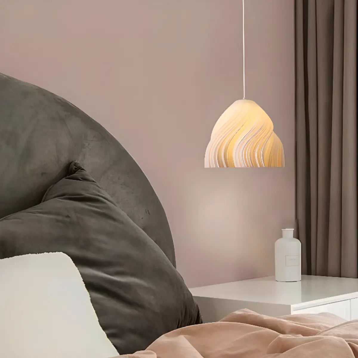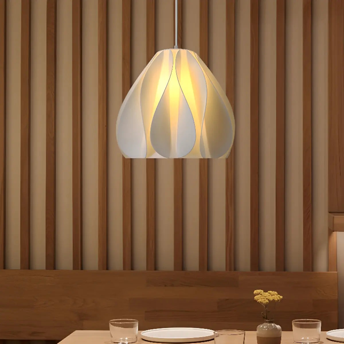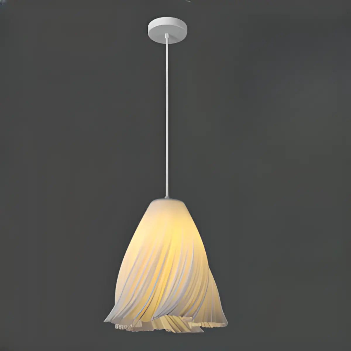 Characterized by its elegant geometric shape and soft white hue, this pendant lamp blends perfectly into modern interiors. Its beautifully designed lampshade adds an artistic, sculptural aesthetic to any space, providing more than just lighting; it is also an important part of home decor.
