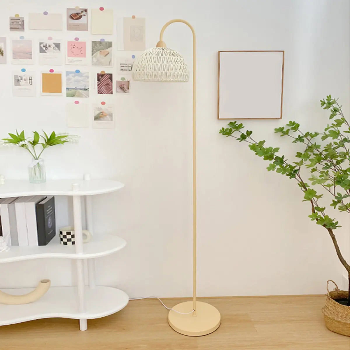 This modern floor lamp features an elegant rattan shade and an arched shape that provides soft, even lighting that is both practical and decorative.