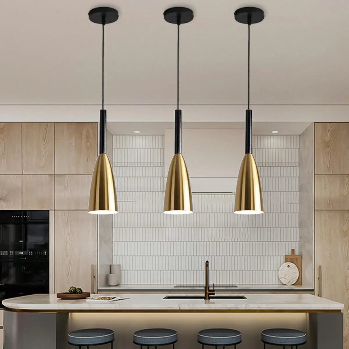 This pendant light shows the ultimate fashion and elegance with its modern and simple conical design. The golden lampshade is matched with black wood to create a visual effect of luxury and calmness, perfectly enhancing the overall beauty of the kitchen.