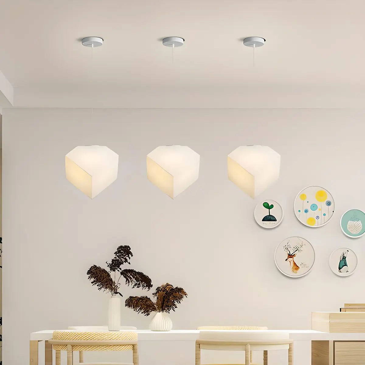 This ZOWALA modern white geometric chandelier, with its simple yet sophisticated design, adds an elegant aesthetic charm to your kitchen. The lampshade is made of plastic, presenting a warm and soft light that blends perfectly with any decorative style. Its unique geometric shape design not only enhances the three-dimensional sense of space, but also becomes a highlight in interior decoration.