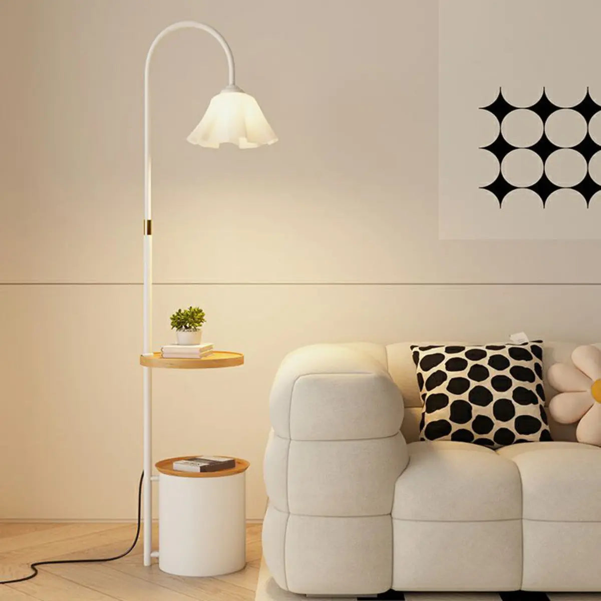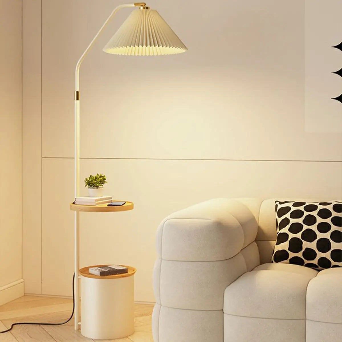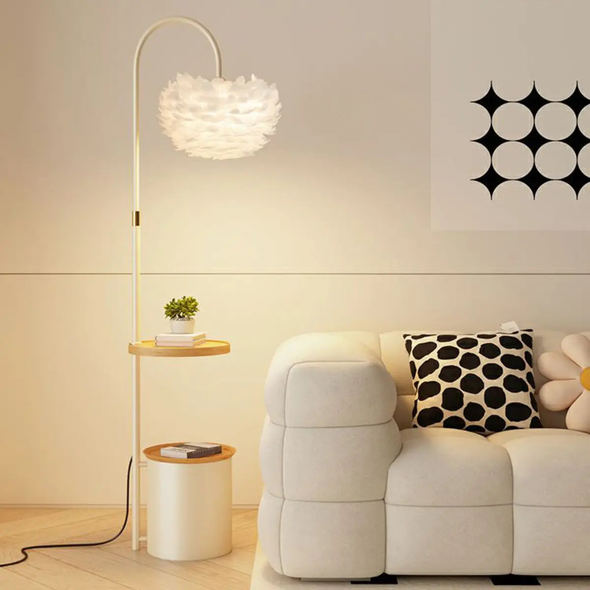 This modern metal floor lamp not only provides elegant lighting but also has a practical storage shelf design. It is suitable for placement in bedrooms, living rooms, and other spaces to enhance the overall decorativeness and practicality.
